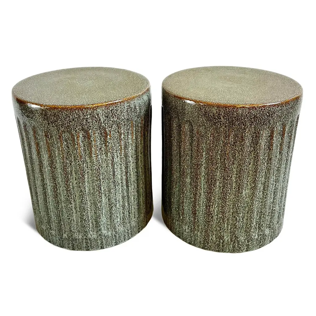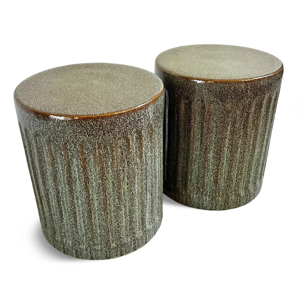 Ceramic green garden stool with fluted design and brown speckles. Great for use outdoors for unique extra seating or side table. Beautiful hand crafted and hand painted porcelain in family workshops still using a time-honored technique and skills only passed down through the family. High fire porcelain makes it waterproof. It also allows for more vivid and unique colors. Produced in small quantities in the small town of Jingdezhen specializing in porcelain for many generations. Each may vary due to hand painted and inherent ceramic qualities. Each is sold individually.
