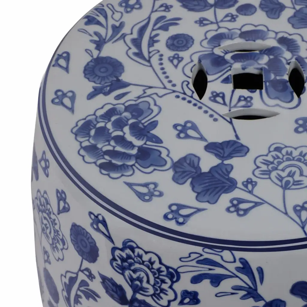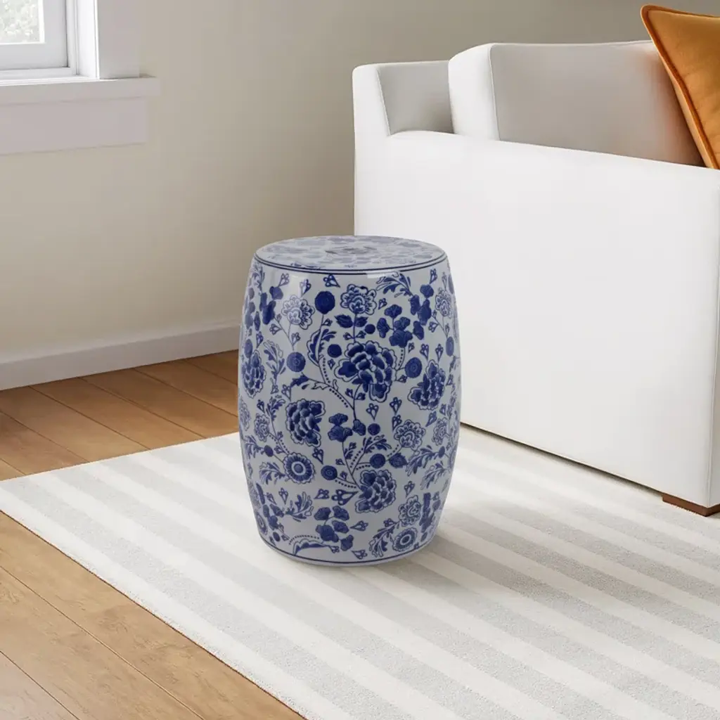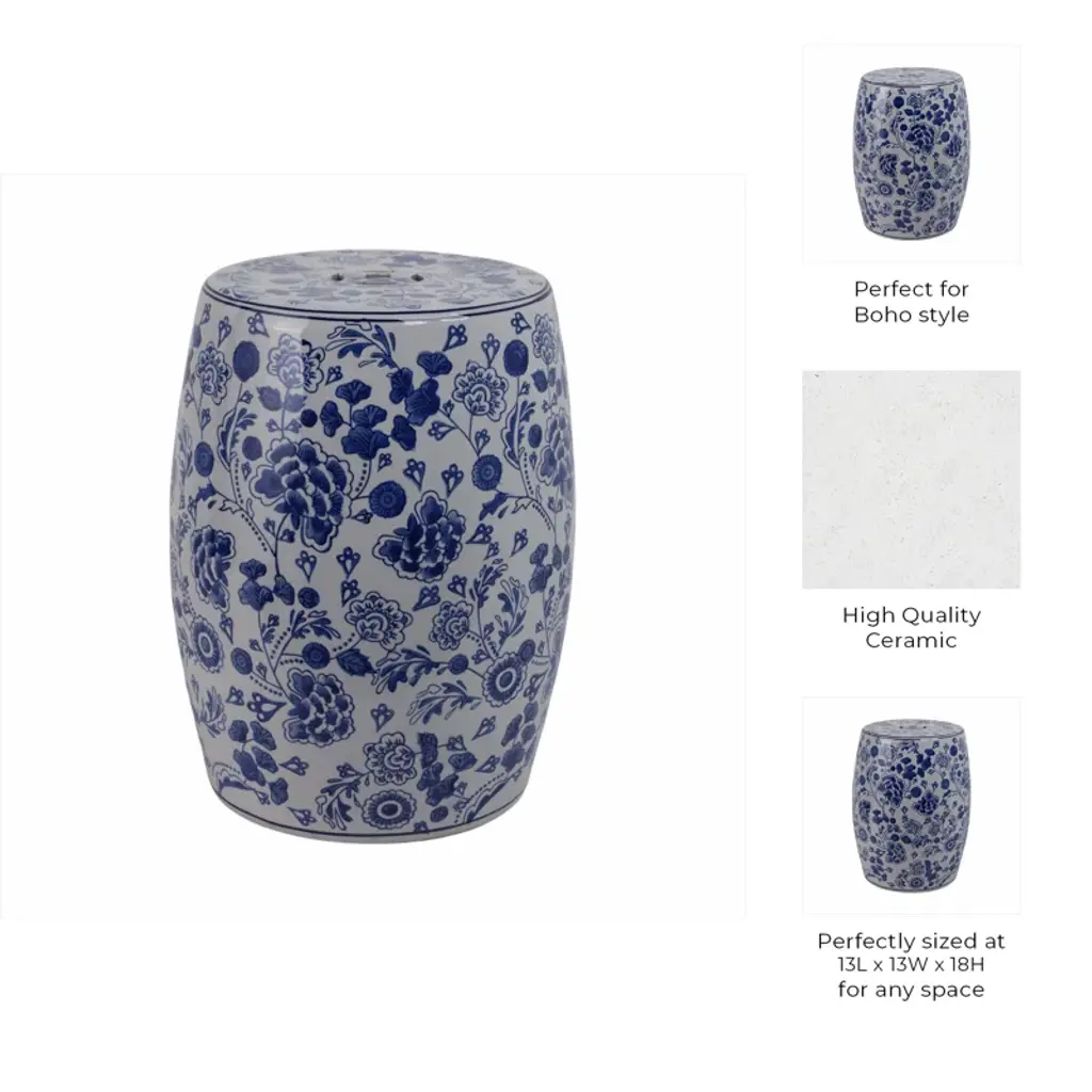 This 18'' accent stool brings a boho seating option to your indoor or outdoor space. It's crafted from ceramic with a white and blue glaze, showcasing intricate floral patterns reminiscent of antique china for a refined look. We love that this versatile piece can easily double as an end table or display plinth for your favorite plants or decorative items. With a weight capacity of 250 lbs., it's a stylish and functional addition to your home. Plus, the stool is water-resistant, making it a great choice for your patio or garden area.