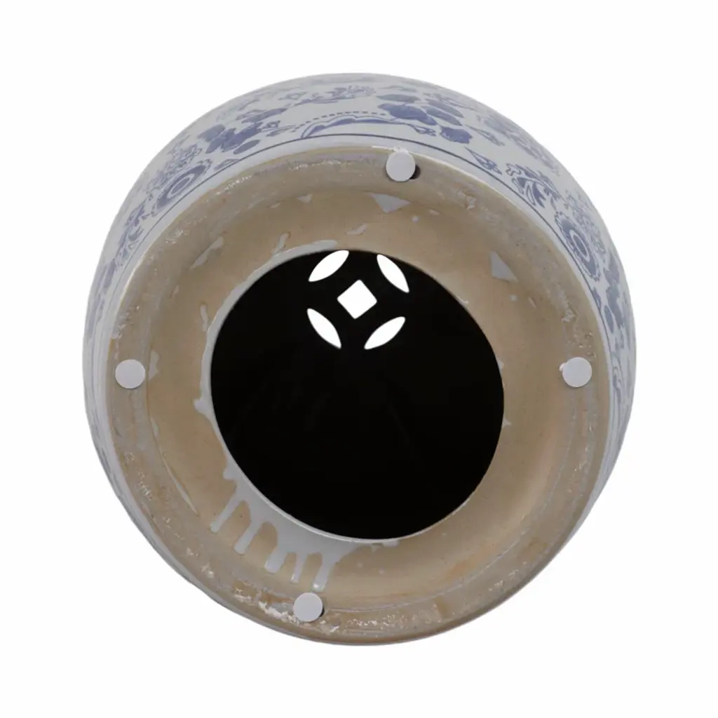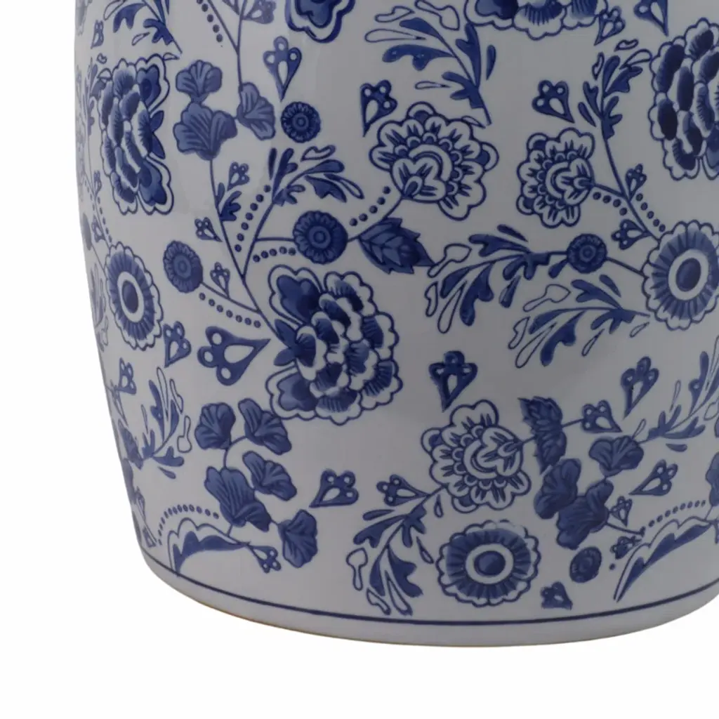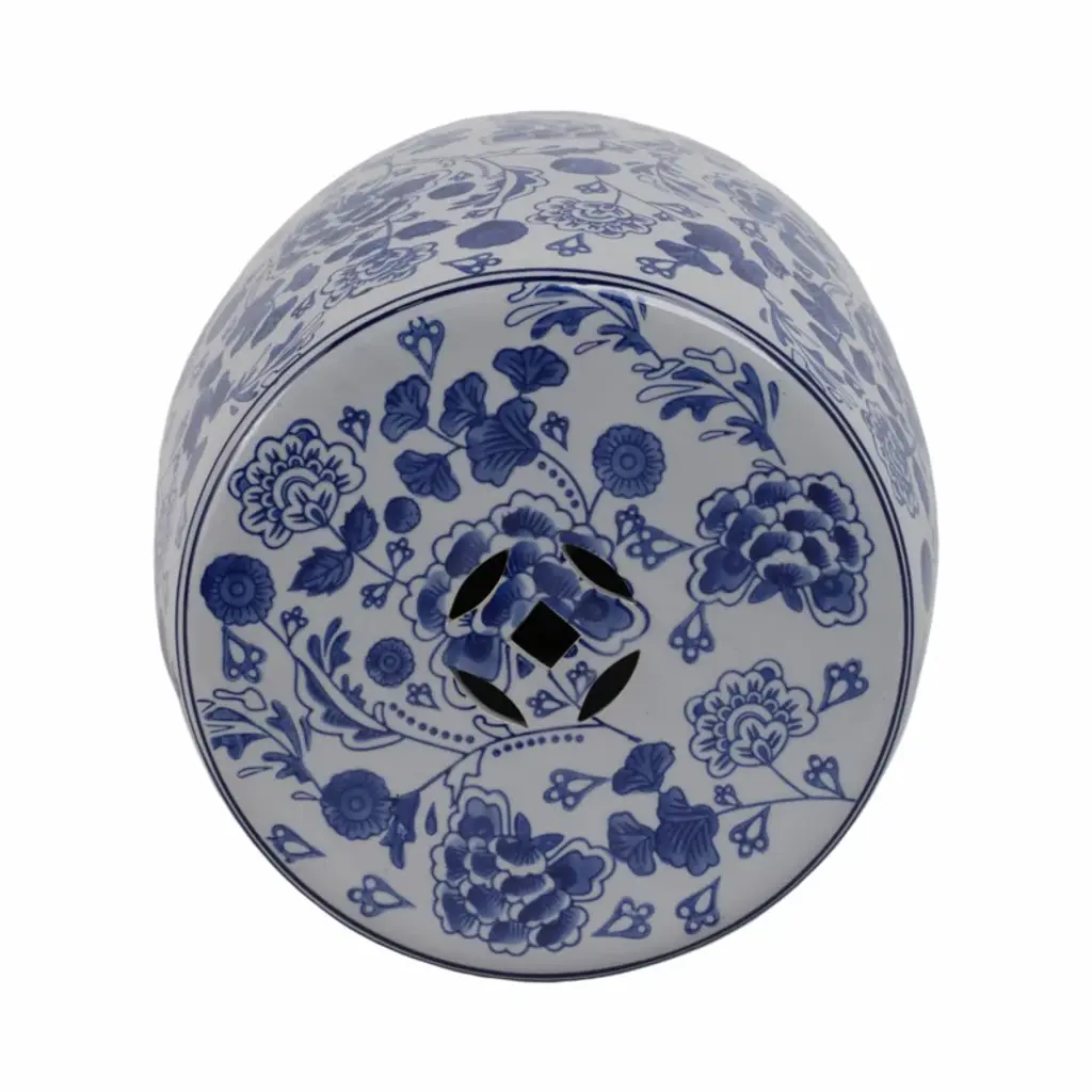 This 18'' accent stool brings a boho seating option to your indoor or outdoor space. It's crafted from ceramic with a white and blue glaze, showcasing intricate floral patterns reminiscent of antique china for a refined look. We love that this versatile piece can easily double as an end table or display plinth for your favorite plants or decorative items. With a weight capacity of 250 lbs., it's a stylish and functional addition to your home. Plus, the stool is water-resistant, making it a great choice for your patio or garden area.
