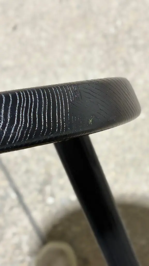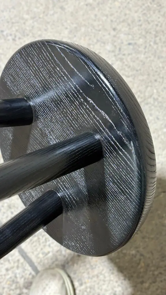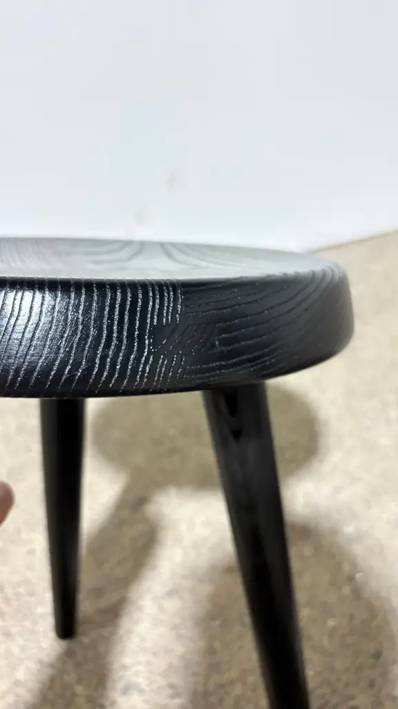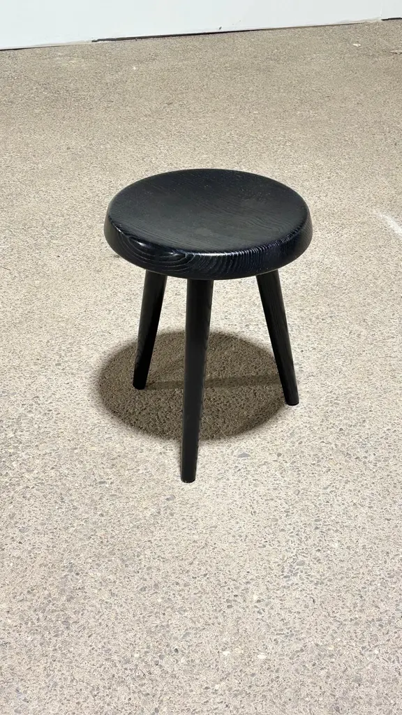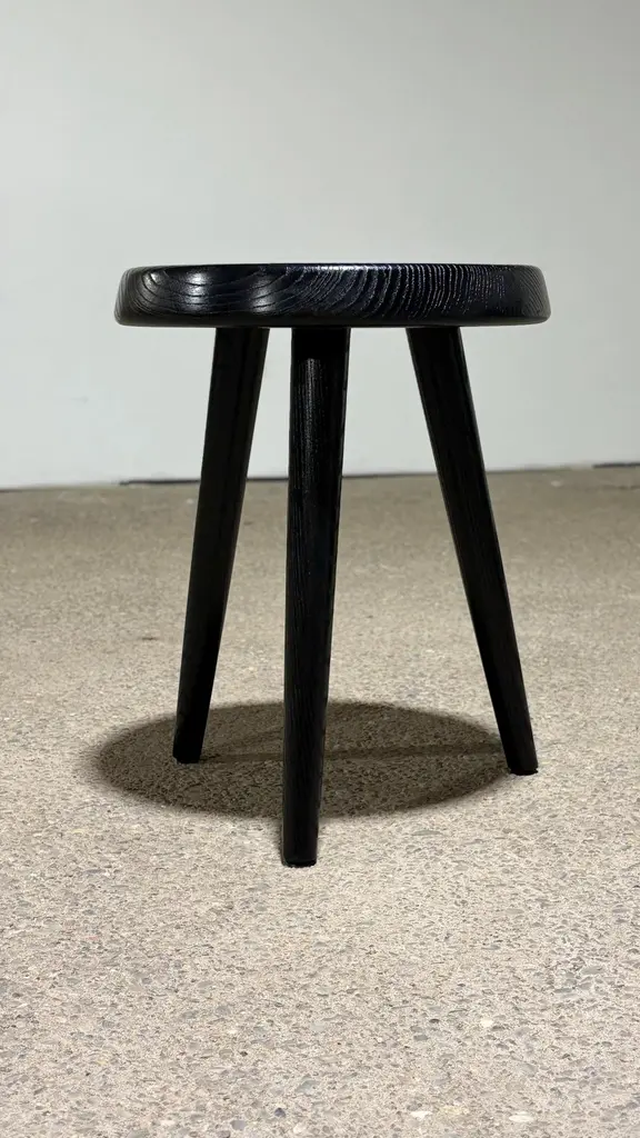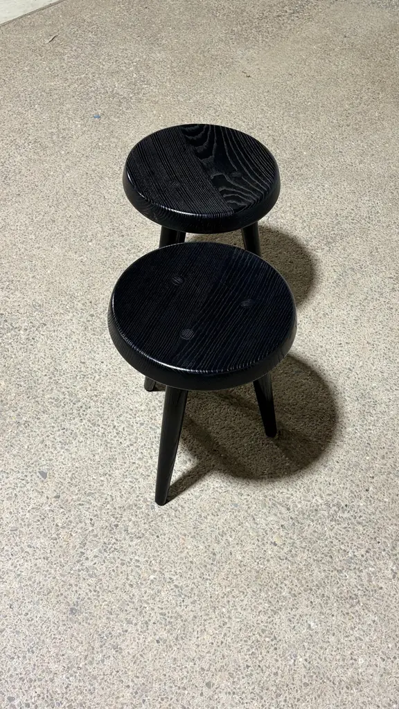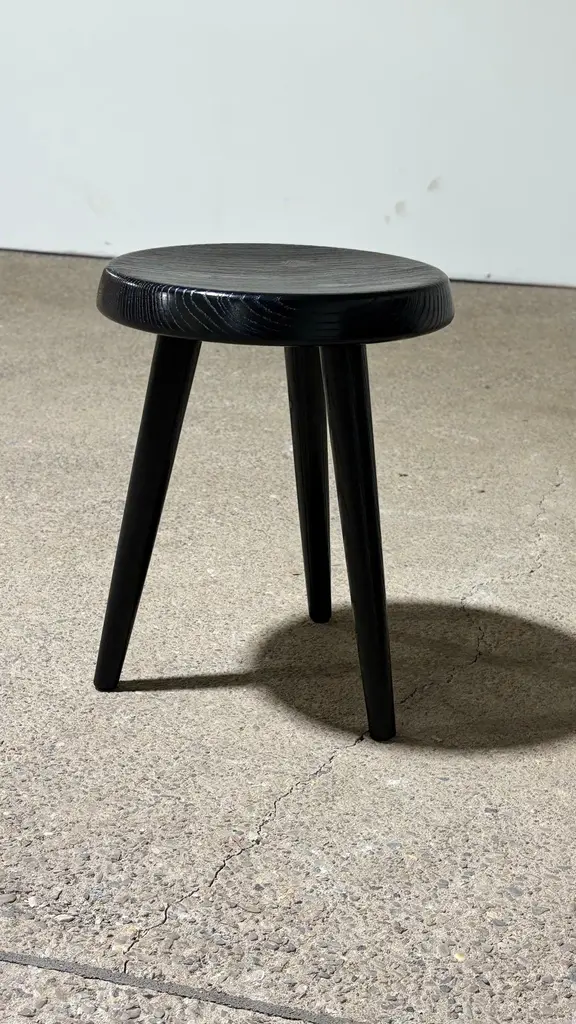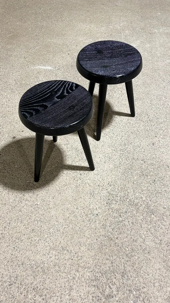 Beautifully crafted tall stools with gentle curved top slab and elegantly tapered legs. A contemporary interpretation of the modern French milking stool of Perriand. Cerused Ebonized oak offers a rich texture. Ships from Philadelphia.
