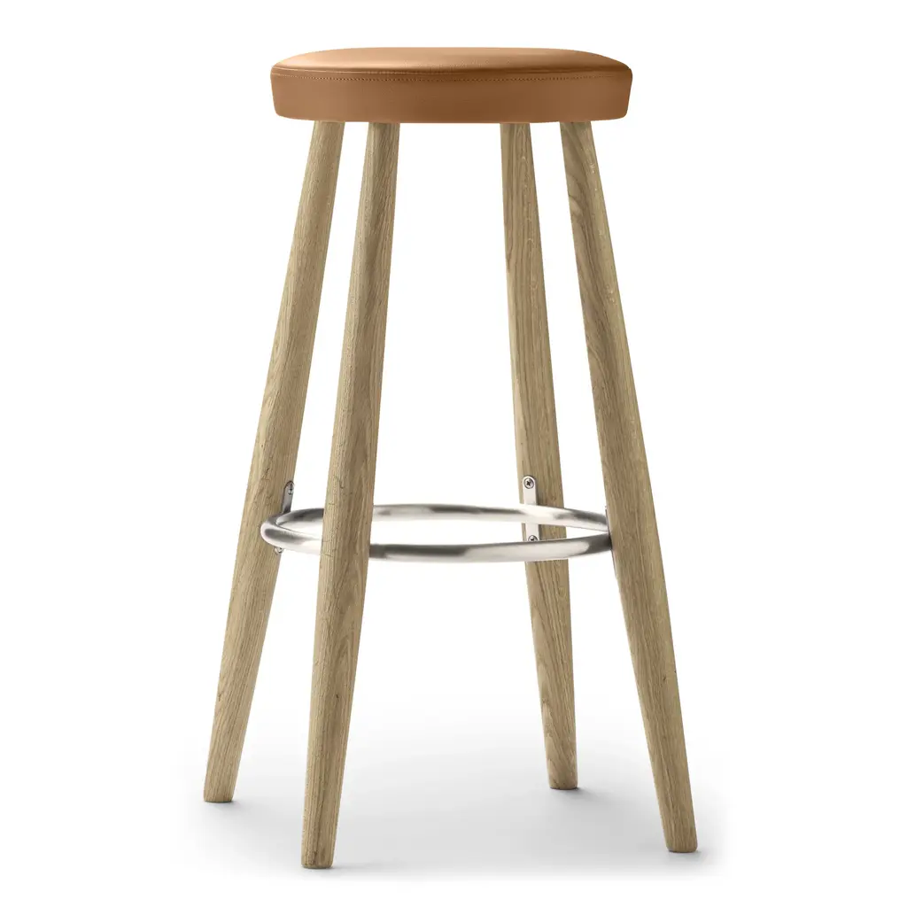 Even decades after it was first produced, the CH56/CH58 Stool from Carl Hansen and Son is still an ideal fit for modern kitchens, bars and restaurants. It creates an inviting atmosphere for social encounters with its soft, organic shape and comfortable leather-upholstered seat. Lightweight and easy to move around any space, the accenting metal ring ensures both stability and comfort for resting your feet, while the legs have been crafted to be thicker where they need to support the construction most. Highlights