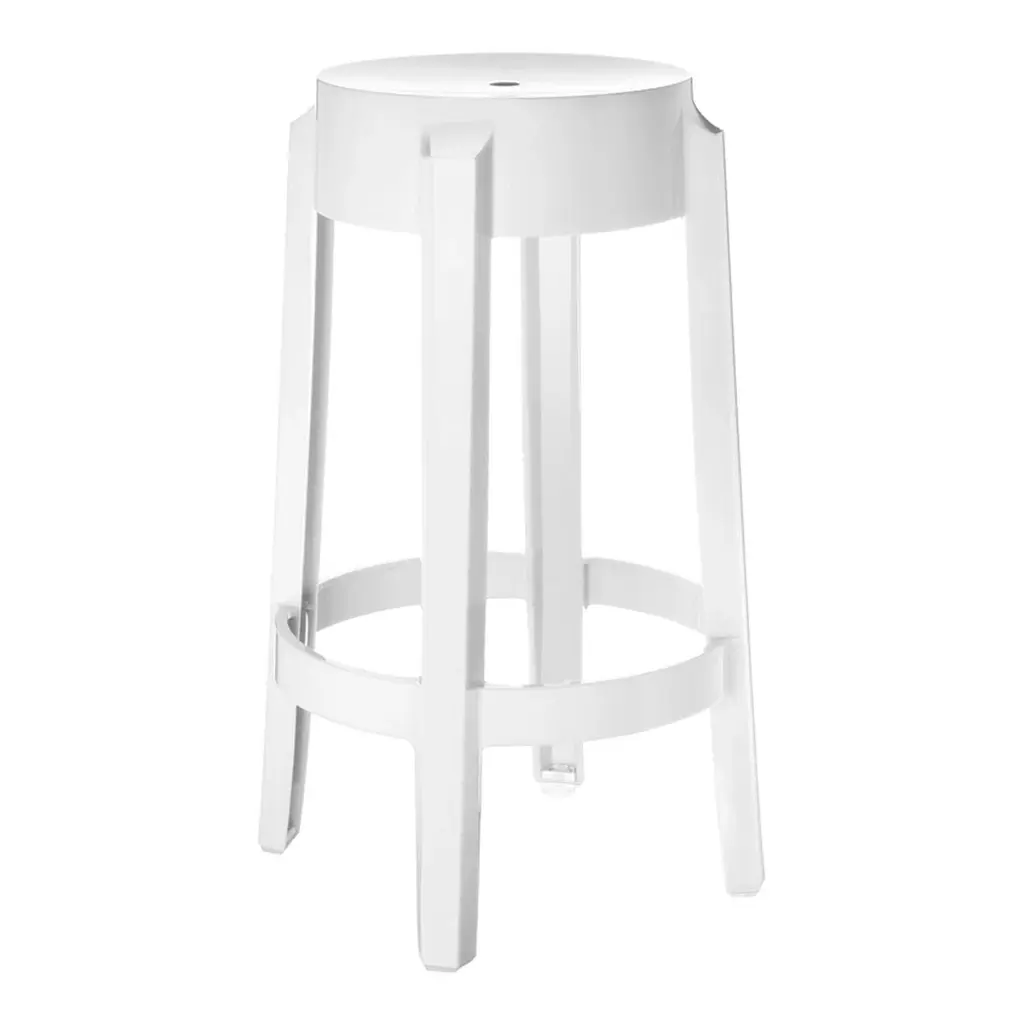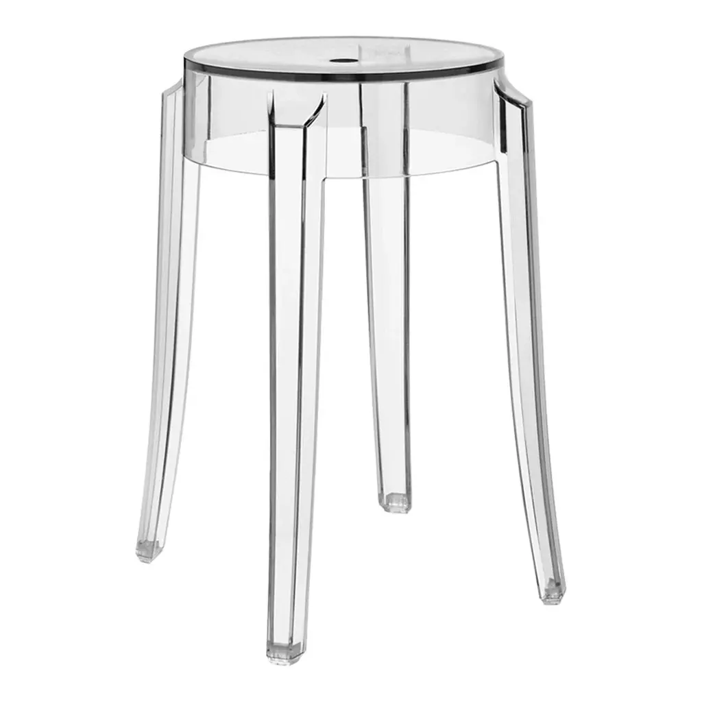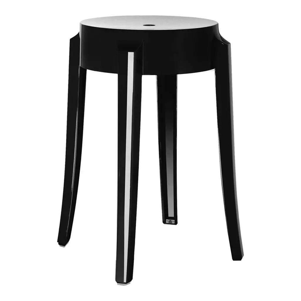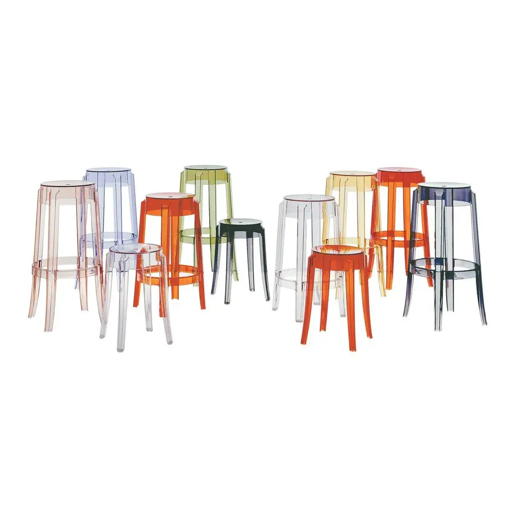The shape conjures up stools of the 1800s and the line of the legs is rounded and slightly upturned, an icon of the classic high stool. Charles Ghost is constructed from a single block of transparent polycarbonate which makes it indestructible and allows it to survive anywhere. It is available in three different heights: from the stool for occasional and informal use to that for the kitchen bench or bar counter. It is just as suited to closed surroundings as it is to open spaces and it embraces every kind of decor and culture. A wide range of transparent and opaque colours allows for the creation of intriguing chromatic combinations.