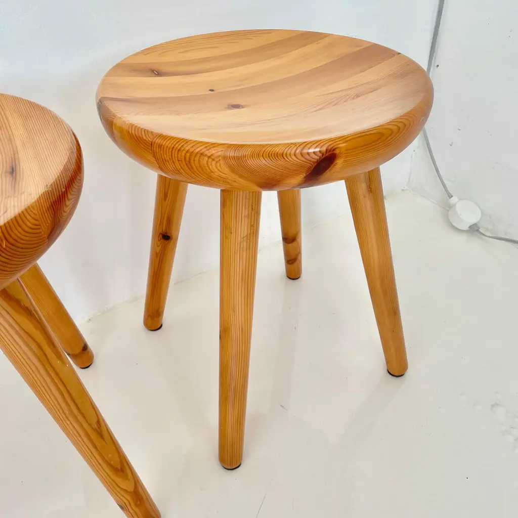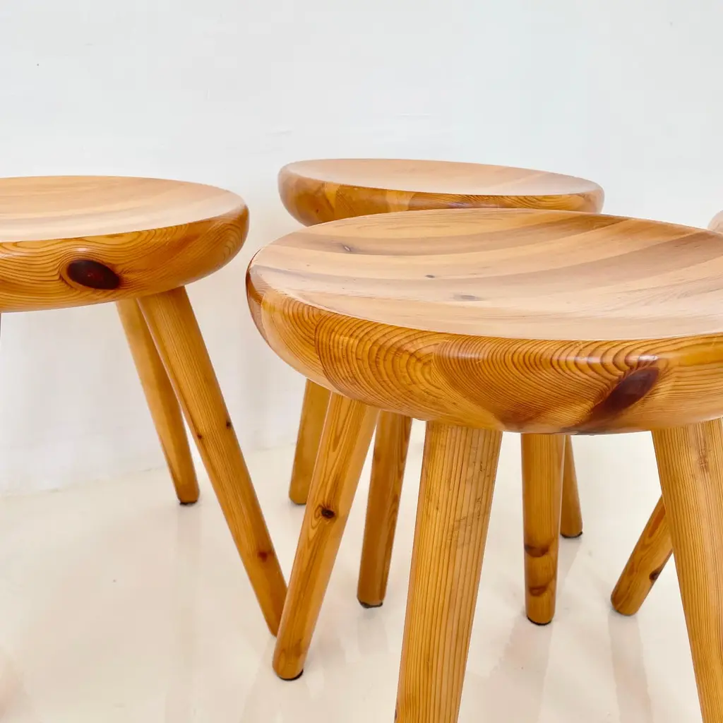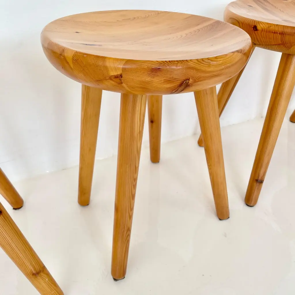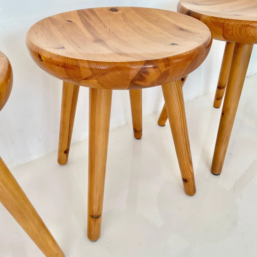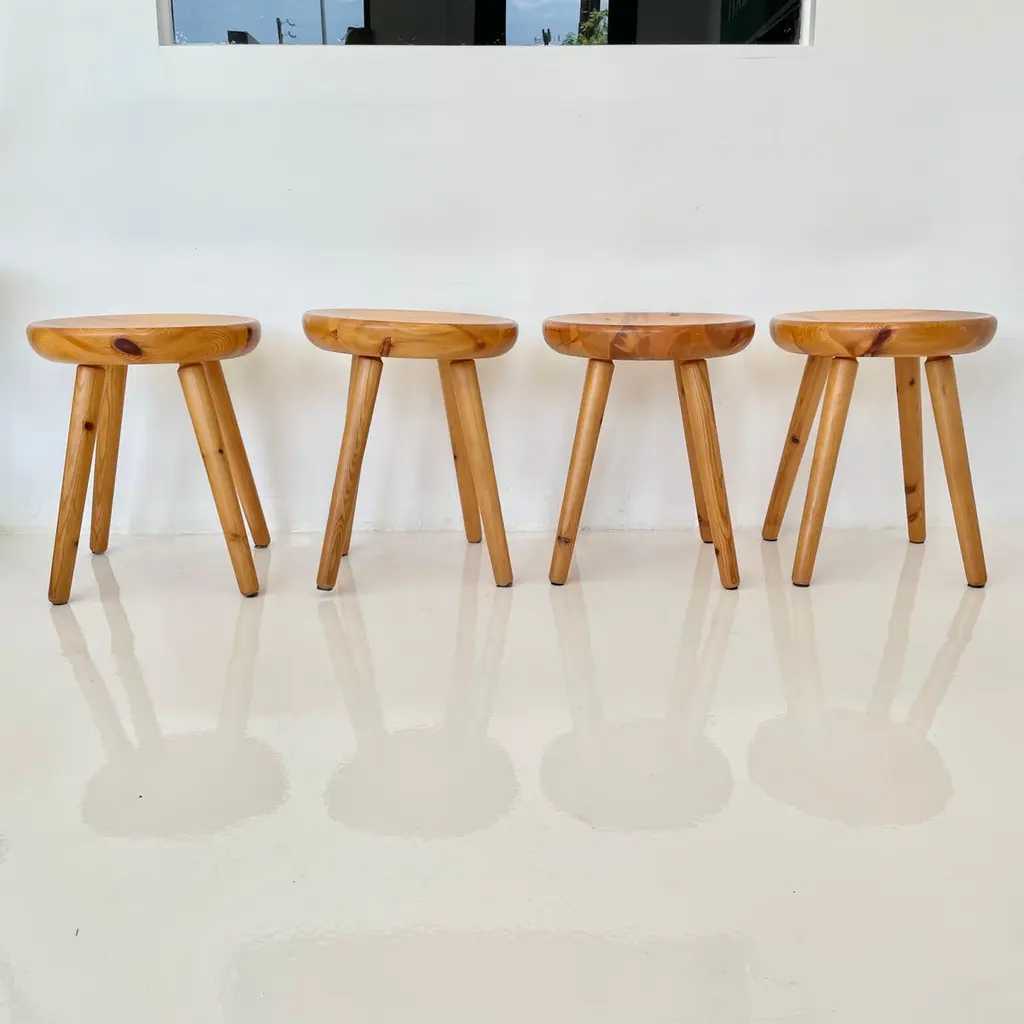 Collectible pine stools in the style of Charlotte Perriand. No screws or hardware used on stools. Beautiful joinery and grain details. Four available. Priced individually. Very good condition with slight wear and excellent patina.