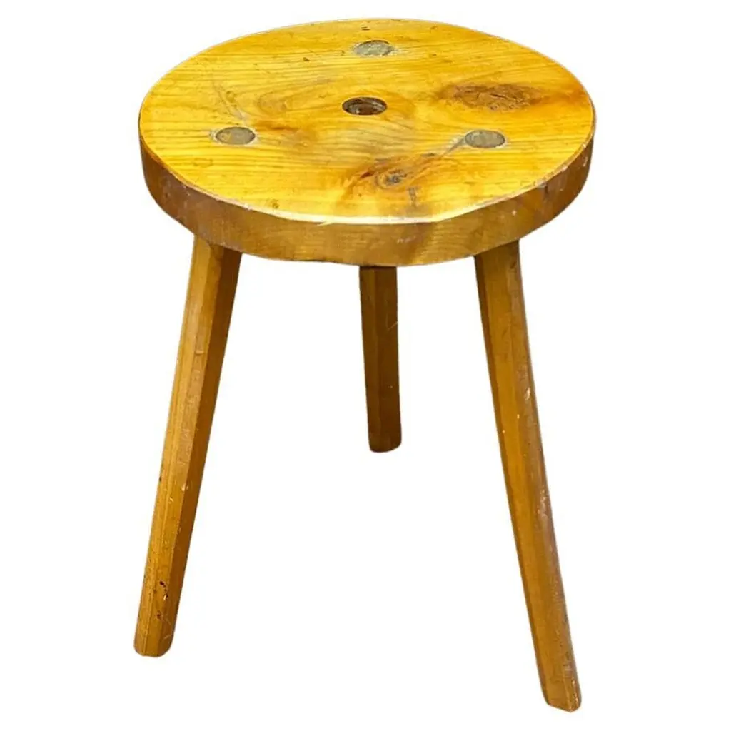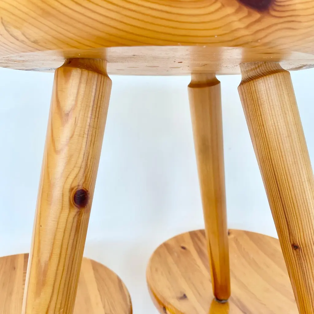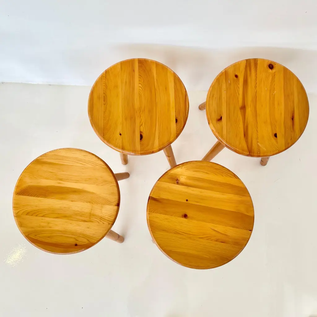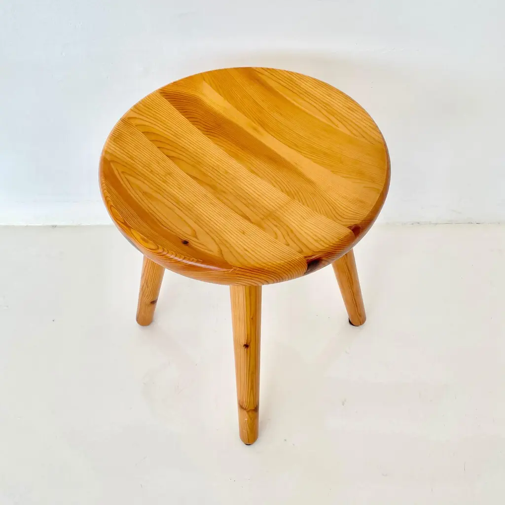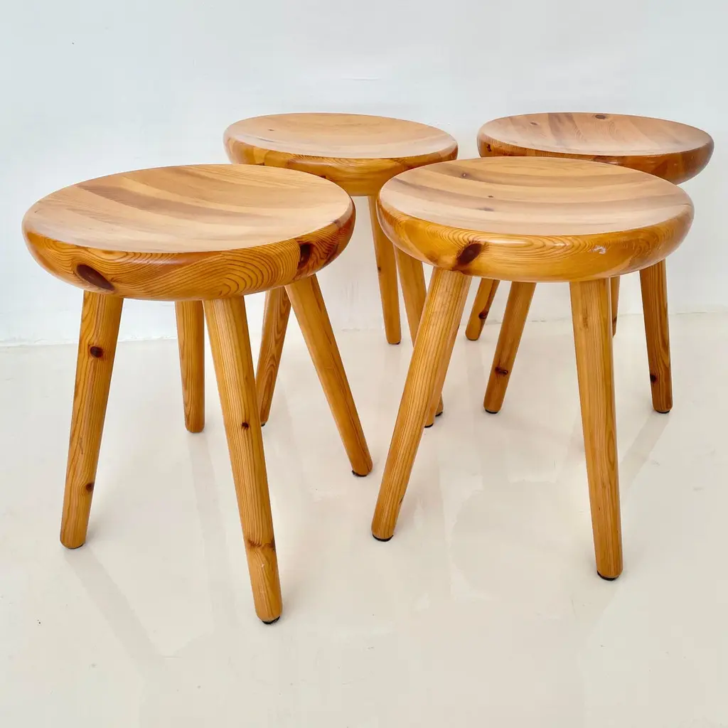 Collectible pine stools in the style of Charlotte Perriand. No screws or hardware used on stools. Beautiful joinery and grain details. Four available. Priced individually. Very good condition with slight wear and excellent patina.