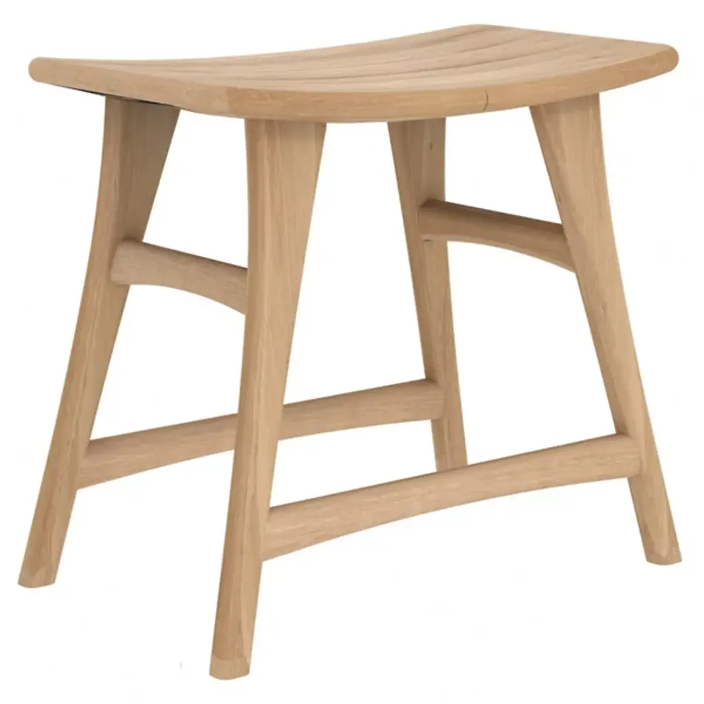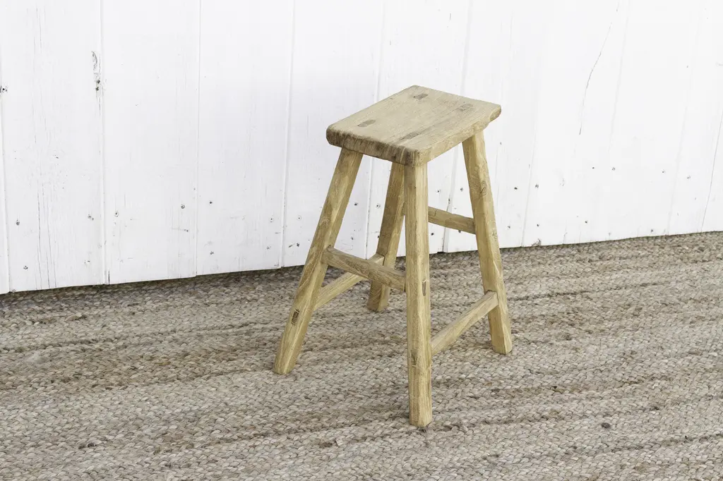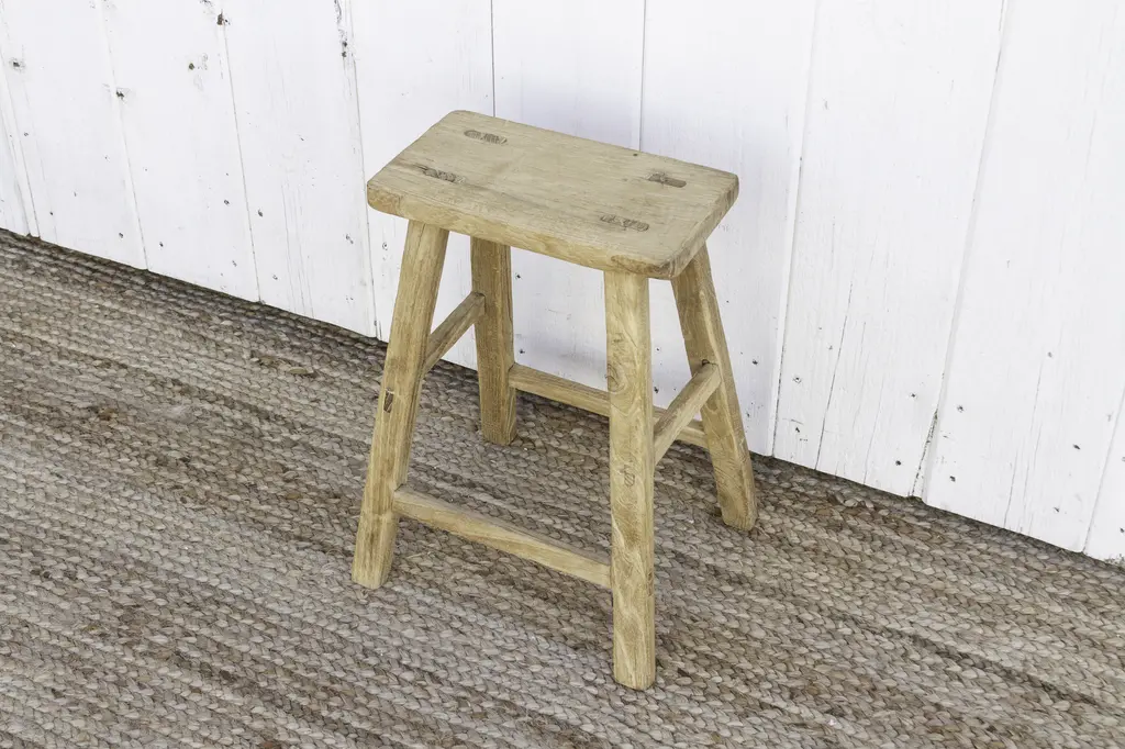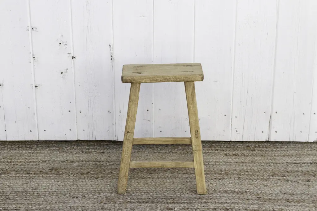 Full of age and character, this farmhouse style joint stool has a weathered look. This antique Asian stool has a stretcher base with distressed bleached finish. A rustic small end table for a living room or bedroom. Shows wear and oxidization.