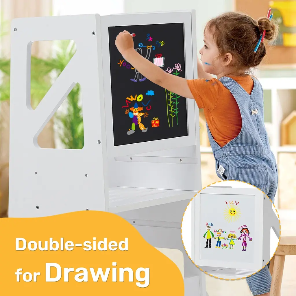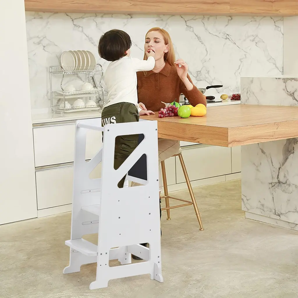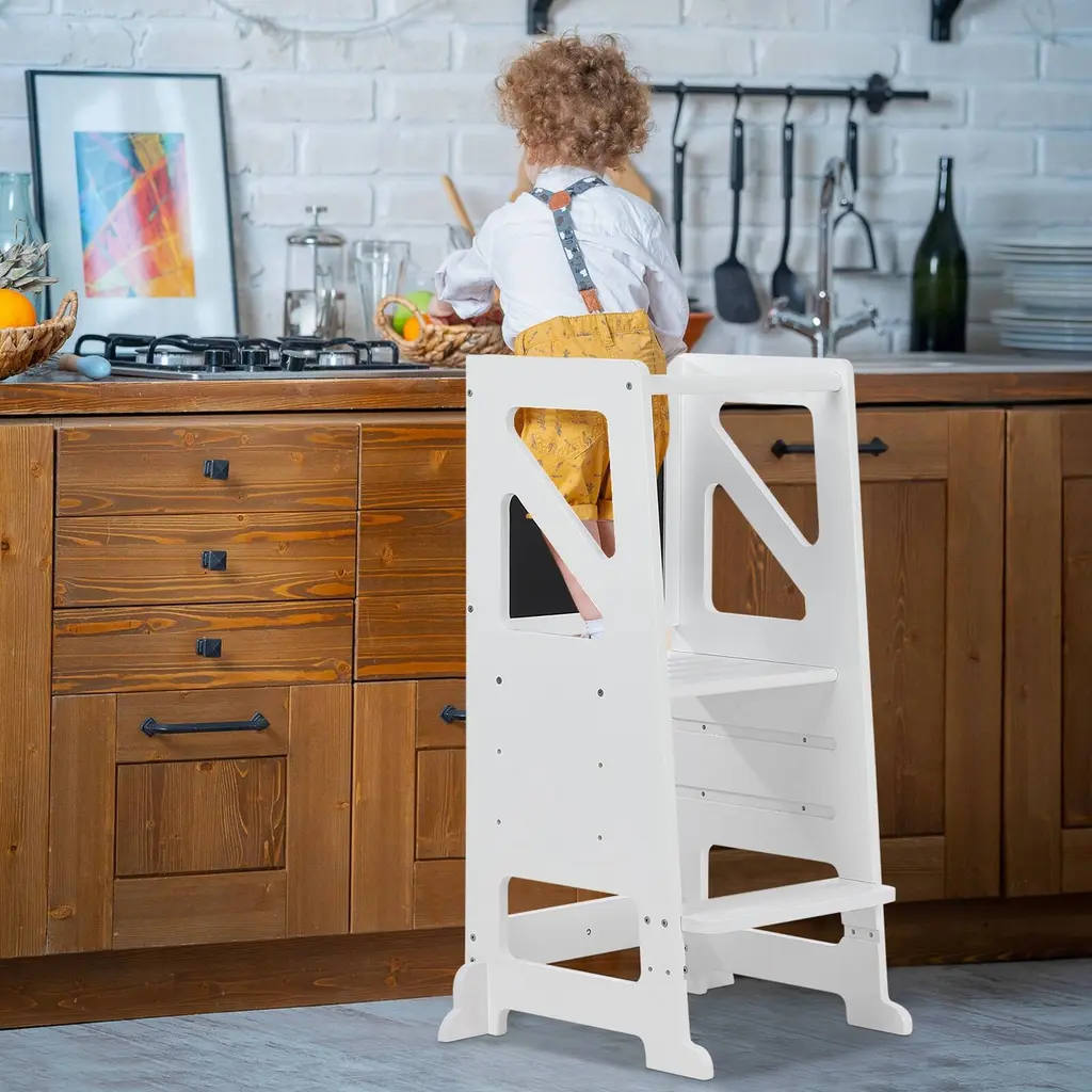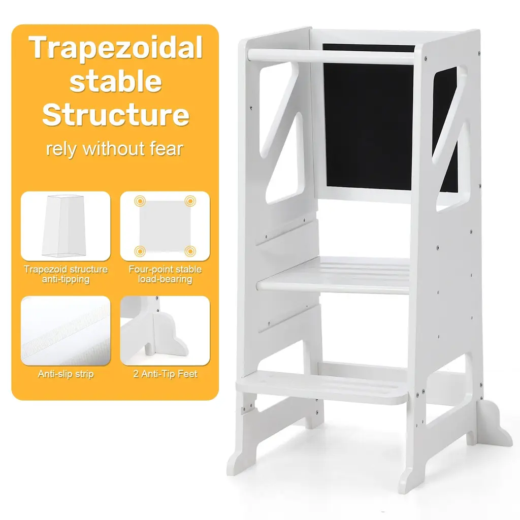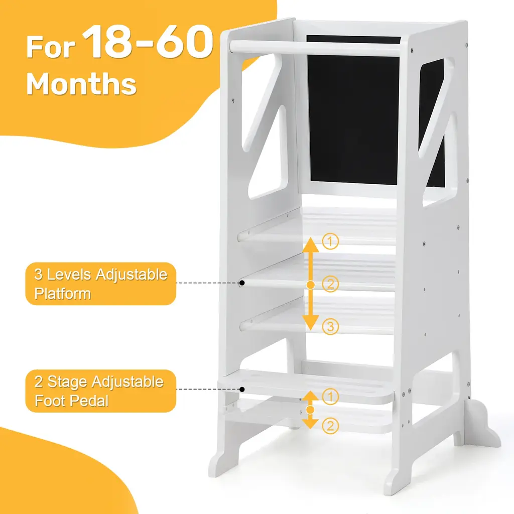 Adjustable Height for Growing Children:Designed for toddlers aged 18 to 60 months, :this children's wooden step stool features three adjustable platforms, allowing it to grow with your child and accommodate different activities as they develop.Versatile Functionality:With two adjustable footrests, this step stool provides stability and comfort, making it perfect for various activities such as drawing, reaching the sink, or helping in the kitchen.Durable Wooden Construction:Crafted from high-quality wood, this step stool is built to withstand daily use while ensuring safety and stability for your little ones during their activities.Encourages Independence:This step stool helps children gain independence by allowing them to reach higher surfaces with ease. It promotes self-sufficiency as they learn to complete tasks on their own.Creative Exploration:The stool provides a perfect platform for artistic expression, giving children the freedom to