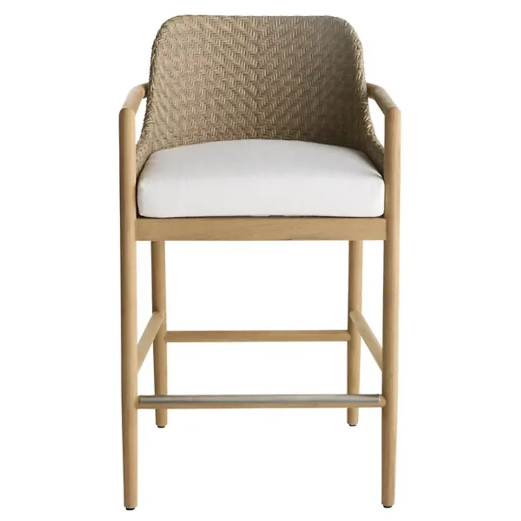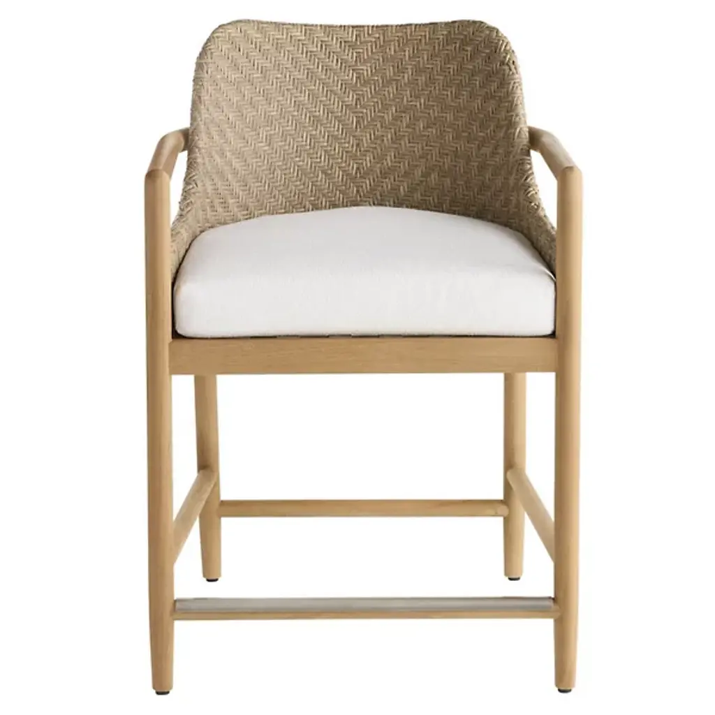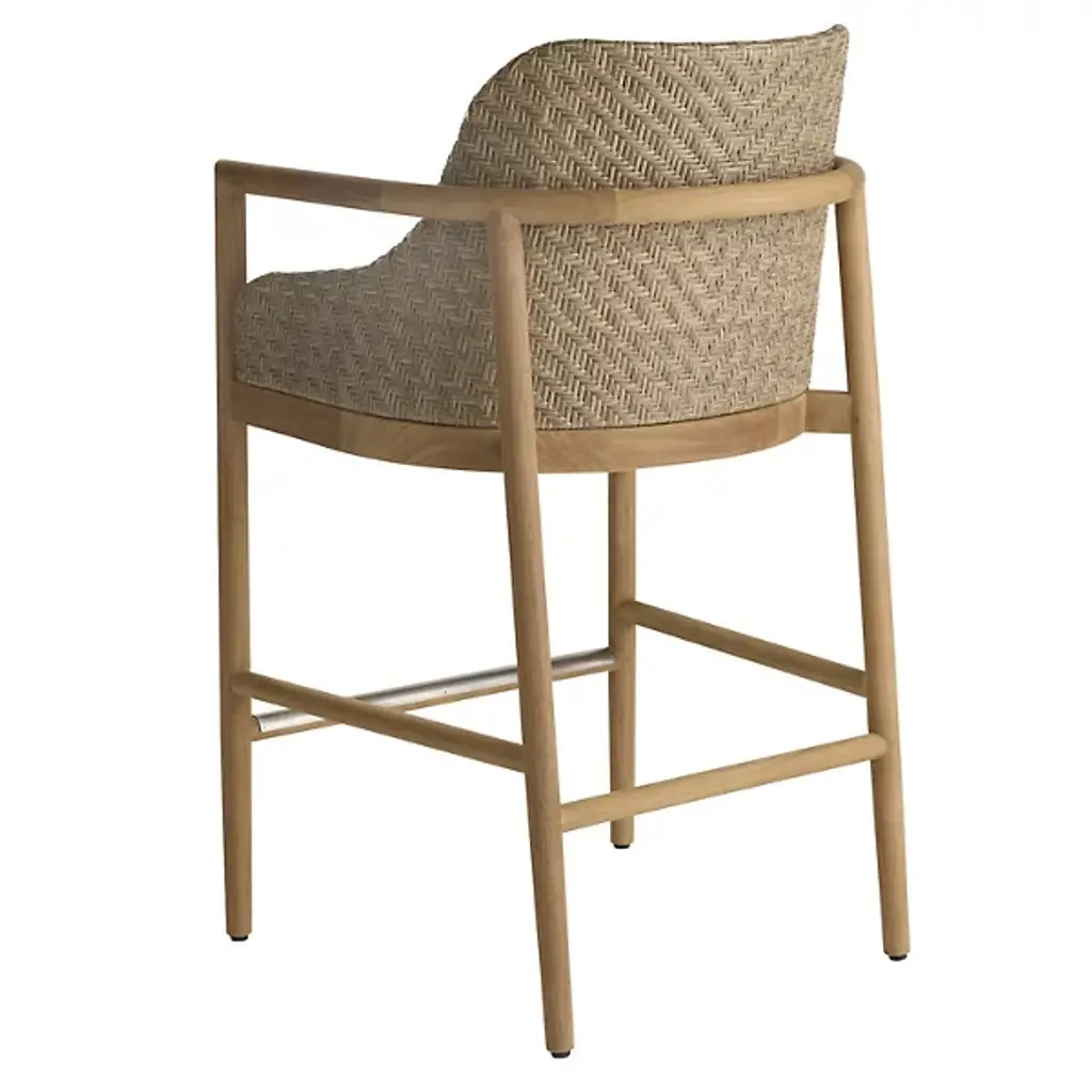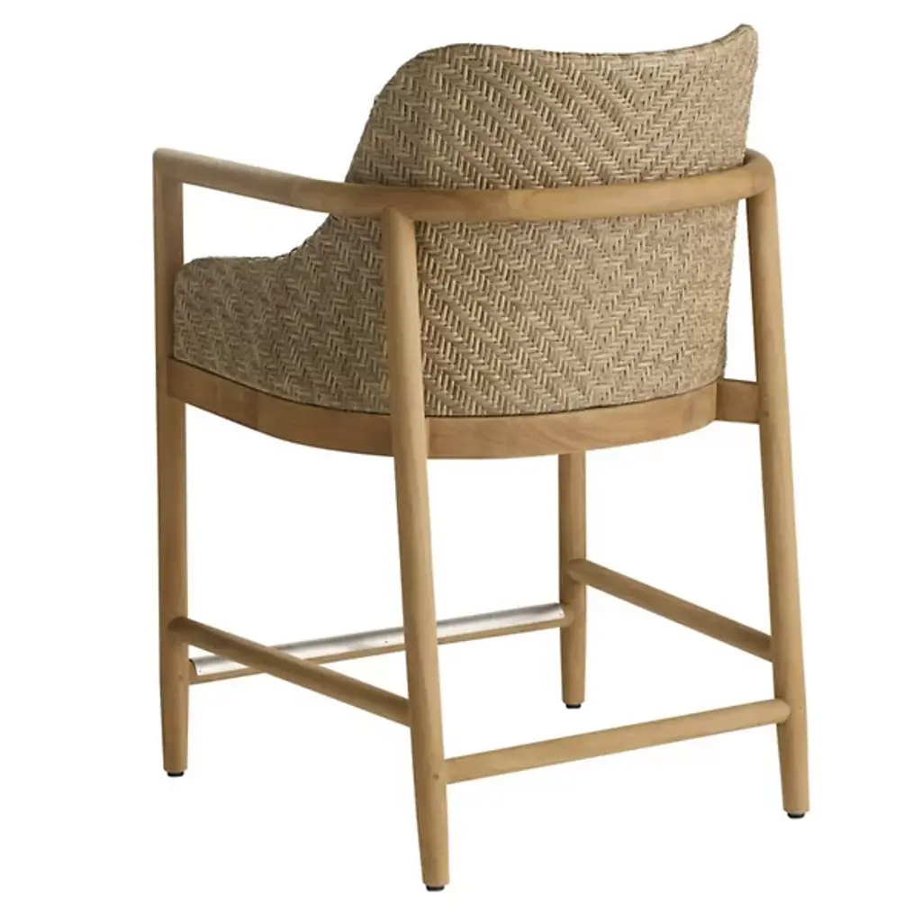 The Chilton Stool from Arteriors adapts mid-century design principles for outdoor use through its combination of synthetic rattan and solid teak construction. The sculptural back showcases organic curves that contrast with the chair's clean lines and open arms. Natural teak framing provides structural integrity while weathering gracefully over time, and the outdoor performance bouclé cushion ensures comfort during extended use. Stainless steel footrest caps complete the design with functional details that enhance the piece's longevity in outdoor environments.