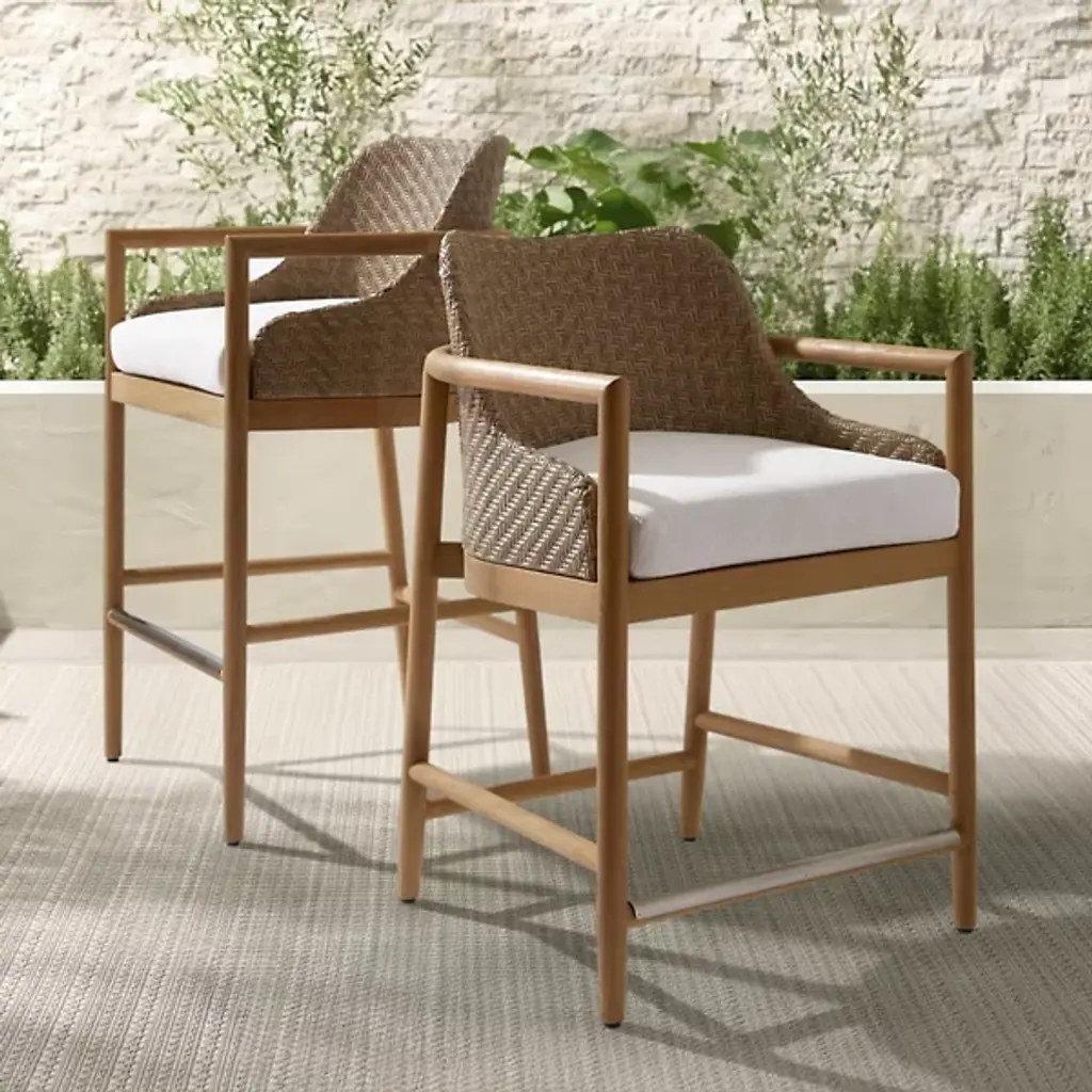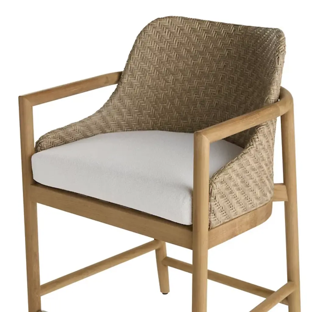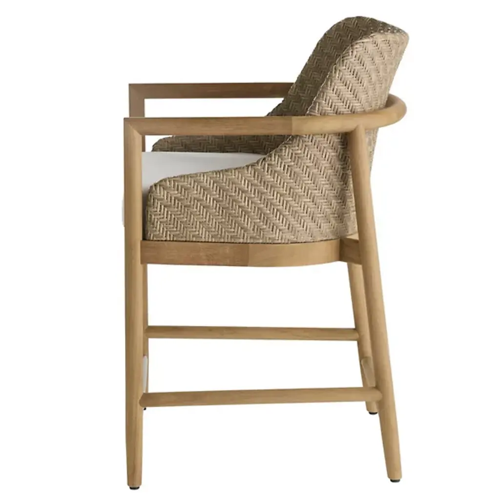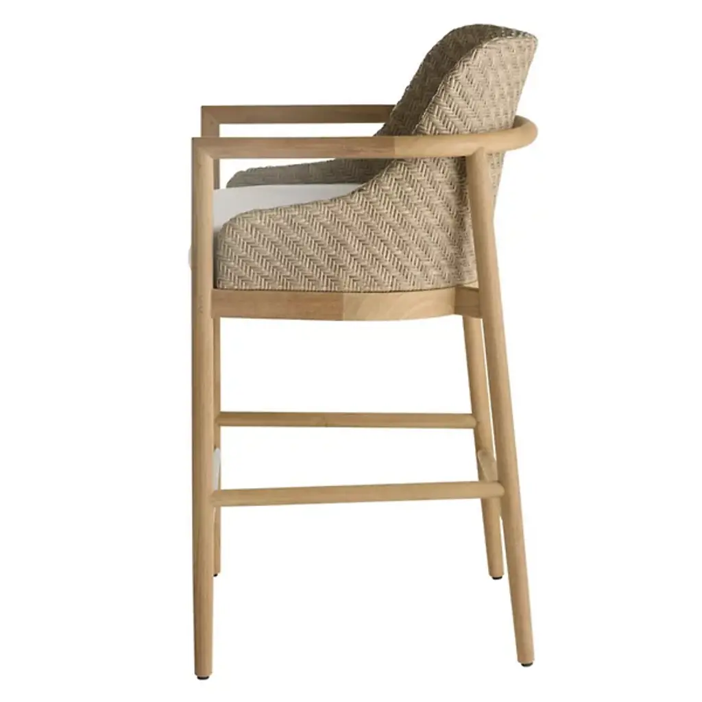 The Chilton Stool from Arteriors adapts mid-century design principles for outdoor use through its combination of synthetic rattan and solid teak construction. The sculptural back showcases organic curves that contrast with the chair's clean lines and open arms. Natural teak framing provides structural integrity while weathering gracefully over time, and the outdoor performance bouclé cushion ensures comfort during extended use. Stainless steel footrest caps complete the design with functional details that enhance the piece's longevity in outdoor environments.