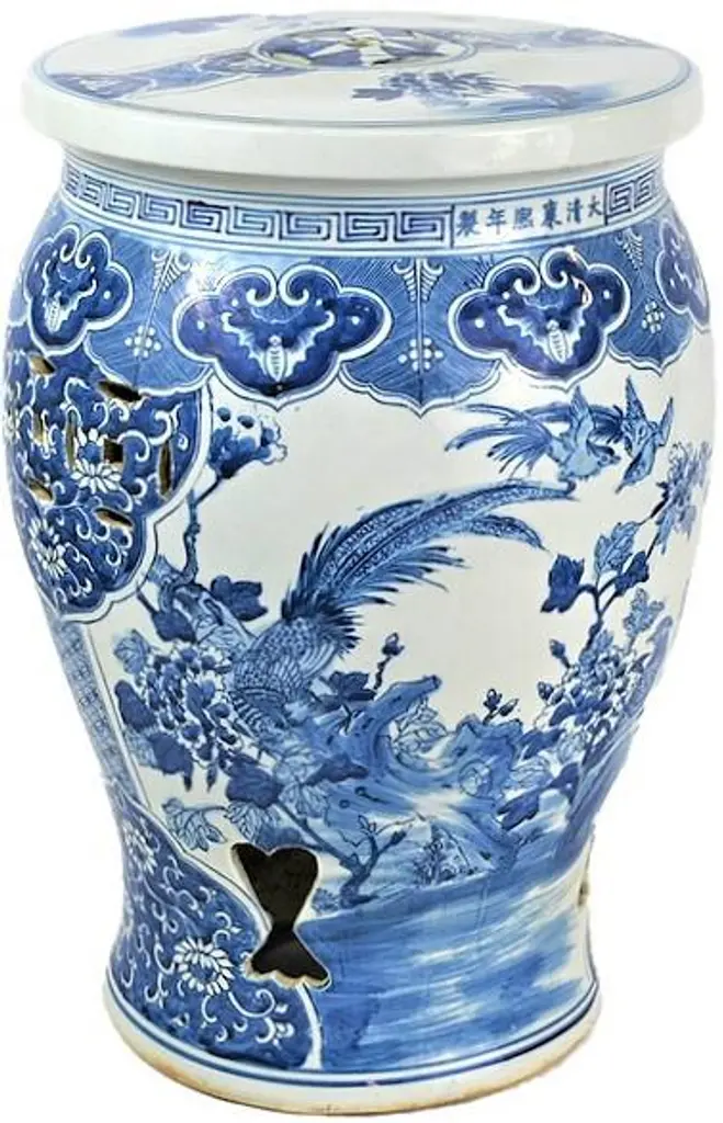 This is a beautiful blue and white porcelain garden stool in a "Baluster" shape stool with a birds in the bush design around the the entire stool! It has a beautiful two layer border around the the top for interest. This fantastic balaster has intricate Asian designs and key shaped cut-outs at the base! This has an amazing design and would look great in any location! We have multiples so purchase two and add them under a console or in front of a fireplace or next to some lounge chairs inside or out. These are perfect for outdoor decor, seating or table! Please take a look at our other Blue and White Chinese Porcelain! We have more than one if you need a pair. The Dimensions are: 13"w, 13"d, 18"h
