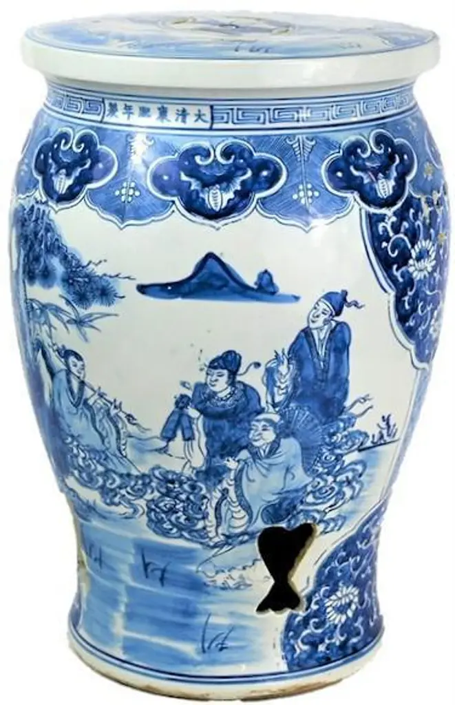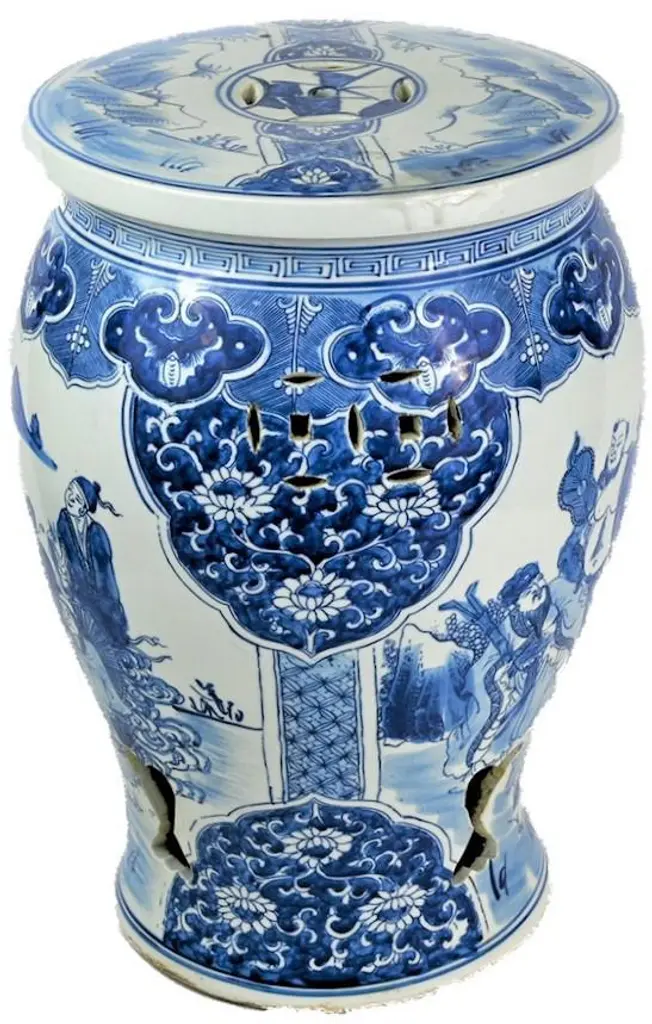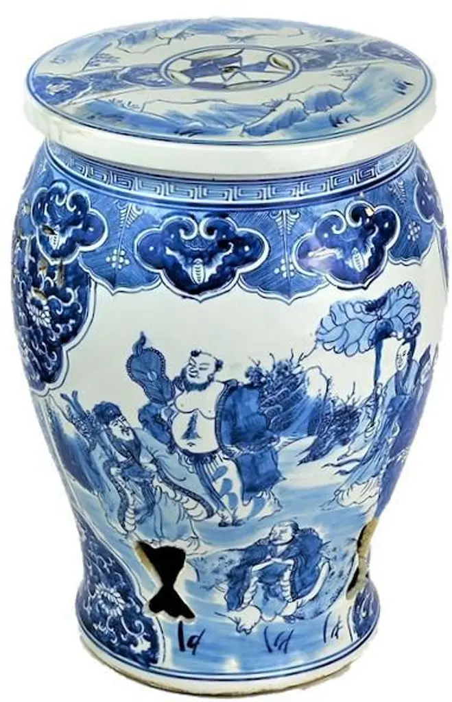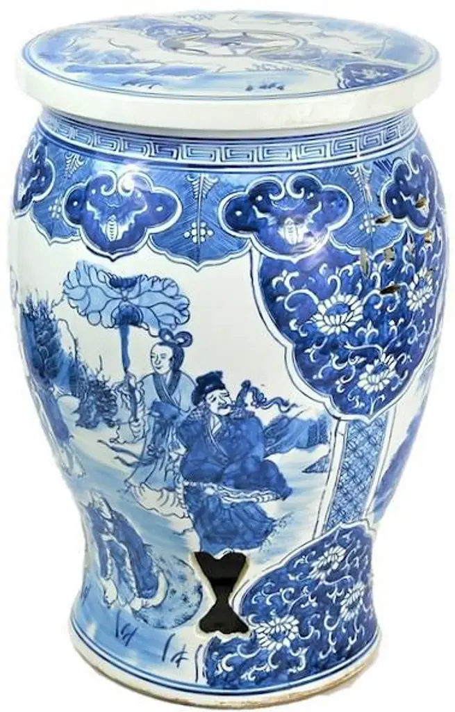 This is a beautiful blue and white porcelain garden stool in a "Baluster" shape stool with a a large vignette panel of people in a pastoral landscape scene. It has a beautiful two layer border around the the top for interest. This fantastic balaster has intricate Asian chrysanthemum designs and key shaped cut-outs at the base! This has an amazing design and would look great in any location! We have multiples so purchase two and add them under a console or in front of a fireplace or next to some lounge chairs inside or out. These are perfect for outdoor décor, seating or table! Please take a look at our other Blue and White Chinese Porcelain! The Dimensions are: 13"w, 13"d, 18"h