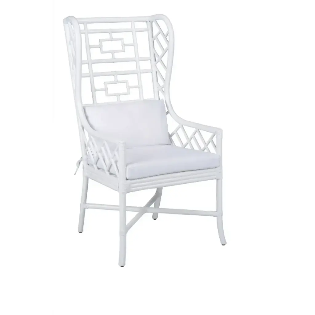 A tribute to classic Chinese Chippendale craftsmanship, this outdoor counter height stool shows off powder-coated aluminum fretwork reinforced with faux-leather bindings. Topped with a generously padded seat cushion wrapped in high-performance Sunbrella fabric. Works indoor and outdoors.