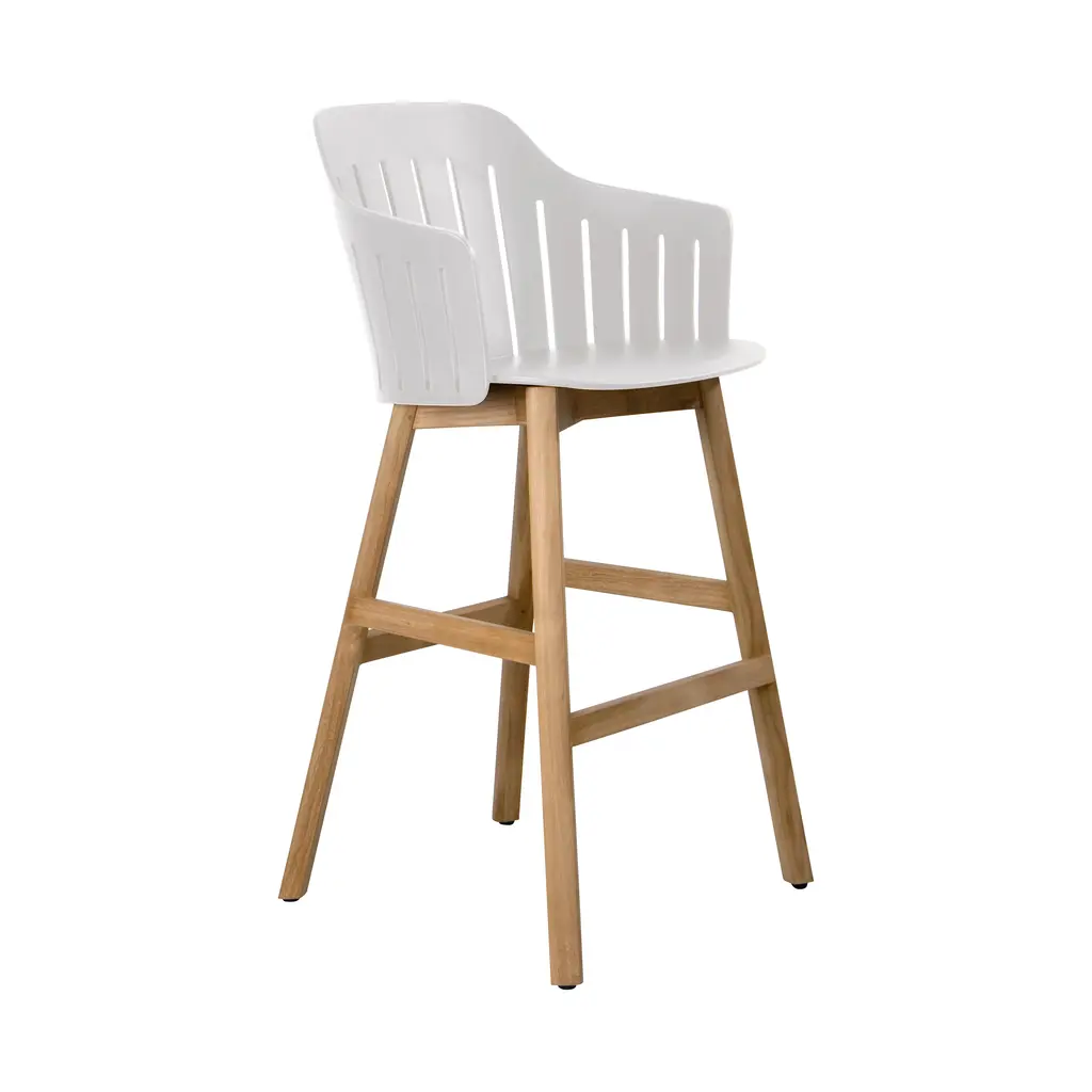 Perfect poolside or accenting a home bar, the Choice Indoor/Outdoor Stool from Cane-line is a beautiful option for any home. Crafted with a durable recycled polypropylene shell and teak wood base, this bar chair exudes elegance and sophistication. Its flexible shell and smooth contours provide unmatched comfort, while its linear cuts enhance airflow for relaxed seating even on the warmest of days. Customize your style and functionality with its interchangeable base. Highlights