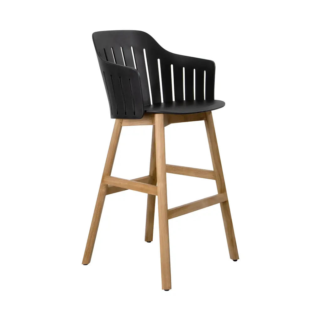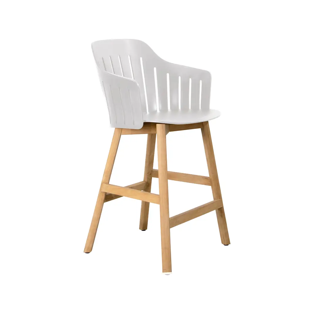 Perfect poolside or accenting a home bar, the Choice Indoor/Outdoor Stool from Cane-line is a beautiful option for any home. Crafted with a durable recycled polypropylene shell and teak wood base, this bar chair exudes elegance and sophistication. Its flexible shell and smooth contours provide unmatched comfort, while its linear cuts enhance airflow for relaxed seating even on the warmest of days. Customize your style and functionality with its interchangeable base. Highlights