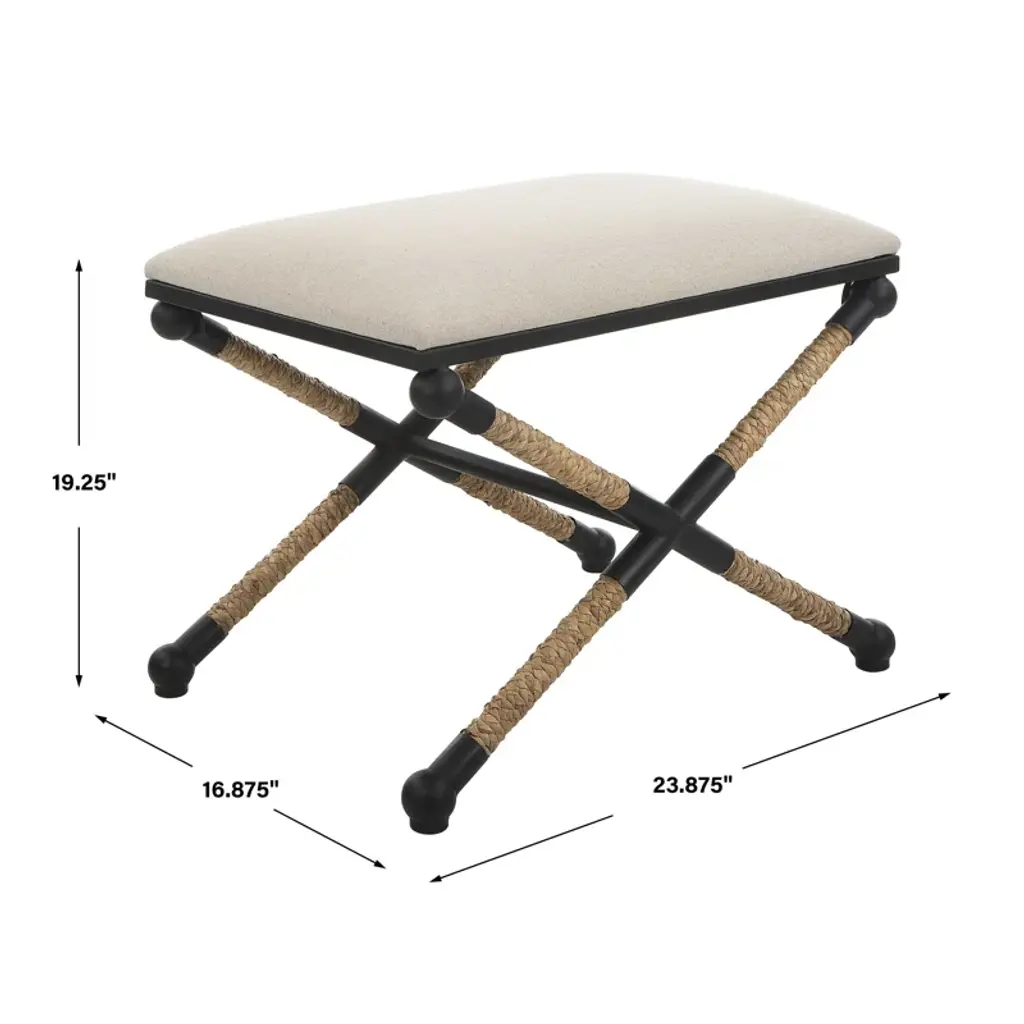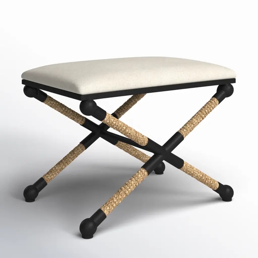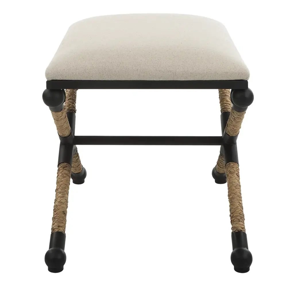 Put your feet up and enjoy this small casual tool. The iron frame is finished in satin black and wrapped in natural braided straw. The cushioned top is made of sturdy cotton fabric in neutral oatmeal. This accent piece is perfect in a coastal setting or any casual room.