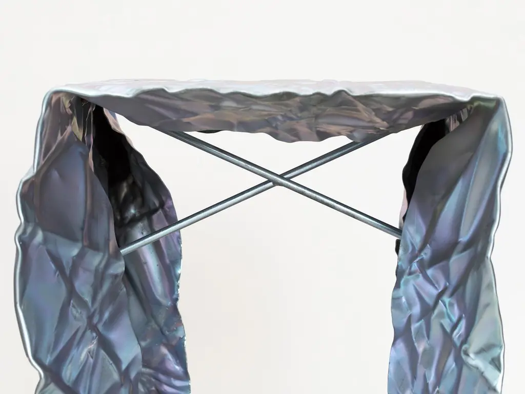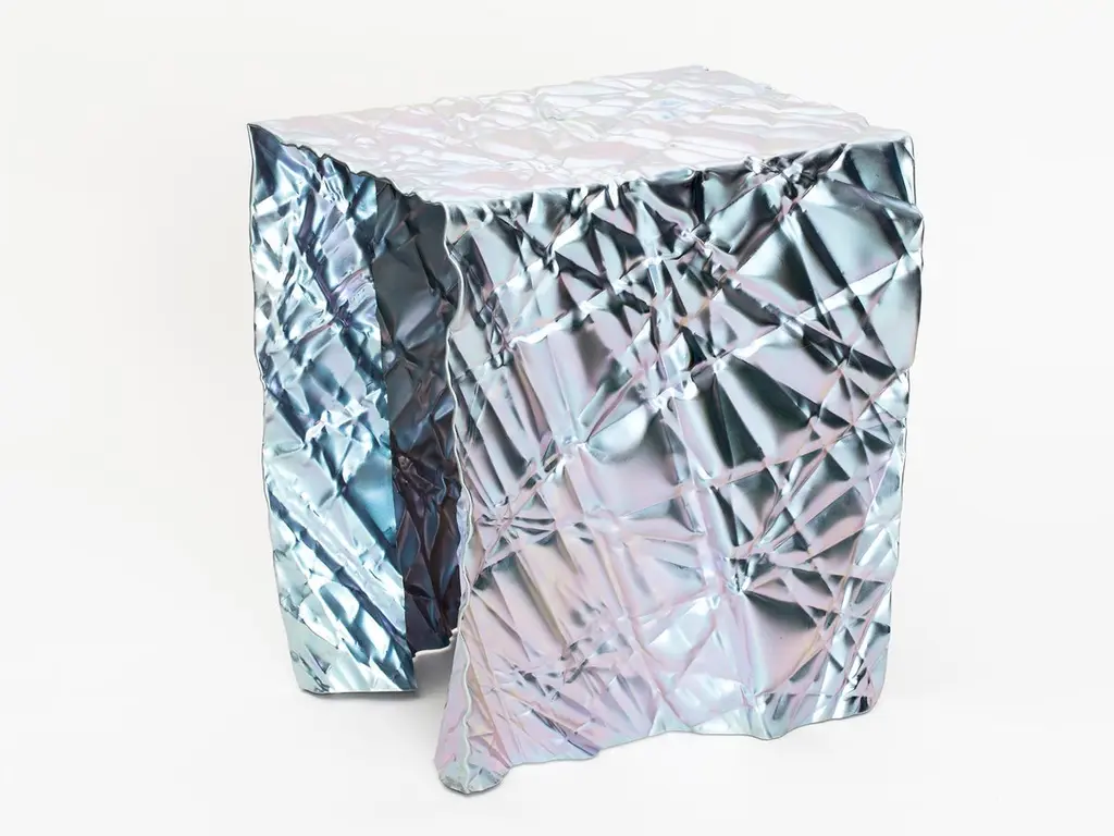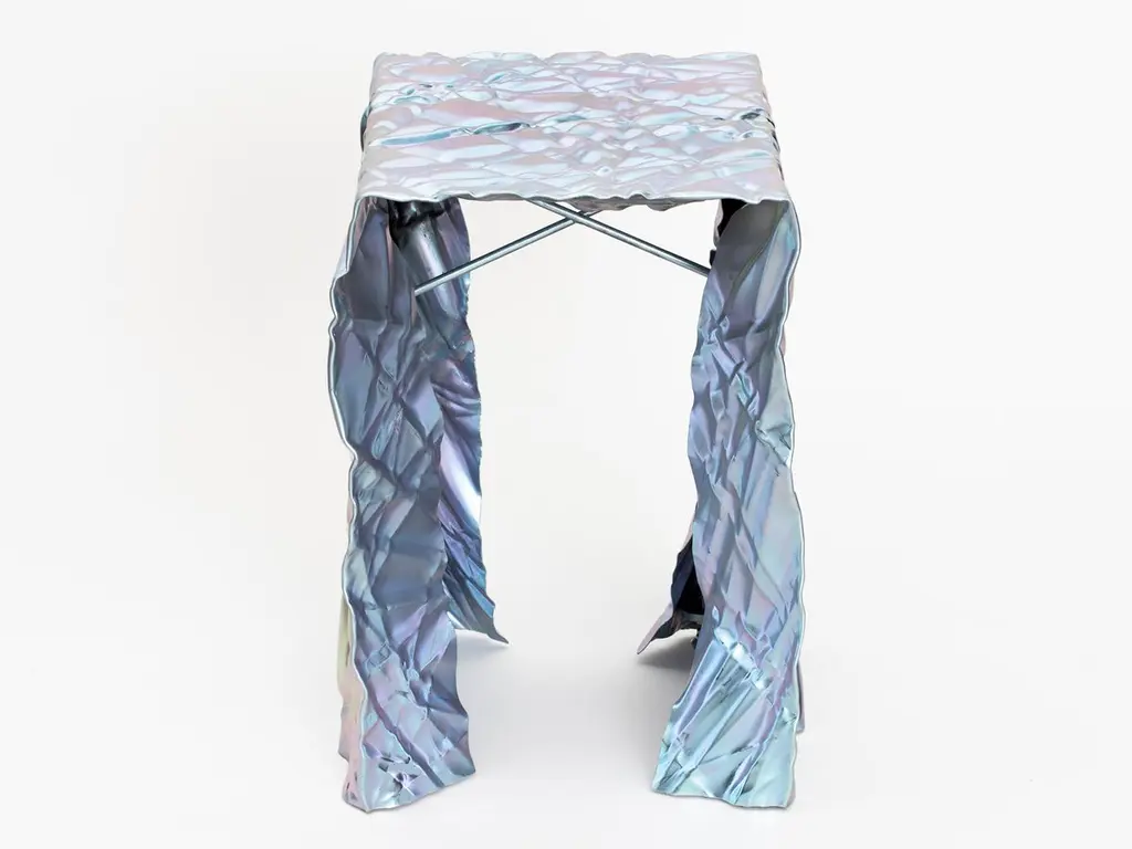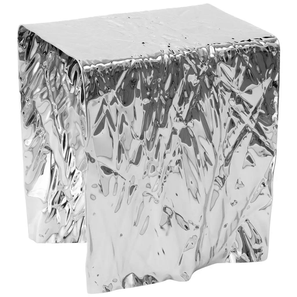Wrinkled steel stool by Omaha-based designer Christopher Prinz, who achieves this unusual texture by repeatedly creasing a thin sheet of steel, resulting in a strong, rigid, and unique form. Hidden leveling feet protect surfaces and ensure balance.Made to order in 6-8 weeks. Easily customizable and available in a range of both raw and polished finishes. Please note that pieces with polished finishes are priced higher due to the more laborious plating process that they require. Stools in the raw finishes are priced at $3800 and stools in the polished finishes are priced at $4850.CHRISTOPHER PRINZ is an Omaha-based designer seeking to expose extreme and rarely-visible possibilities of materials associated with manufacturing. His works are shaped using a repetitive, large-scale steel creasing technique, and finished with different combinations of electro-plated metals. Through this process, the material becomes terrain-like, bringing an expressiveness to these otherwise fairly mute industrial materials.Prinz received a BFA in Industrial Design from the Rhode Island School of Design in 2014.