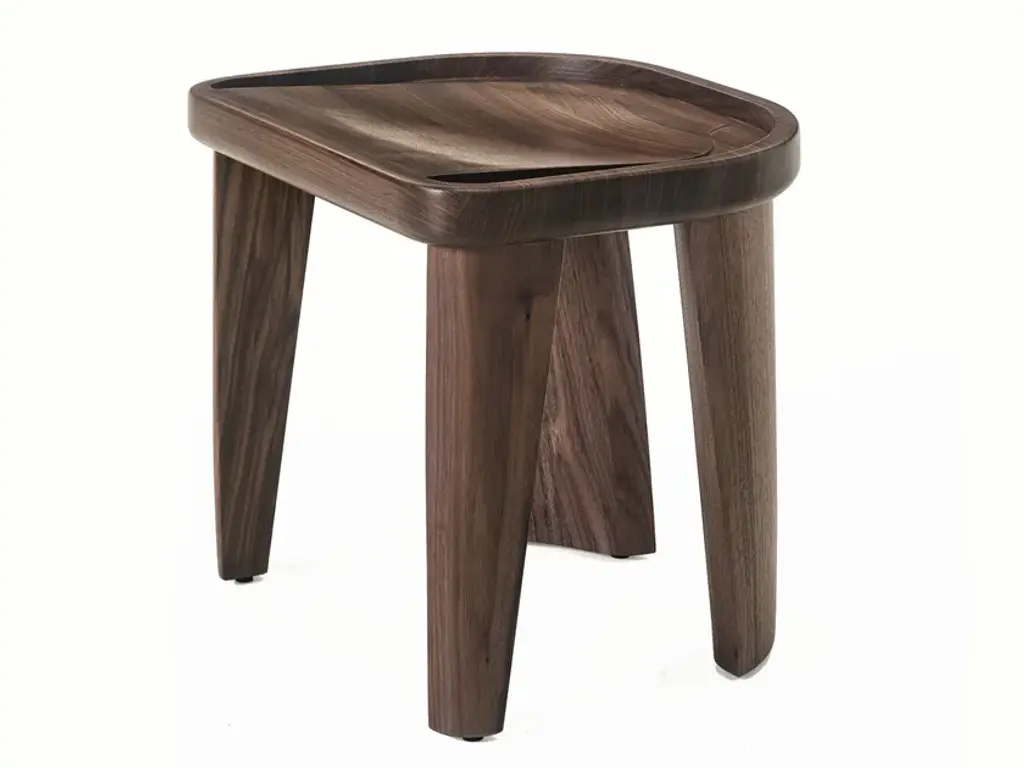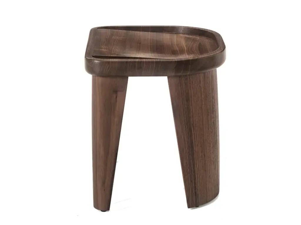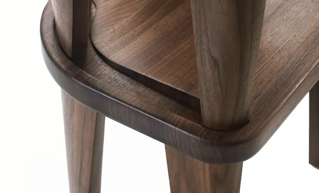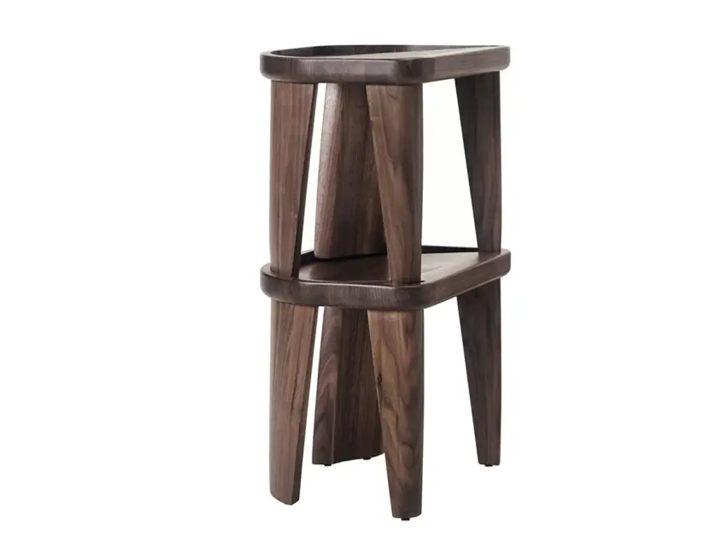 Cluster is a carved, solid wood stool that can be stacked up to four high. Materials: Solid carved White Oak or Walnut. Some of the most innovative, powerful design takes its strength from its sculptural elements. In certain cases, it is a sense of fragility that offers impact. At other times it is the imposing, muscular heft of the object that strikes a chord – a strong sense of presence. There have been many influential pieces of design from the last 100 years that have come from a utilitarian place. The BassamFellows Cluster Stool is such a piece and was developed to meet a design brief for a large hospitality group. The Cluster is a simple, easy to move object for sitting on, and it stacks neatly away without the need to be hidden. A group of Clusters looks “on purpose,” and pleasing to the eye. It belongs to a canon of utilitarian, Modernist stools, and looks like the kind of ultra-functional object you may find in a Japanese onsen – a design that may have existed unchanged for centuries. It is stark, but the dip in the seat and the rounded taper of its four legs is elegant and sculptural.
