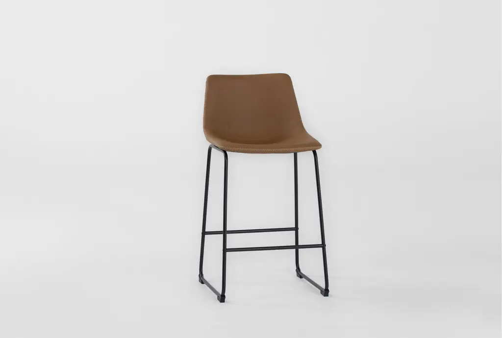 The Cobbler Mocha 26" Faux Leather Bucket Seat with Baseball Stitch Counter Height Stool is a stylish addition to any modern dining room or kitchen. Its cognac faux leather seat, combined with black metal legs, offers a sleek and contemporary look. The tight back design ensures comfort and support while dining or socializing.