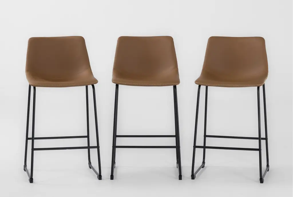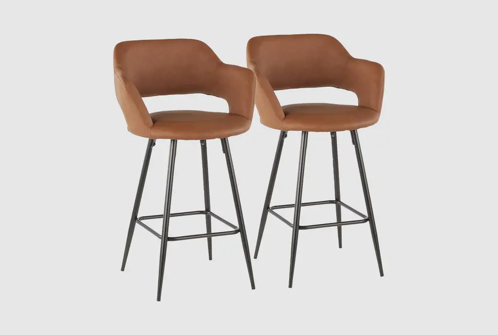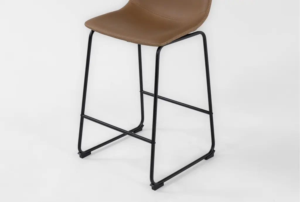 Enhance your dining or kitchen area with the Cobbler Mocha 26" Faux Leather Bucket Seat Counter Height Stool Set. Designed in a modern style, this set of 2 stools features a sleek cognac color with black accents. The faux leather bucket seats provide comfort and support, making them perfect for long meals or casual gatherings.