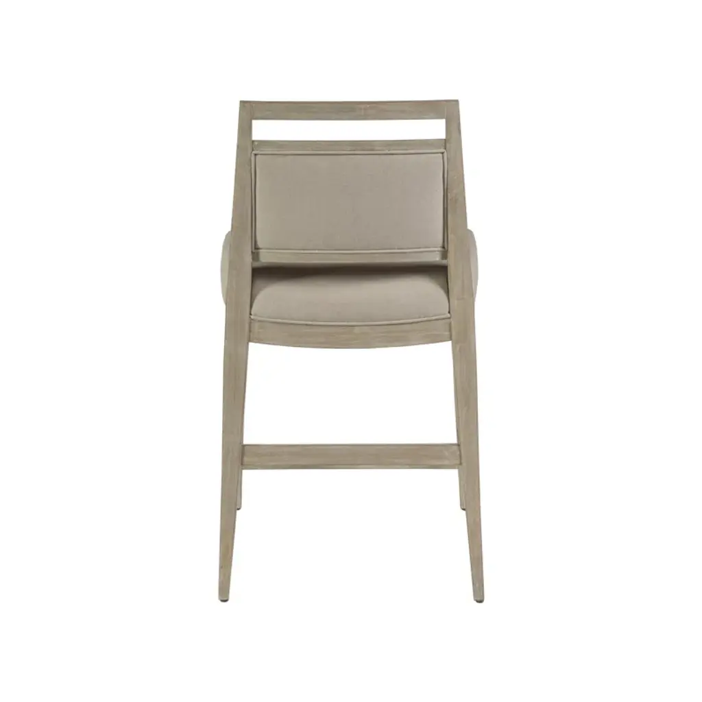 Mid-Century design in mahogany and select hardwoods. The upholstered stool is available in standard fabric, a linen and cotton blend with a soft hand in a natural greige coloration. The Antico upholstery finish is a warm medium brown tone with a hint of gray.