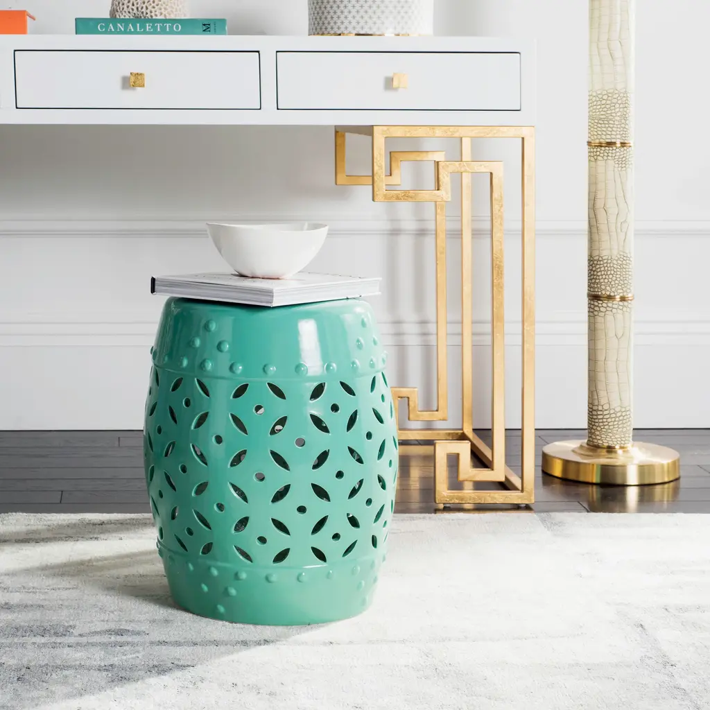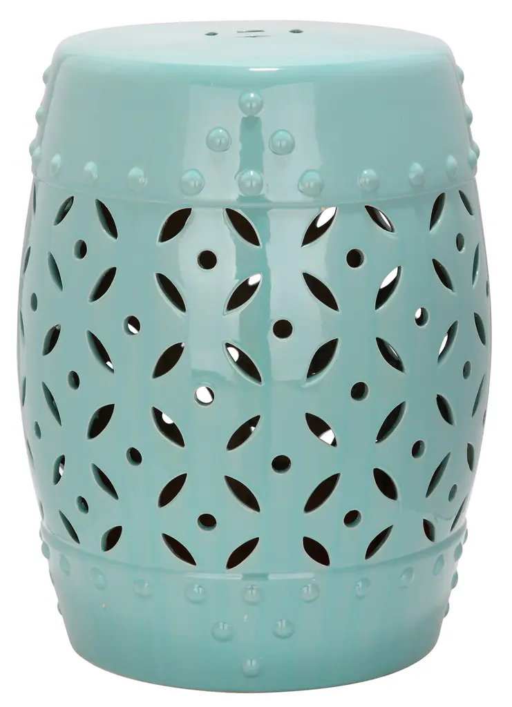 East meets West in the Lattice Coin Garden Stool.With classic Chinese drum shape, coin motif and faux nailhead detailing inspired by ancient water vessels, this ceramic stool with robin’s egg blue glaze is fashion right for any decorating style from traditional to transitional. Wipe with damp cloth. Avoid the use of chemicals and household cleaners as they may damage the finish. Suitable for outdoor use, avoid extreme temperature and store indoors during long periods of inclement weather.