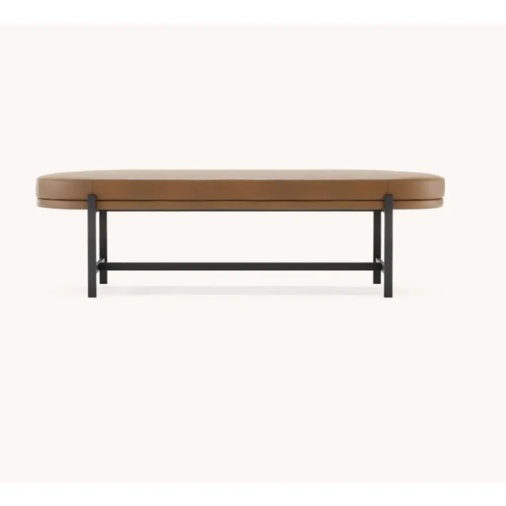 Colbert S stool by DomkapaDimensions: W 129 x D 45 x H 45 cm.Materials: Natural leather (Desna Brandy), black texturized steel.Also available in different materials. Colbert is a discreet and elegant bench perfect for contemporary settings. With a fully upholstered seat, it features both delicate single and double-top stitching as a touch of luxury. Colbert is also characterized by an intricate metallic t-shape base with four metal legs. The oval extended shape of the seat beautifully contrasts with the raw materials and lines of the structure.This refined complementary piece goes along well alone or with any bed, combining functionality and style.Domkapa holds a tremendous passion for detailed stitching, presenting several similarities to the haute-couture philosophy focused on the value of a “made by hand”. Based in Portugal, Domkapa was founded in 2009 as a Private Label. The long and fruitful path, full of experience and achievements inspired the brand’s new identity and independence, in 2017.Domkapa challenges its team to create the perfect daily meeting between design and comfort in each piece of the brand’s collections. Our design team works side by side with the production, and this organic synergy allows the creation of innovative designs.