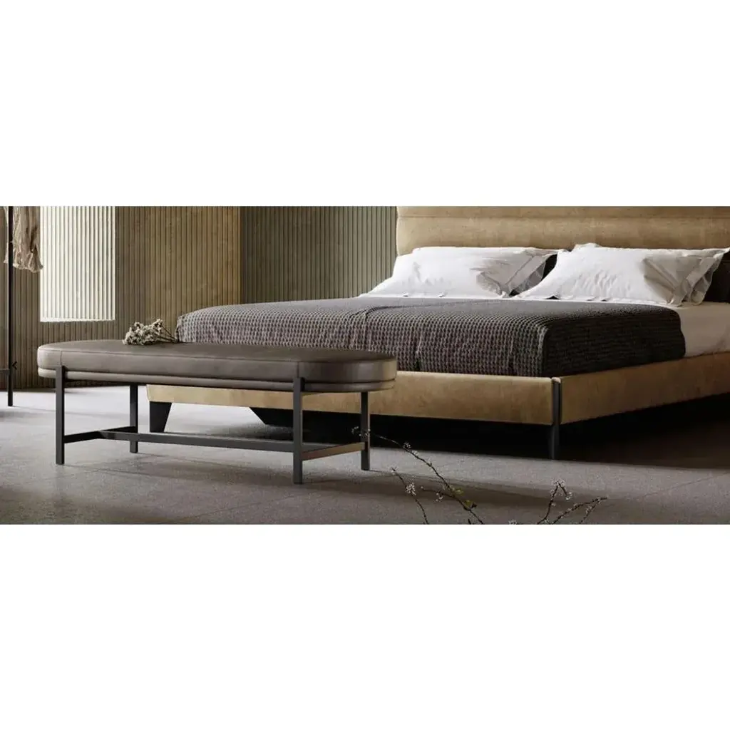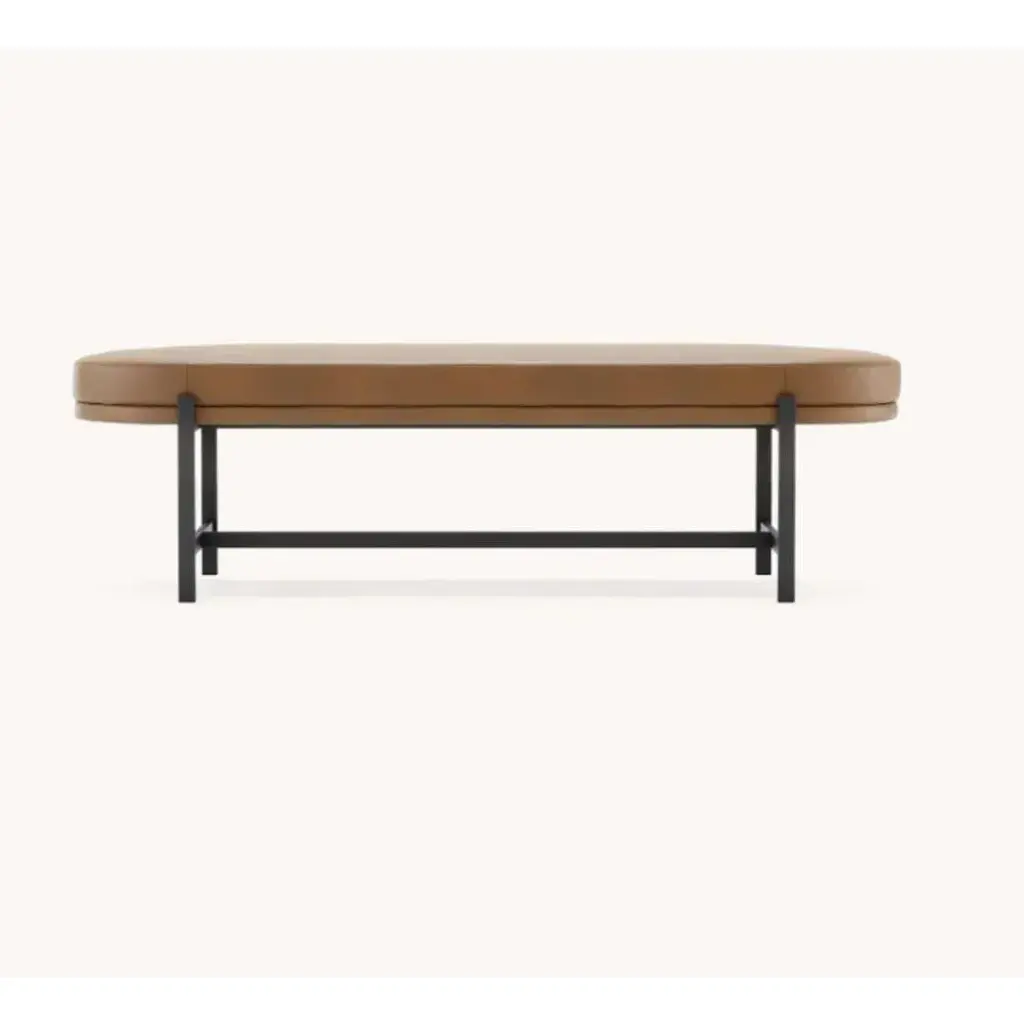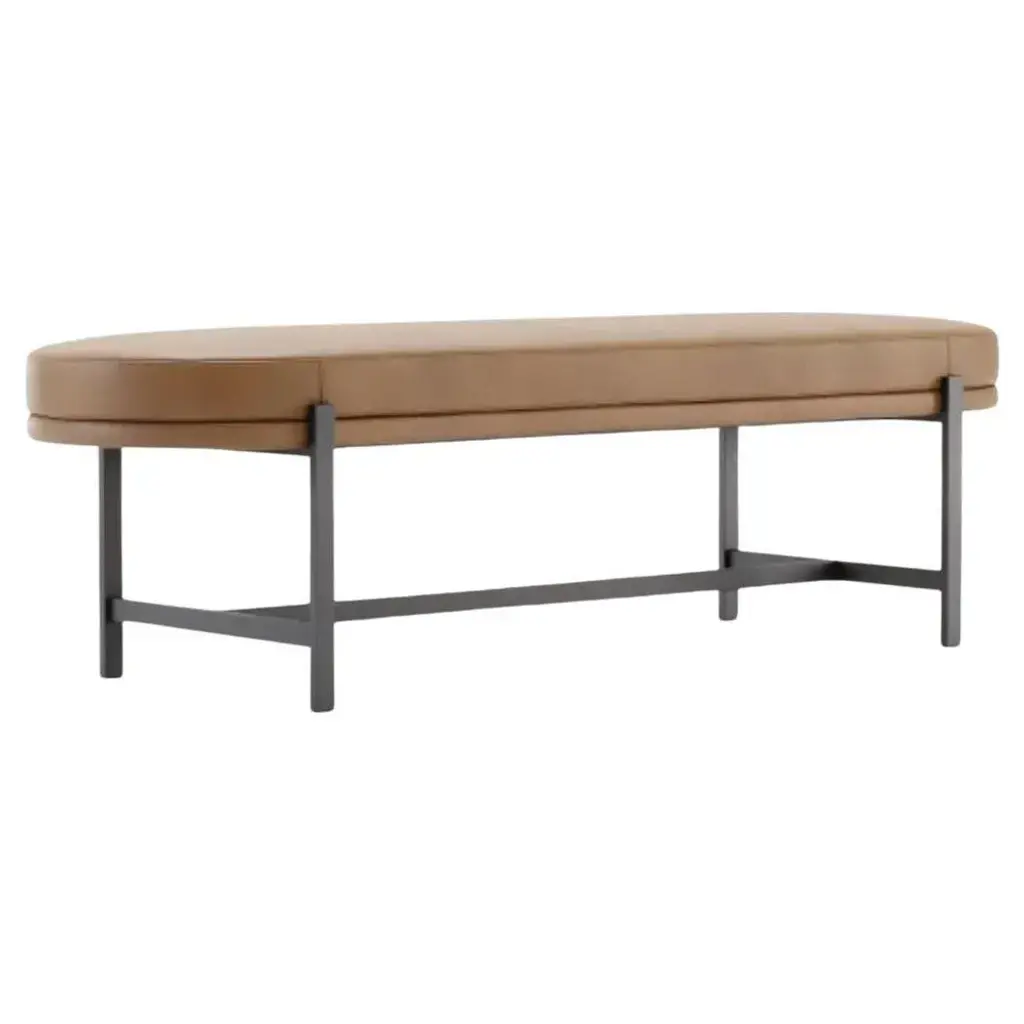 Colbert s stool by domkapa dimensions: w 129 x d 45 x h 45 cm. Materials: natural leather (desna brandy), black texturized steel. Also available in different materials. Colbert is a discreet and elegant bench perfect for contemporary settings. With a fully upholstered seat, it features both delicate single and double-top stitching as a touch of luxury. Colbert is also characterized by an intricate metallic t-shape base with four metal legs. The oval extended shape of the seat beautifully contrasts with the raw materials and lines of the structure. This refined complementary piece goes along well alone or with any bed, combining functionality and style. Domkapa holds a tremendous passion for detailed stitching, presenting several similarities to the haute-couture philosophy focused on the value of a “made by hand”.