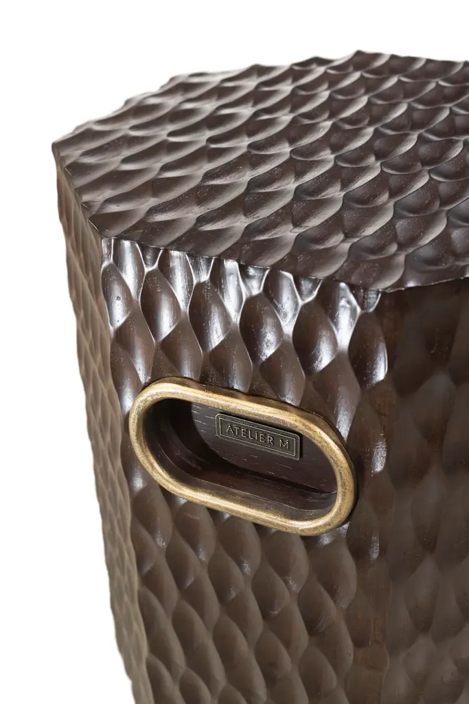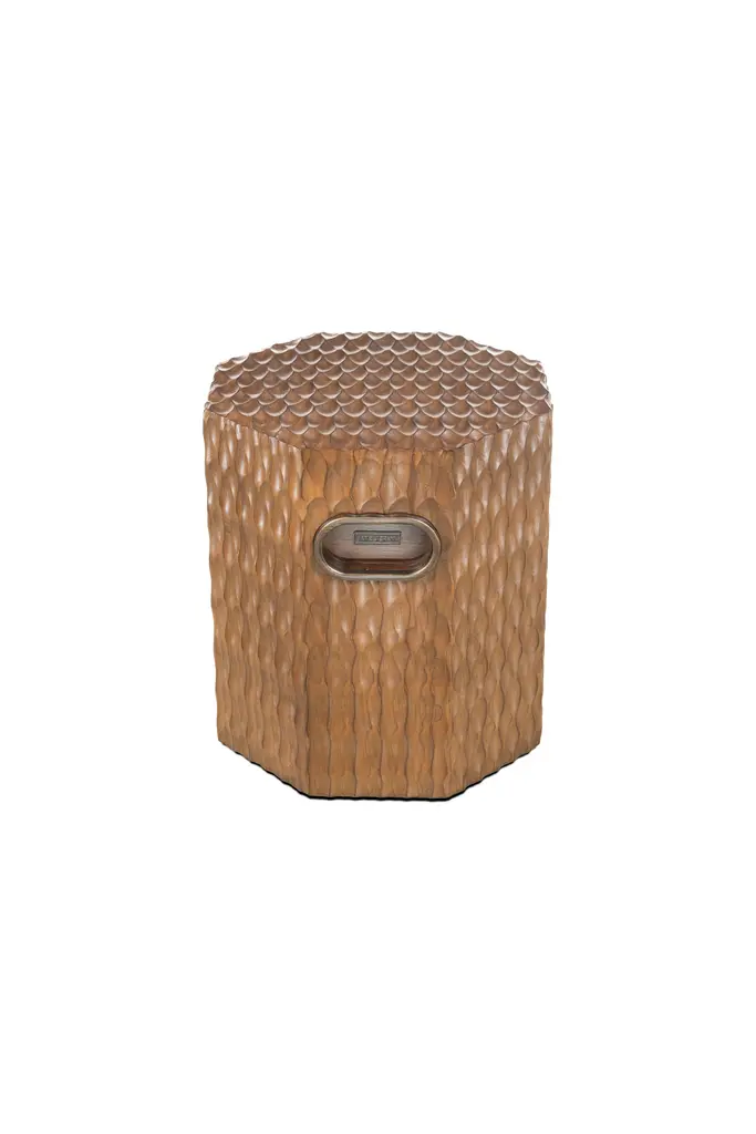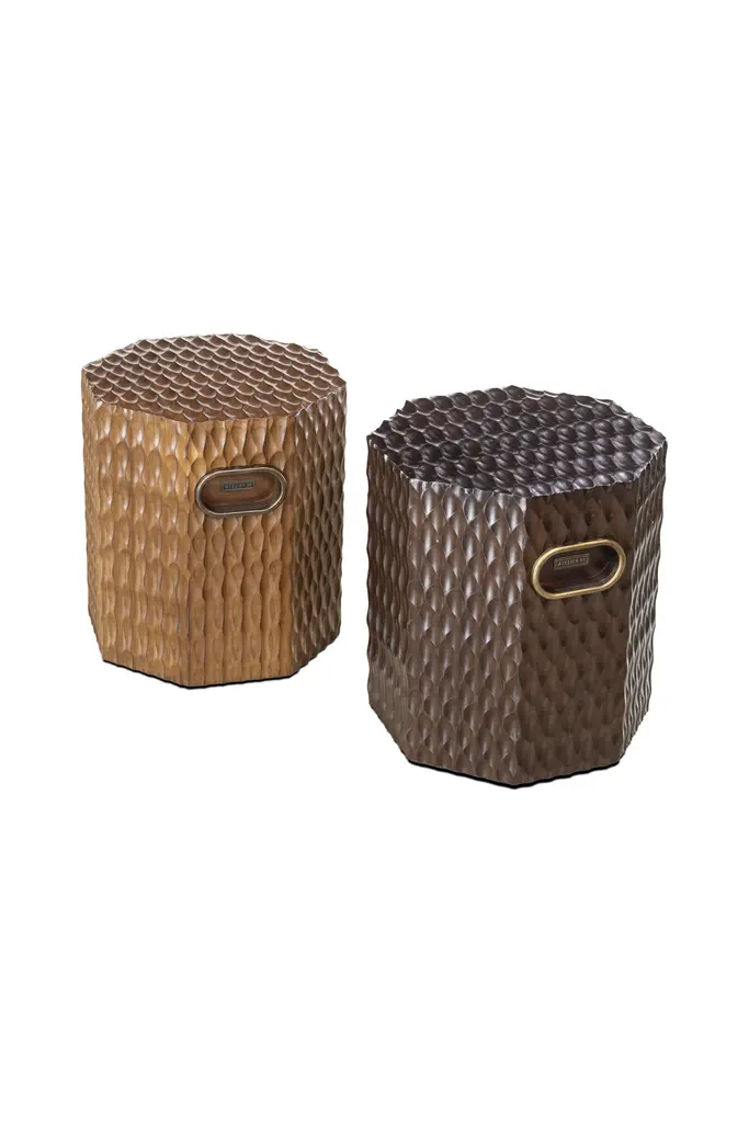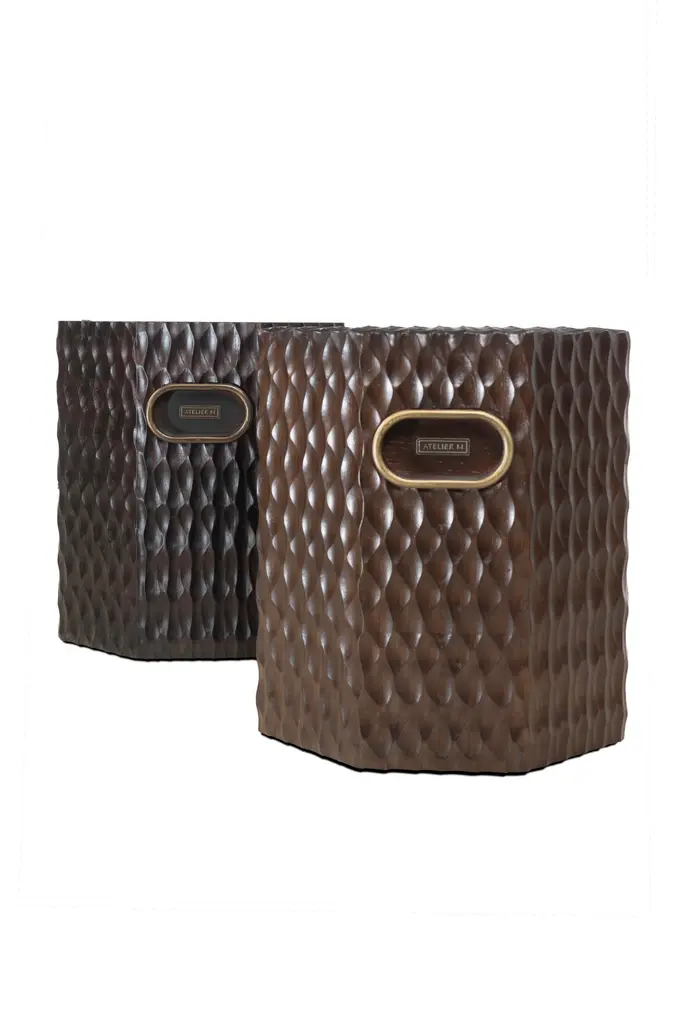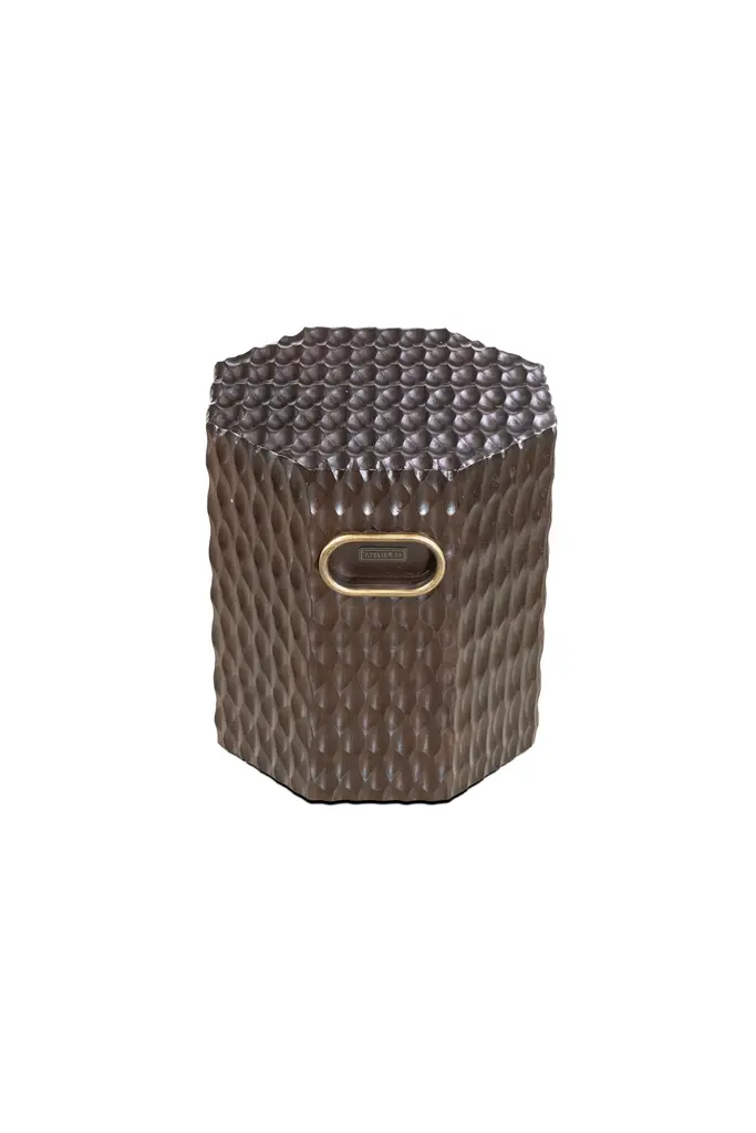 The Colmen side tables, with his solid wood base, are crafted with the ancient technique of gougée, leaving, with his concave stool, a similar texture of a beehive. Labeled by Maker