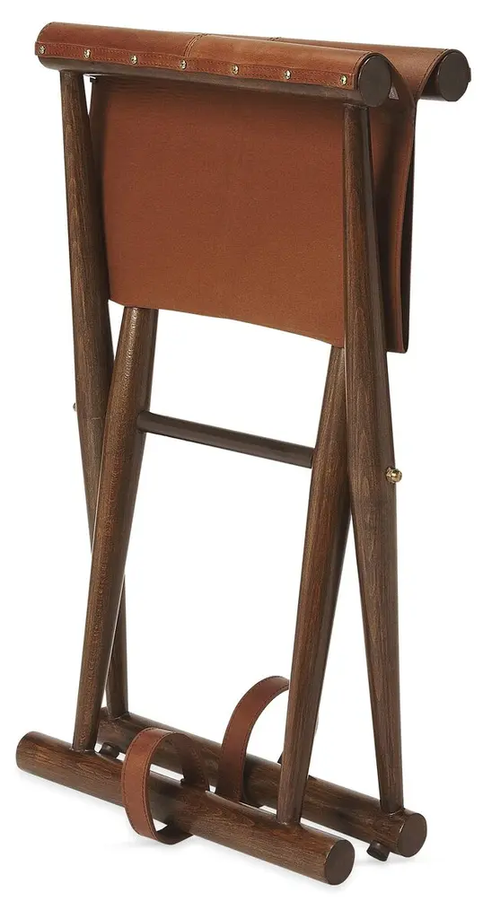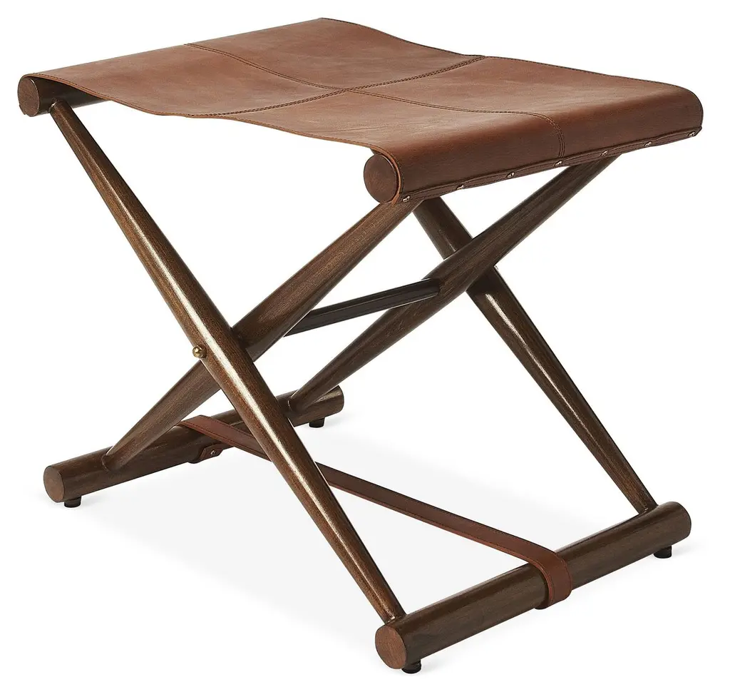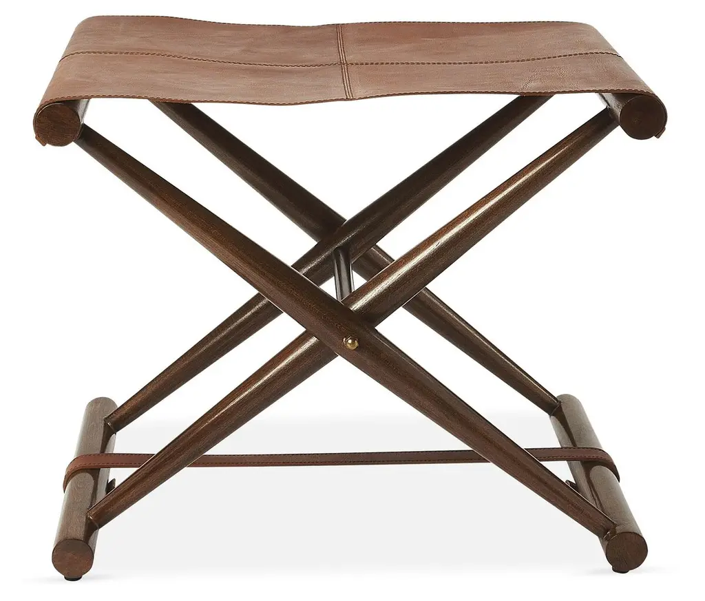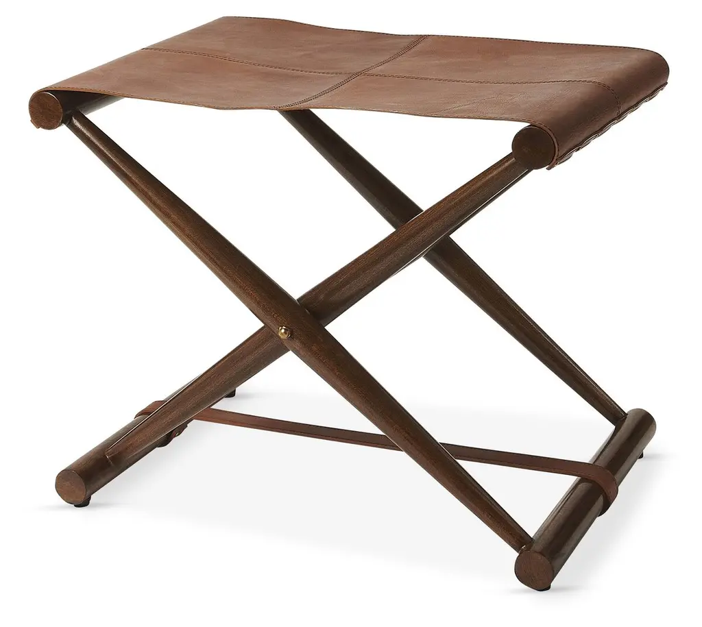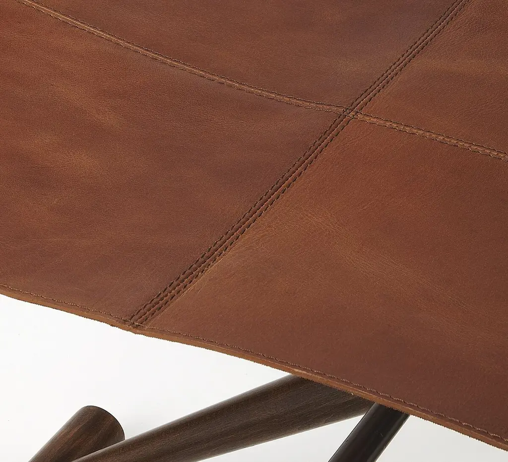 This stool is crafted of solid meranti and shorea wood with a stitched brown leather sling seat. A folding feature makes it easy to move from room-to-room or tuck away when not in use.