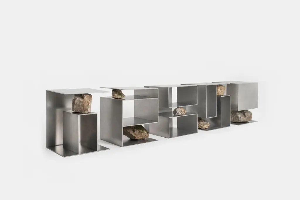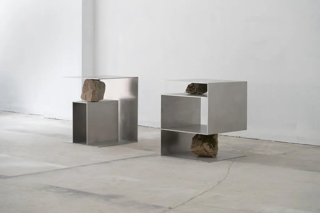 Contemporary Block Form Stainless Steel Stool With Natural Stone By Lee Sisan