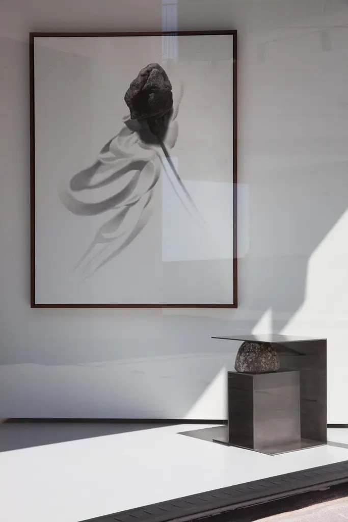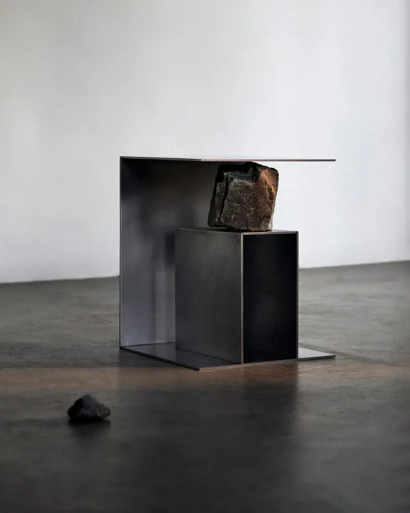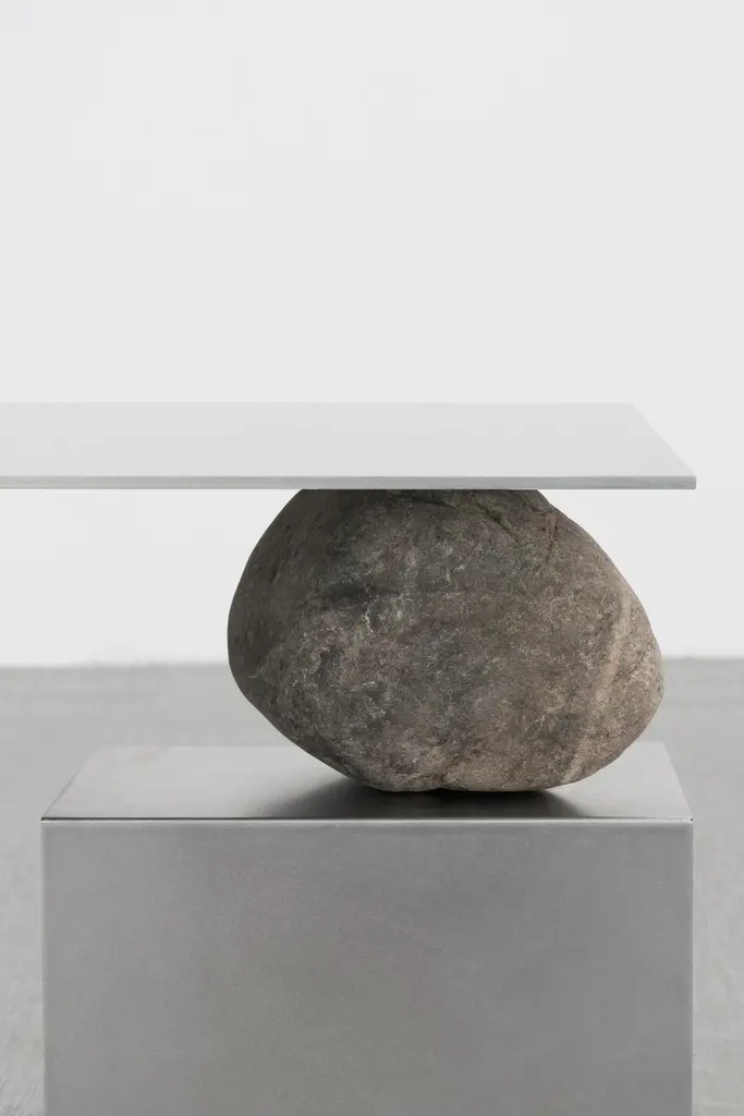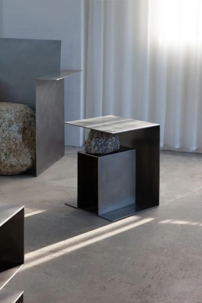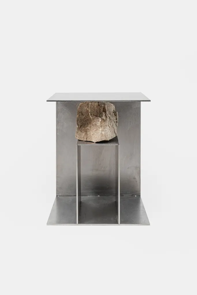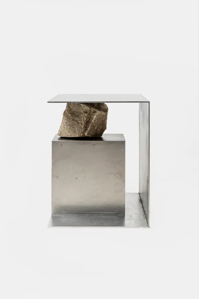 Proportions of stone stool 01 by Lee Sisan, 2019Dimensions: W 36 x D 36 x H 45 cmMaterials: Stainless steel, natural stoneEach piece is made to order and uses natural stones, so please expect some variability in design."Proportions of stone" is a modeling experiment on the fundamentality of stone cast away by natural phenomena. Consisting of tables, chairs, and other functional furniture pieces, the dimensions of each piece were determined by the stones borrowed from nature. The shapes and functions of the designs were only formed after. Stones mounted on manufactured steel plates play both structural and aesthetic roles. These juxtaposed mediums are opposite, yet balanced - fulfilling the artist's desire to "balance the relationship between nature and artifact."Lee Sisan is a designer and artist based in Seoul, South Korea. He majored in interior design to explore the relationship between nature, artifact and humans. He identifies the essence of the material and make form of refined language. He conducts experiments in which man-made beings coexist in harmony with nature and maintain balance.