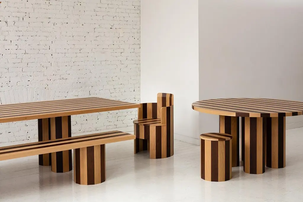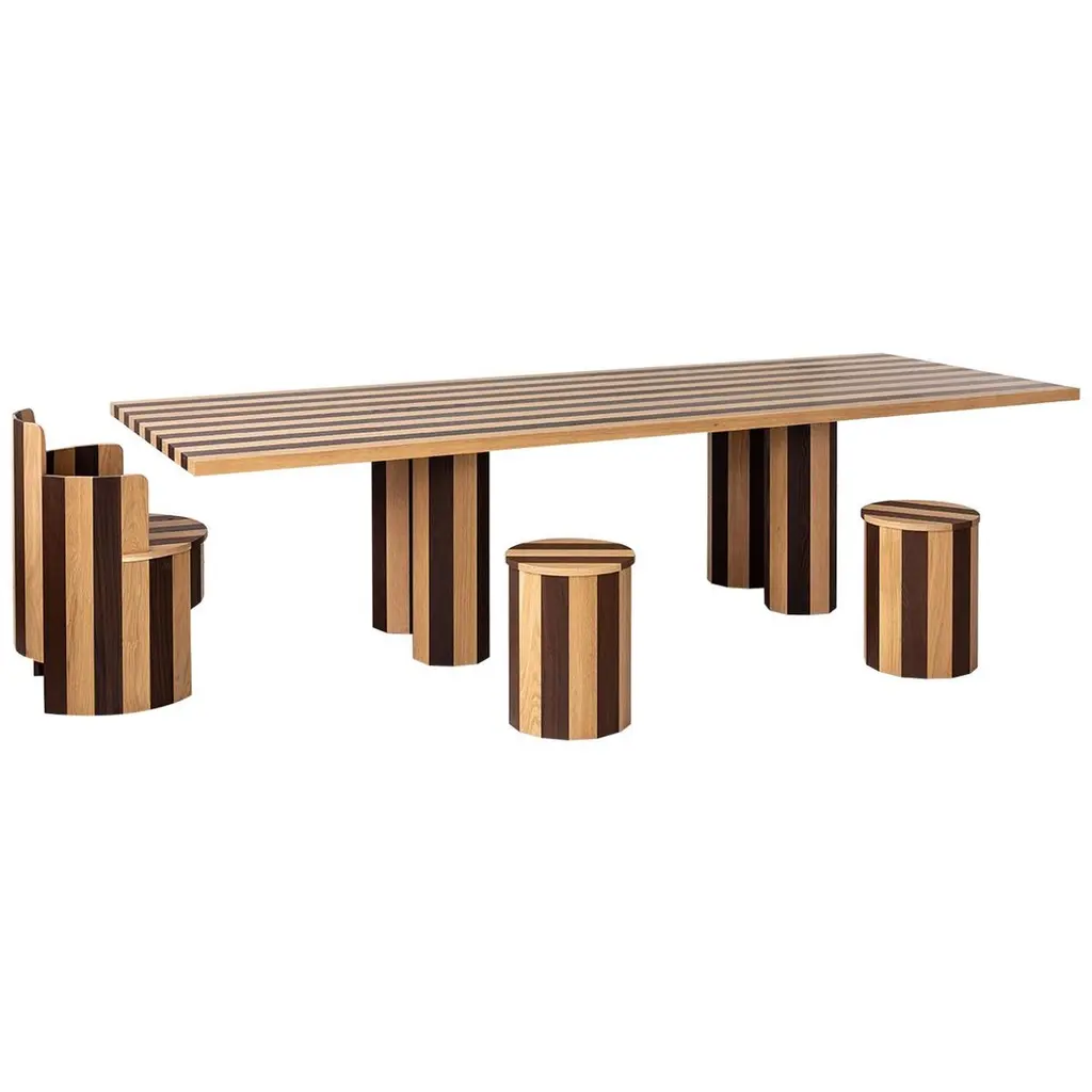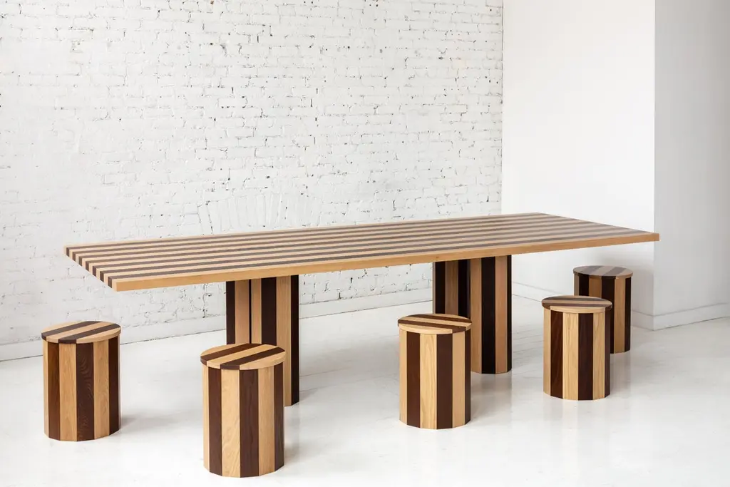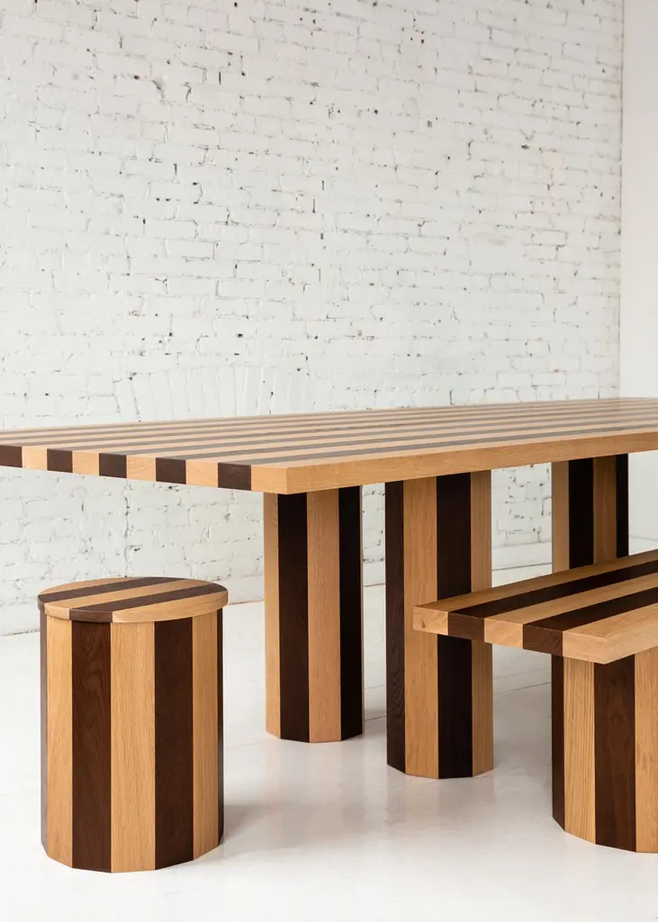 This stool is a part of the new Cooperage Dining collection. Each piece features large faceted round elements that with its namesake reference the traditional cooper's trade of making barrels.The stool is shown in a bold palette of contrasting light and dark wood, which is natural white oak with torrefied oak. Torrefaction is a roasting process that produces the natural, darker color. Each contrasting board has a consistent dimensional width forming a strong visual thread, giving depth to the minimal forms and creating a somewhat camouflage effect when grouped together. Available for immediate purchase as shown.Available with a custom upholstered cushion and in a variety of solid hardwoods, including solid walnut, white oak, hard maple and ash.