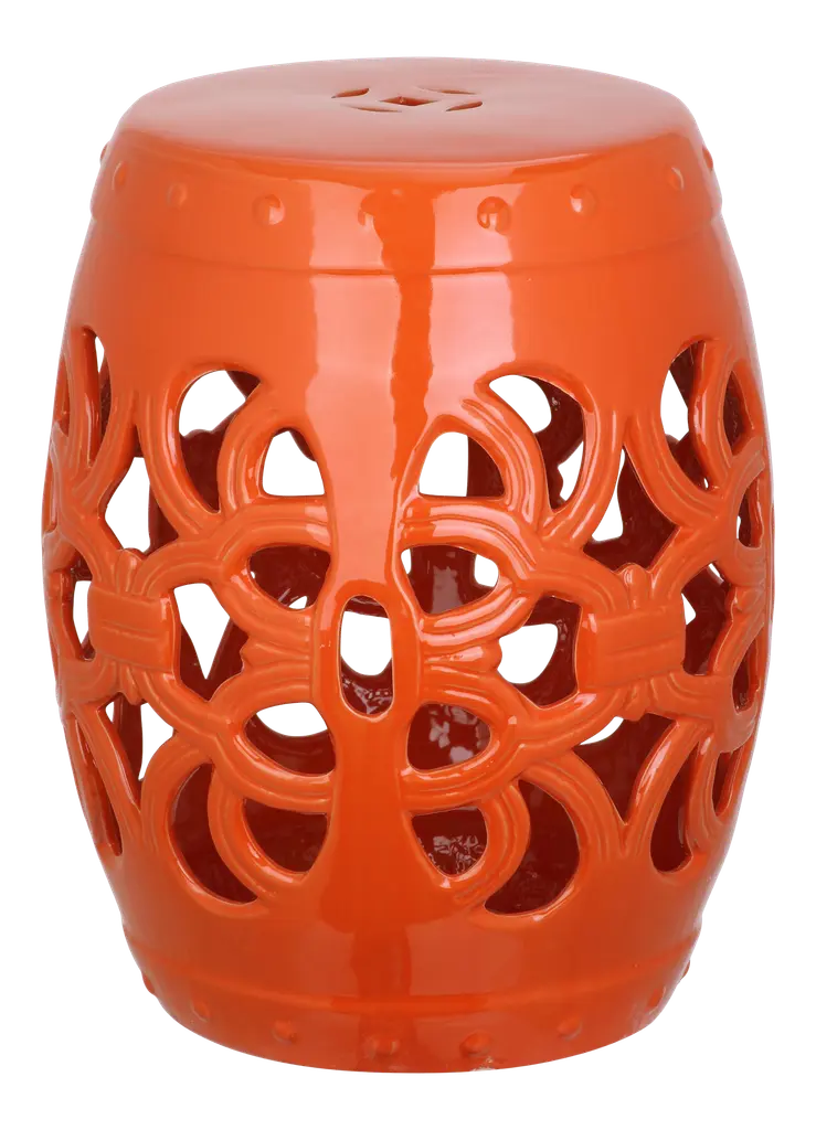 A global blend of Moroccan and Asian influences, the Quatrefoil indoor-outdoor garden stool in vivid orange is replete in boho-chic style.It four pierced medallions and decorative border are comprised of quatrefoil elements crafted from glazed ceramic. Wipe with damp cloth. Avoid the use of chemicals and household cleaners as they may damage the finish. Suitable for outdoor use, avoid extreme temperature and store indoors during long periods of inclement weather.