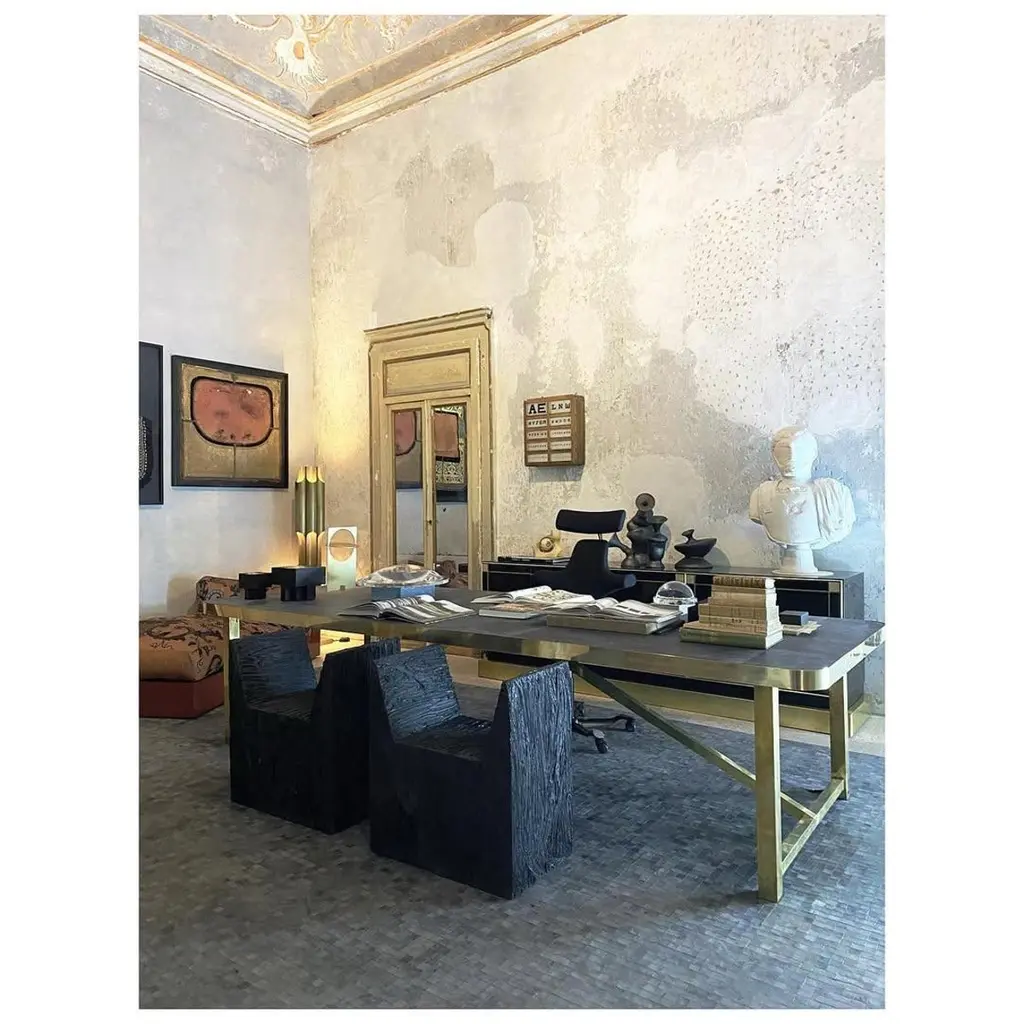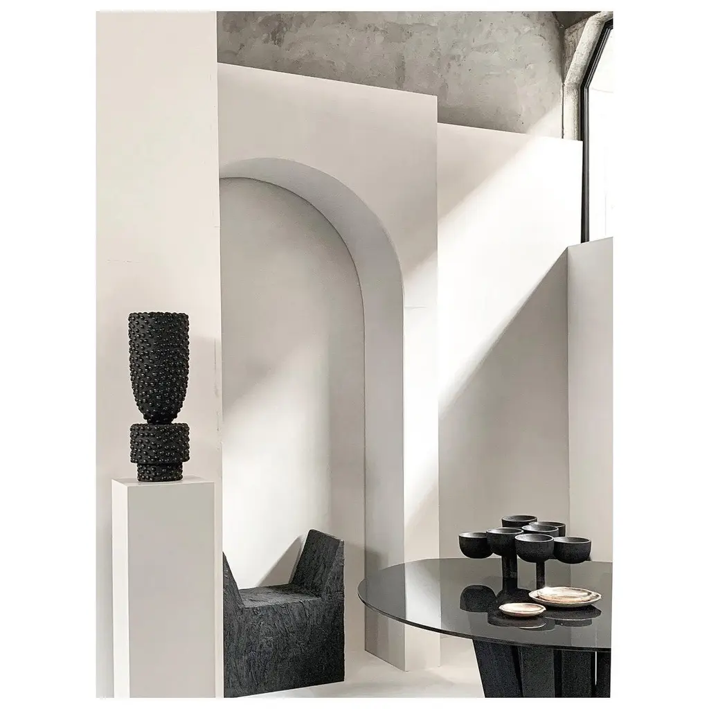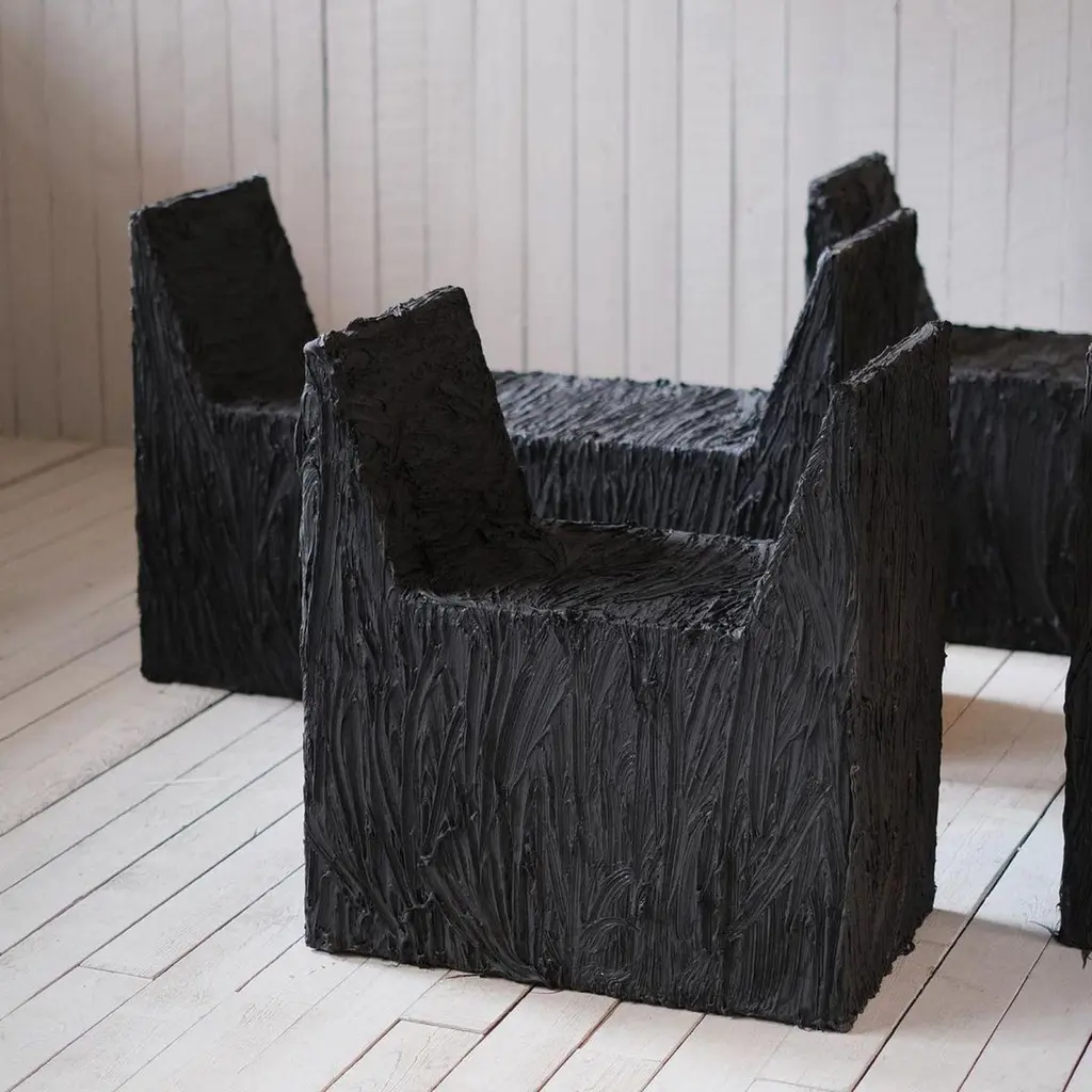 AD Rubber Stool Small by Arno DeclercqDimensions: D 38 x W 63 cm x H 69 cm.Materials: Foam and rubber.Arno DeclercqBelgian designer and art dealer who makes bespoke objects with passion for design, atmosphere, history and craft. Arno grew up in a family with parents who like to work with beautiful brands and objects.His father studied at the Royal Academy of Arts Fashion Department, he worked for Bikkembergs and made his own fashion brands, but has also collected tribal arts for more than 20 years. His mother, who worked with his father from the beginning, bought a shoe store in 2010 where they sold brands as Rick Owens, Ann Demeulemeester, Maison Martin Margiela, ... With the interest in beauty he learned from his parents, Arno studied interior design, after learning a lot about materials and with great knowledge of history he designed interiors and opened his own gallery for ethnographic art and design.The collection has come to the idea that there are too few interiors where they no longer have the big and static vases and candlesticks that the people had in big houses over 100 years ago. By focusing on architecture, ancient arts and design, after war buildings, defence buildings (bunkers and fortresses) and tribal arts, he created a collection that became a classic. Each piece is unique because it is entirely handcrafted by him. Made of tropical hardwood called Iroko this he discovered after one of his many trips to West Africa interested in voodoo arts.In these strange tribal arts, the wood "Iroko" is used in many objects, according to their culture, the ancestors lives in these trees, and they also call this tree "the king of the forest".Arno also combines this with Belgian Oak, that dried for more than 30 years, wood that was provided for the many furniture makers in Mechelen.By treating these objects through the Yakusugi technique or another mentioned "Shou Sugi Ban" an ancient Japanese technique where the objects are burned to protect the wood from weathering and subsequently fixed to get a patina look as long as possible. This gives each object a unique texture.