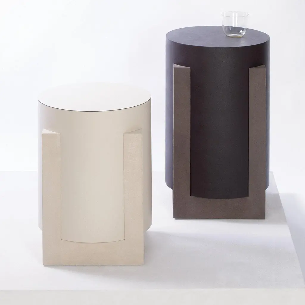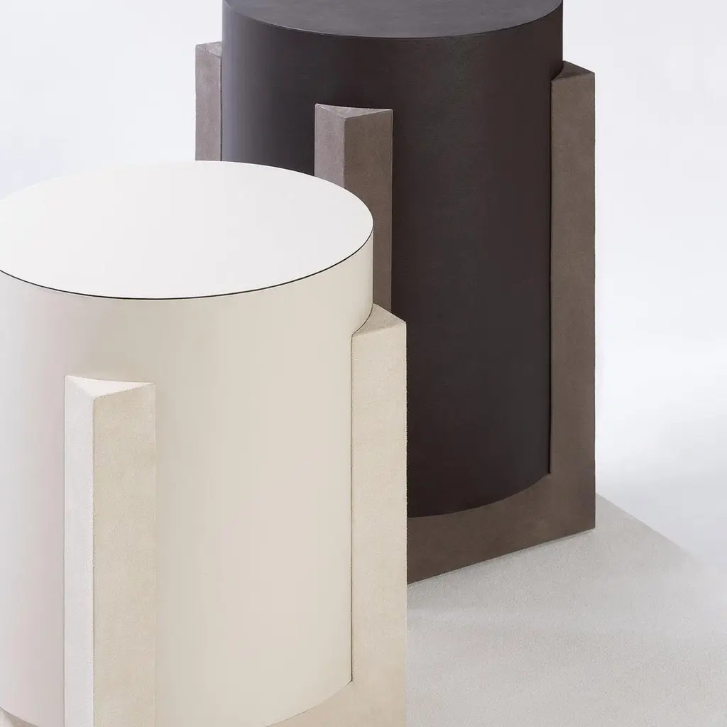 Contemporary leather stool - Palazzo by Stephane Parmentier for Giobagnara.The object presented in the image has following finish: F95 Off White Nappa Leather and A06 Ivory Suede Leather (base).Characterized by an intersection of pure shapes that exude a strong architectural allure, this elegant stool features a white leather cylindrical base enclosed by an inverted C-shaped base of white suede. The Palazzo Collection pays tribute to the Novocomum building in Como designed by Giuseppe Terragni, one of the first examples of modern architecture. The central body is available in nappa, printed calfskin, and suede, while the base is offered only in suede.Design: Stéphane ParmentierMaterial: Golf, Suede or Nappa Leather, fully leather covered.Dimensions (in): W 12.99 x D 12.99 x H 18.11Dimensions (cm): W 33 x D 33 x H 46Made by hand, in Italy.This item is made to order. Please choose the finish that you want for your piece.