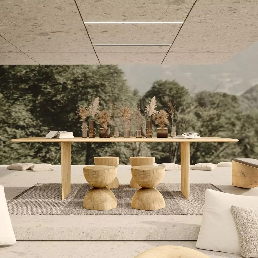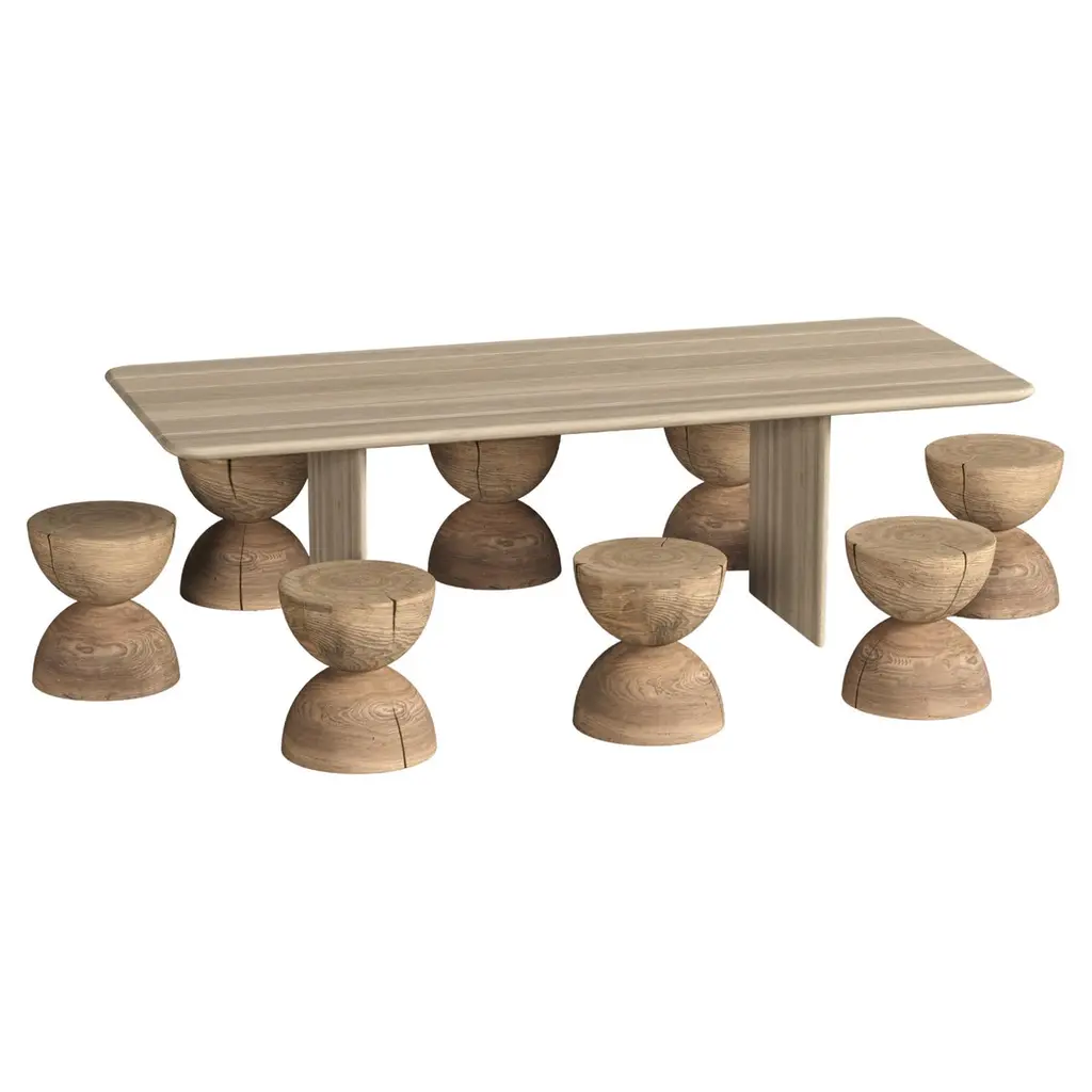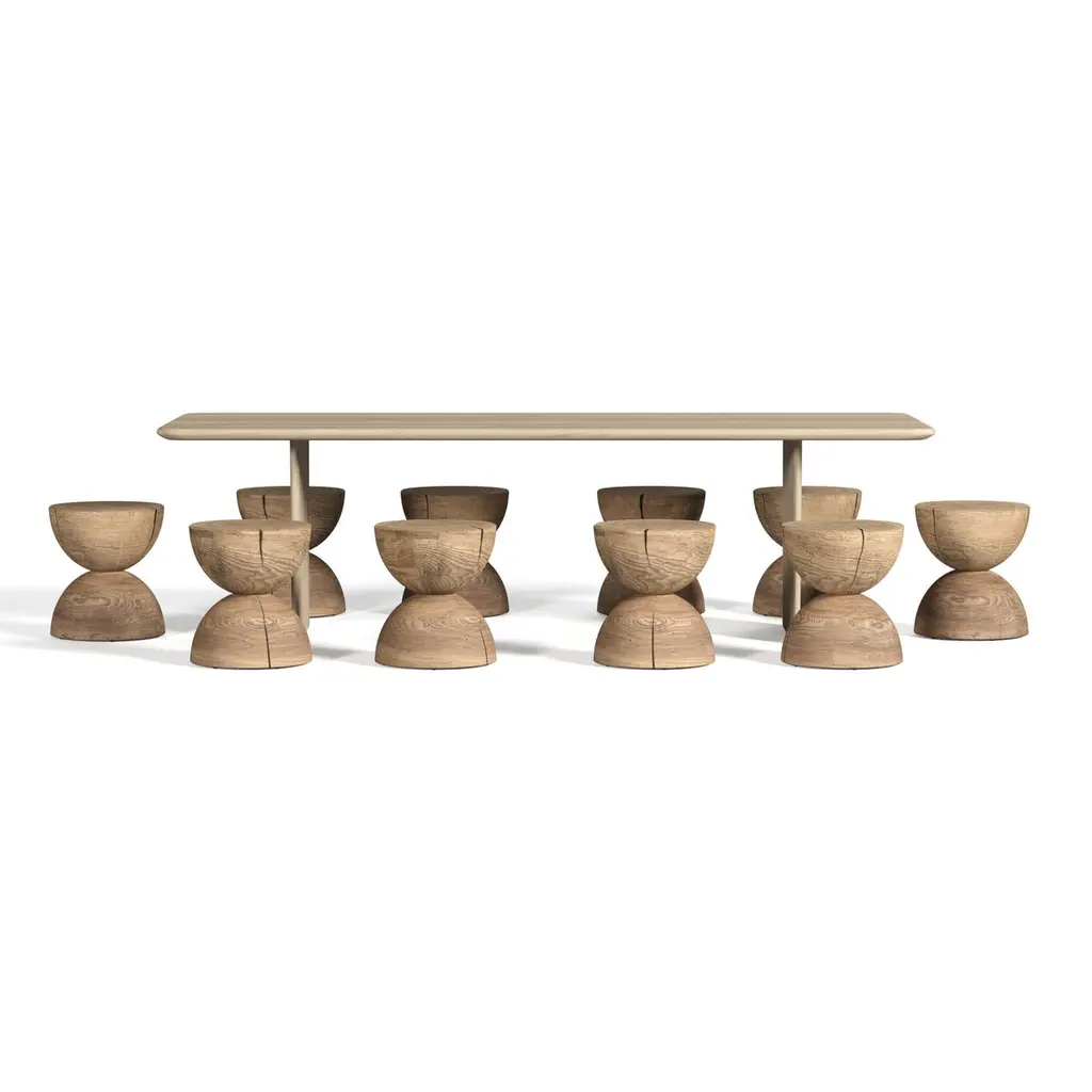 This outdoor collection, entirely crafted in Italy, features a dining table and stools made from cedar wood, all designed for outdoor use.Table with structure in cedar wood ,with smooth, rounded sides. Its top and legs have a slender appearance due to the beveled and rounded edges, giving it a graceful, flowing design.Stools made of a single block of scented cedar that features two semicircles positioned one on top of the other to form an hourglass.Stool Dimensions: 15.5" Ø x 18" HQuantity 10 stoolsCedar wood is the primary material, sourced from sustainable, controlled, and programmed cuts. For every tree that is harvested for the production of our cedar furniture, others are replanted, ensuring the cycle of nature continues. This approach ensures that nature is replenished, and we give back what has been taken, fostering environmental responsibility and sustainability.This product is crafted from solid cedar wood. Due to the natural properties of solid cedar, the following changes may occur over time, especially when placed outdoors:1. Cracks, splits, and movements in the wood are expected and should be viewed as a normal part of the material’s aging process rather than a defect. If used outdoors, these movements will be more pronounced and frequent. 2. When exposed to outdoor elements, cedar will gradually turn grey due to UV exposure and moisture. This transformation is unavoidable and occurs naturally over time.3. The appearance of mold spots or surface deposits is a natural reaction of cedar, particularly when stored in transport crates for extended periods, or covered for too long. If mold spots appear, follow these maintenance steps: - Use the provided brush to remove surface residue.- Wash the affected area with water.- Allow the piece to dry in a well-ventilated area.4. Cedar wood contains natural resins, which may surface over time, particularly on the top or bottom of the product. To prevent staining, avoid placing cedar furniture directly on carpets or soft surfaces that restrict airflow.General Care Recommendations-Keep cedar products in dry, well-ventilated spaces.-If used outdoors, understand that significant aging effects will occur, including color fading, deeper cracks, and more pronounced wood movement.By purchasing and using this product outdoors, the buyer fully accepts these natural transformations as part of the wood’s aging process.Protective water resistant and mold resistant covers are available for an addition costPlease contact us if you have any questions about customization and pricing. We will be glad to check with the factory’s technical team if sizes, finishes, and colors can be customized. We do our best to expedite production and to ship and deliver product within the listed lead time, however current lead times might be longer due to global shipping backlog and delays. These delays are out of our control and cannot be a reason to cancel an order.Our pricing includes all costs for international shipping to the U.S., as well as duties and customs clearance fees. Please be aware that local delivery within the U.S. is not included. We offer white glove, front door, and warehouse delivery options. For shipments outside the U.S., kindly reach out to us for a detailed quote.