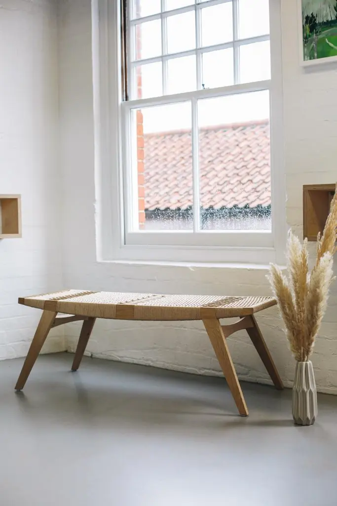 This longer bench works well at the end of a bed, in an entry corridor or as a pair on either side of a dining table.Our iconic pi stool range draws its inspiration from the 20th century modernist idiom, Scandinavian Modern design, Danish furniture, and Japanese aesthetics. Also influenced by the modern craft movement. Both modern and traditional joinery techniques are employed to manufacture in small batches from sustainably sourced oak, ensuring the best attention to detail and quality. The Danish cord seats are woven by experienced craftspeople to the highest standard.The natural plant-based oil-wax limed finish gives a beautiful matt lustre that will last for many years without the use of a petrochemical, sprayed product.Lead time is 6-8 weeks.