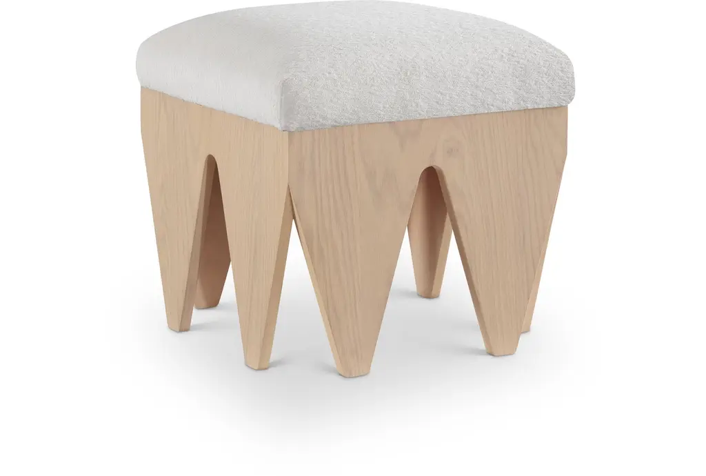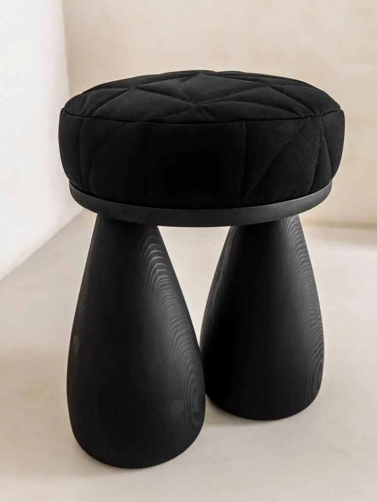 As part of Studio Sam Klemick's second collection The Quilted Cutie Stool debuted originally in 2023. The hand built wooden stool is made in Los Angeles California. The seat has be upholstered with hand quilted canvas. Signature Bell shaped legs were turned on the lathe. COM orders upon request.