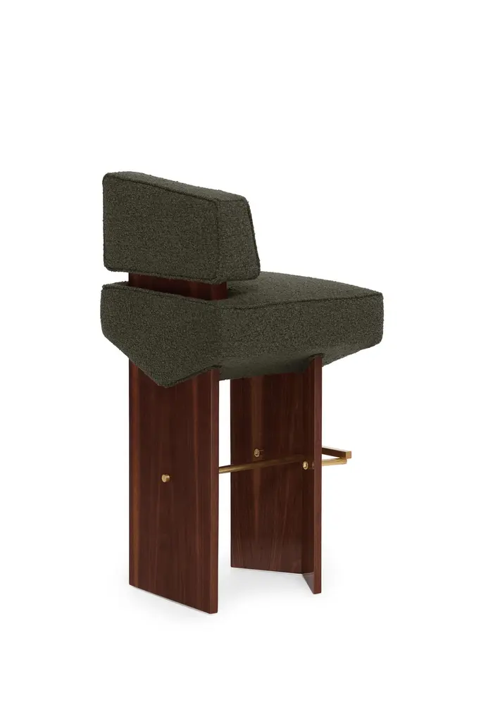 DIVERGENT Stool by Marta Delgado StudioFabric: COMColor: Olive green (more colors available)Wood: American Walnut VeenerDimensions:Width: 21.2” 54 cm Depth: 20.5” 52 cm Height: 42.9” 109 cm Seat Height: 31.9” 81 cm Seat Depth: 15.3” 39 cm-----Marta Delgado is a Portuguese artist, she founded her design studio after several years of working in furniture and interior design. The pieces signed Marta Delgado are luxurious and original. She seeks to create timeless furniture and for this she works with noble materials that will last over time.