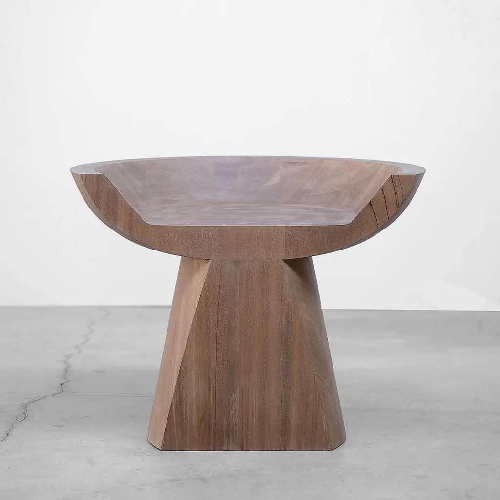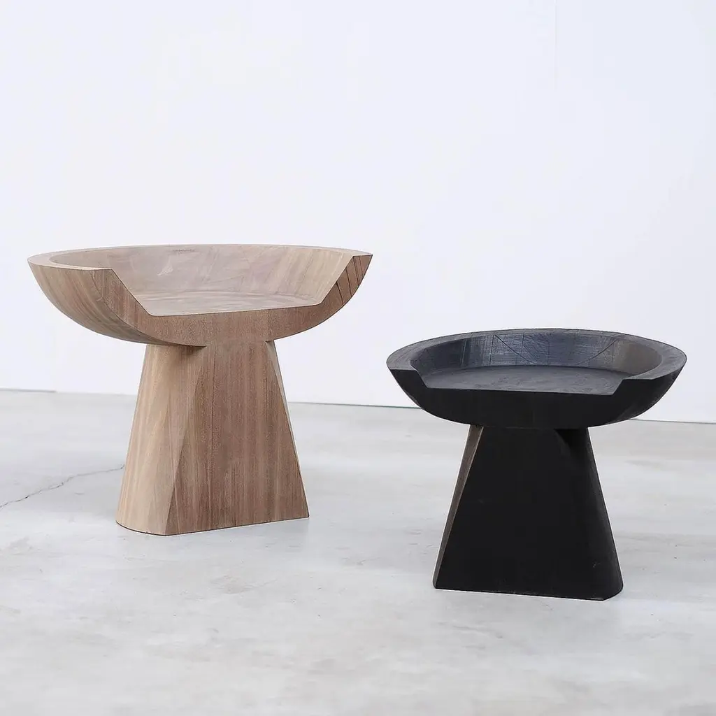 Contemporary stool In African Walnut - Throne by Arno DeclercqMaterials: Made entirely out of solid African walnutHand turned, sanded and finished with varnishDimensions: W 70 x L 50 x H 55 cm.LIMITED EDITION of 20Made by hand, in Belgium.Arno DeclercqBelgian designer and art dealer who makes bespoke objects with passion for design, atmosphere, history and craft. Arno grew up in a family with parents who like to work with beautiful brands and objects.His father studied at the Royal Academy of Arts Fashion Department, he worked for Bikkembergs and made his own fashion brands, but has also collected tribal arts for more than 20 years. His mother, who worked with his father from the beginning, bought a shoe store in 2010 where they sold brands as Rick Owens, Ann Demeulemeester, Maison Martin Margiela. With the interest in beauty he learned from his parents, Arno studied interior design, after learning a lot about materials and with great knowledge of history he designed interiors and opened his own gallery for ethnographic art and design.The collection has come to the idea that there are too few interiors where they no longer have the big and static vases and candlesticks that the people had in big houses over 100 years ago. By focusing on architecture, ancient arts and design, after war buildings, defense buildings (bunkers and fortresses) and tribal arts, he created a collection that became a Classic.Each piece is unique because it is entirely handcrafted by him. Made of tropical hardwood called Iroko this he discovered after one of his many trips to West Africa interested in voodoo arts. In these strange tribal arts, the wood "Iroko" is used in many objects, according to their culture, the ancestors lives in these trees, and they also call this tree "the king of the forest".Arno also combines this with Belgian oak, that dried for more than 30 years, wood that was provided for the many furniture makers in Mechelen.By treating these objects through the Yakusugi technique or another mentioned "Shou Sugi Ban" an ancient Japanese technique where the objects are burned to protect the wood from weathering and subsequently fixed to get a patina look as long as possible. This gives each object a unique texture.