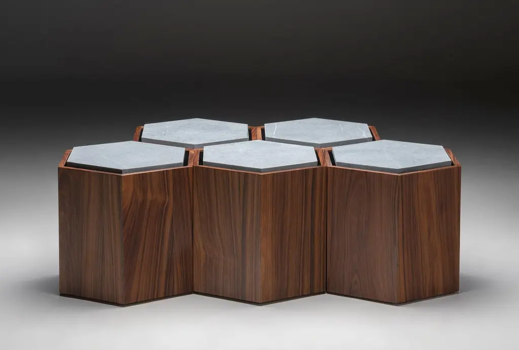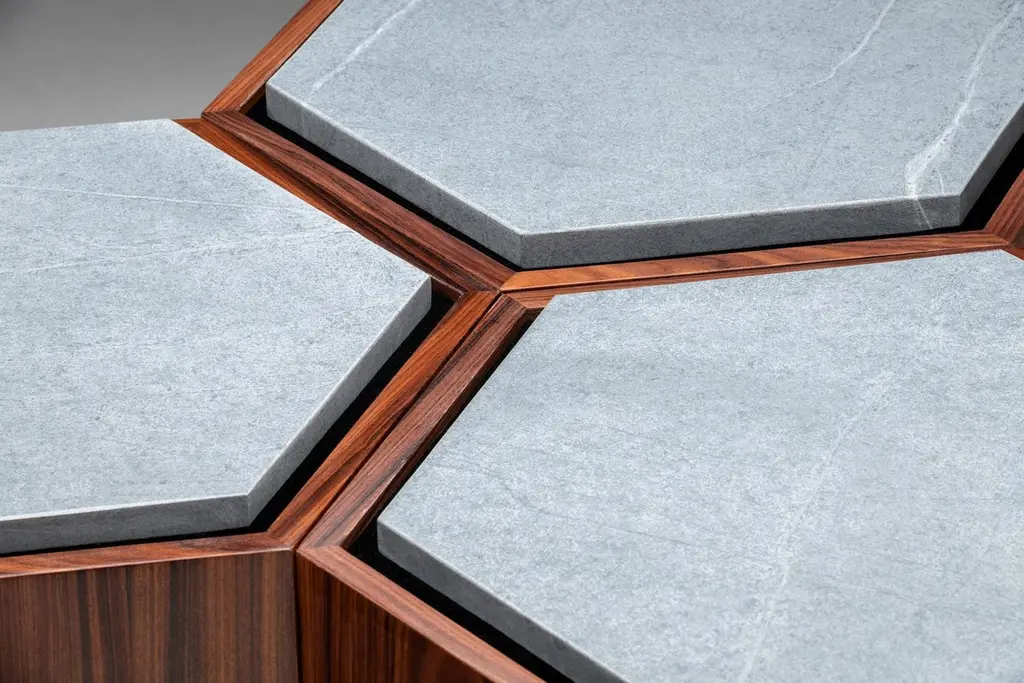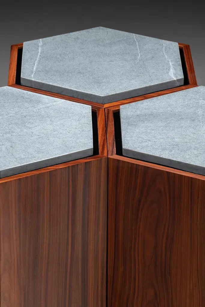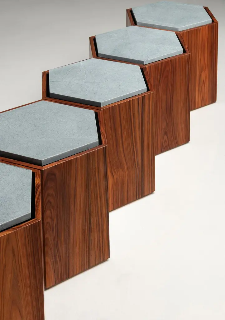 Contemporary stool or side table in walnut veneer and levigated soapstone top with the base of the stone in velvet. Can come with wheels. You can use as a set or individual.