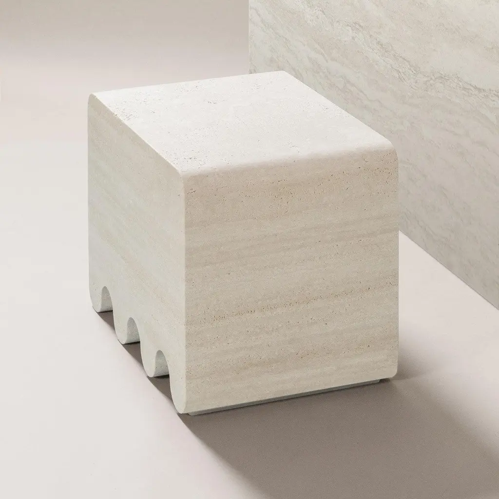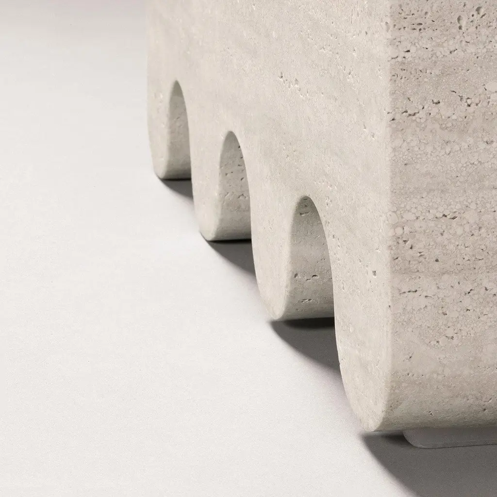 Contemporary travertine stool - ossicle by Francesco Balzano for Giobagnara.Ideally combined to the Pink Leather Stool from the Ossicle Collection, this stool will make a refined and sophisticated statement in a modern decor. Entirely crafted of white Travertine marble, it flaunts a clean and sleek design reminiscent of the pieces used in the Ancient Greek and Roman game "Jeu des Osselets", combining pure geometry and raw materials. Design: Francesco BalzanoMaterial: Travertine marbleDimensions (in): W 22.05 x D 15.75 x H 17.91Dimensions (cm): W 56 x D 40 x H 45.5Made by hand, in Italy.This item is made to order.