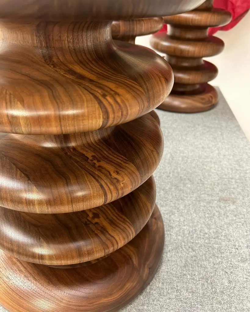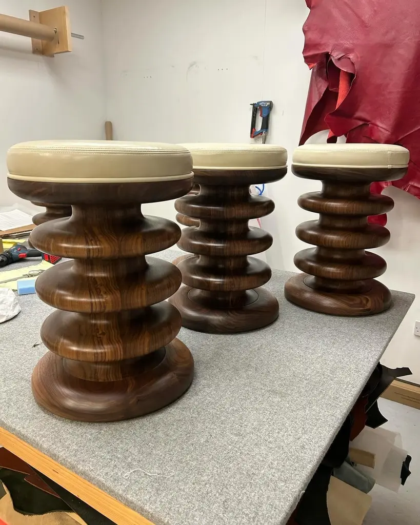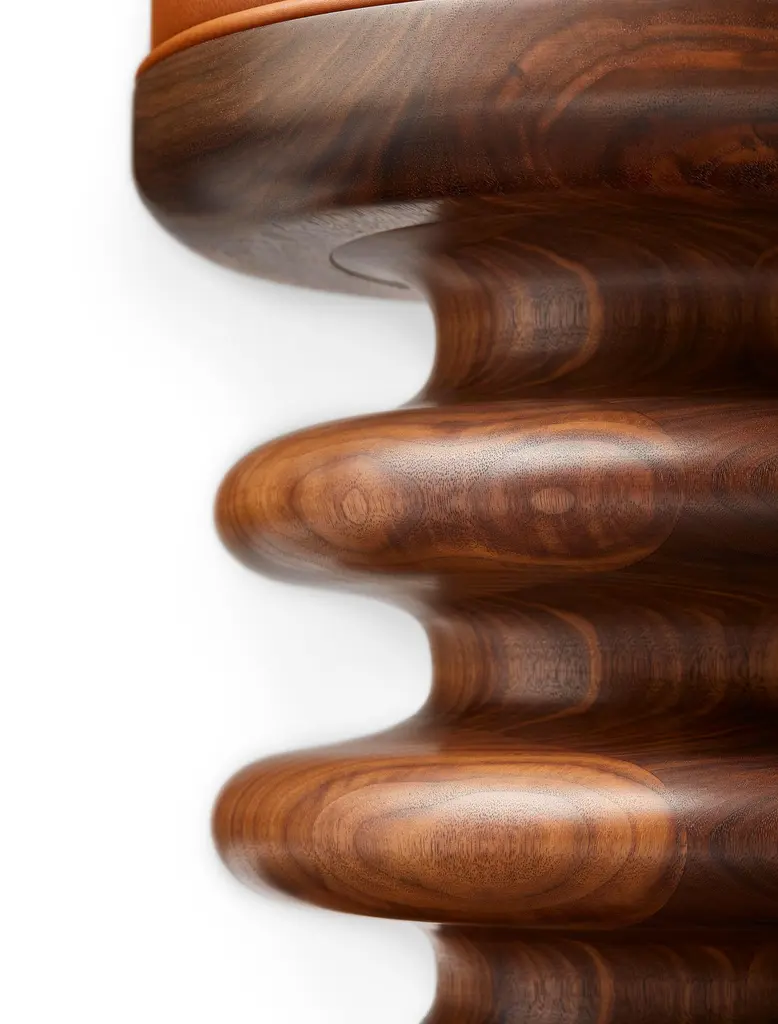Turned from solid timber, the Vertere projects an exaggerated sculptural silhouette fully accentuating the stunning beauty of walnut. Our recommendation is an oiled finish to bring out the warmth and variation of the grain.Shown here: in natural oiled walnut and off white leather. Seat pad features a twin needle top stitched detail.This piece is expertly lathe turned by hand from thick sections of solid seasoned timber, so some movement or surface checking is to be expected.Each Stuart Scott piece is built by hand in our workshop in Wiltshire, England. Nothing is mass-produced. This ensures complete attention to detail, structural integrity and sheer build quality. We never compromise. When we finish each piece, it is signed and numbered: a unique handmade masterpiece.
