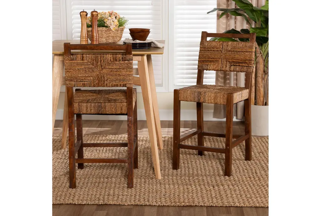 Enhance your dining room with the Cordoba Bohemian Natural Seagrass and Mahogany Wood Counter Height Stool Set. These stools blend modern style with natural materials, offering both comfort and visual appeal. The woven design and rich wood tones create a warm, inviting atmosphere.