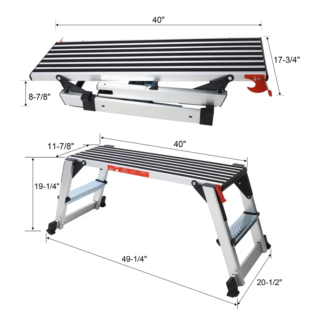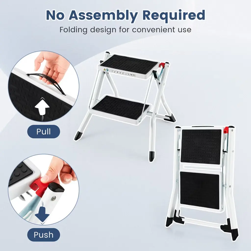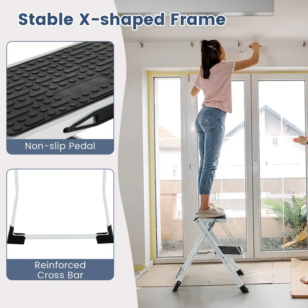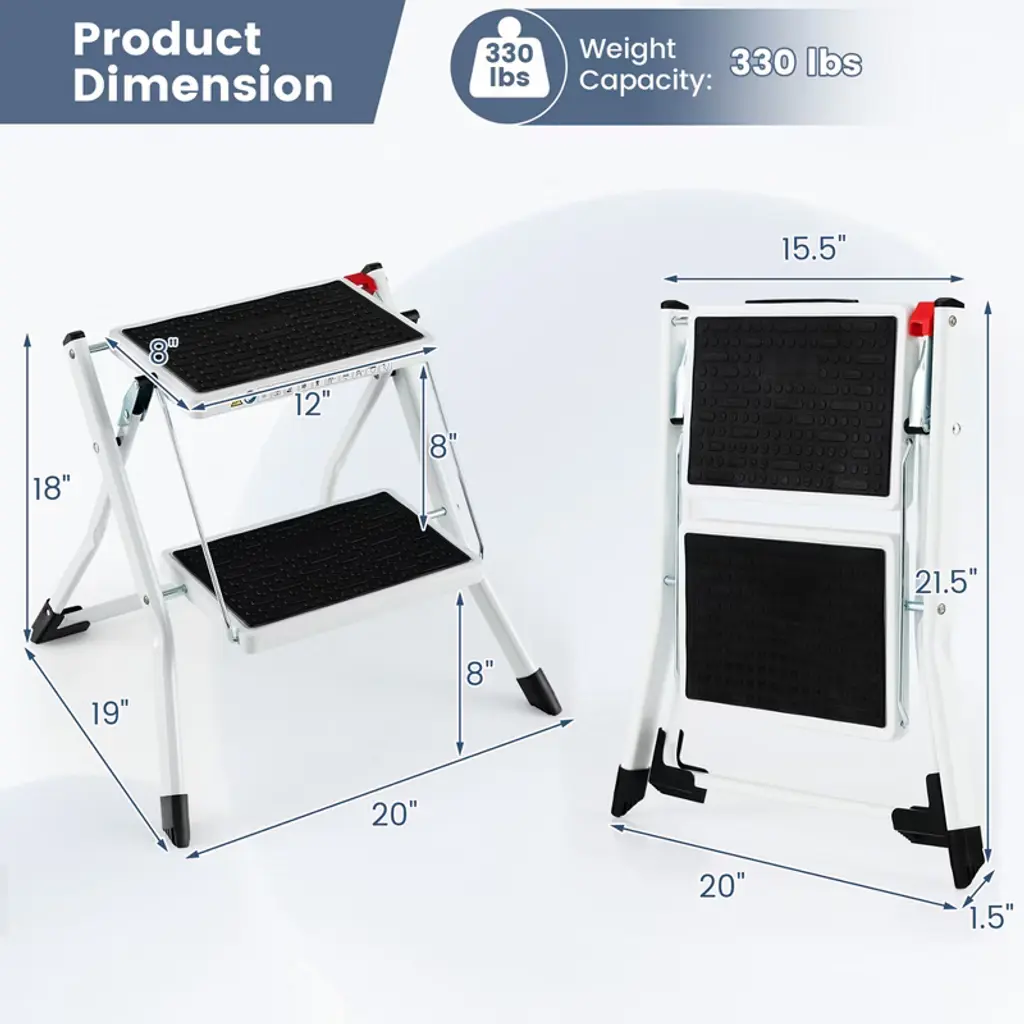 With anti-slip pedal and foot pads, you can climb up to the higher spot and get things safely. Designed with both practicality and safety in mind. This versatile 2 stepladder also can be used as a stool for small pets and kids. Constructed of sturdy metal frame with rustproof finish, the step ladder features high stability and can be used for a long time. The stable X-shaped structure and reinforced cross bar ensure high-level safety when you stand on the ladder. And you can fold it into a compact size for space-saving after finishing using it. Besides, its light weight and portable handle design allows you to carry it with ease. FeaturesHeavy-duty metal frame with rustproof finish for longer service Wide and anti-slip pedals and reinforced cross bar for added security The step ladder can hold up to 330 lbs without deformation 4 anti-slip foot pads to avoid accidental sliding during climbing The compact size is suitable for rooms with limited space Lightweight design and convenient handle for easy transportation Ideal for window cleaning, bulb changing and other occasions Suitable for the garage, garden, backyard and more No need to assembleColor: Black + White Material: Metal + PP Overall Dimension: 20'' x 19'' x 18'' (L x W x H) Folding Dimension: 20'' x 1.5'' x 21.5'' (L x W x H) Dimension of Each Pedal: 12'' x 8'' (L x W) Net Weight: 7.3 lbs Weight Capacity: 330 lbs Package Includes: 1 x Folding Ladder 1 x Instruction