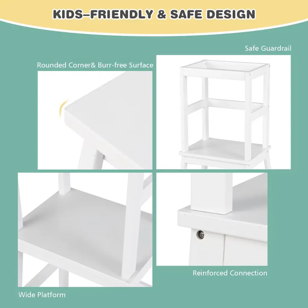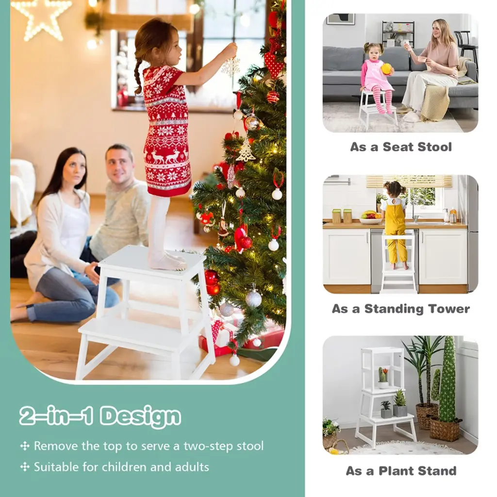 Our kid’s step stool is a must-have for 18 month-5 year old children. Standing on the step stool, kids are able to cook food in the kitchen, wash hands and brush teeth in the bathroom sink. The stable A-shaped structure, 4-point support and reinforced connection make this standing tower stable and secure enough for the child to sit in and stand without any wobbliness. Plus, the safety railings prevent toddlers from sliding out. Solid pine wood, burr-free surface and odorless painting all aim to ensure your little ones’ health and security. It’s worth mentioning that the top rails are easy to disassemble. Thus, the kid’s standing tower can be transformed into a stool and a 2-step ladder, satisfying your multiple usages.FeaturesEnable kids to participate in family activities to improve parent-child interaction Develop kid’s independence, hands-on ability, balance ability and more Made of solid pine wood to ensure the safety of children A-shaped structure and 4-point support for excellent stability Burr-free surface and round corner provide a safe environment for children Easy to remove the top guardrail Serve as a standing tower, stool, 2-step ladder and a plant stand Clear instruction and complete accessories for effortless assembly Easy to use a soft cloth to wipe the smooth and waterproof surfaceColor: White\Nature Material: Pine Wood Overall Dimension: 18'' x 18'' x 35.5'' (L x W x H) Overall Dimension without Rails: 18'' x 18'' x 20'' (L x W x H) Net Weight: 9 lbs Weight Capacity of the Standing Platform: 110 lbs Weight Capacity of the Lower Step: 55 lbs Suitable Age: 18 Months - 5 Years Old Package Includes: 1 x Kids Step Stool 1 x Instruction