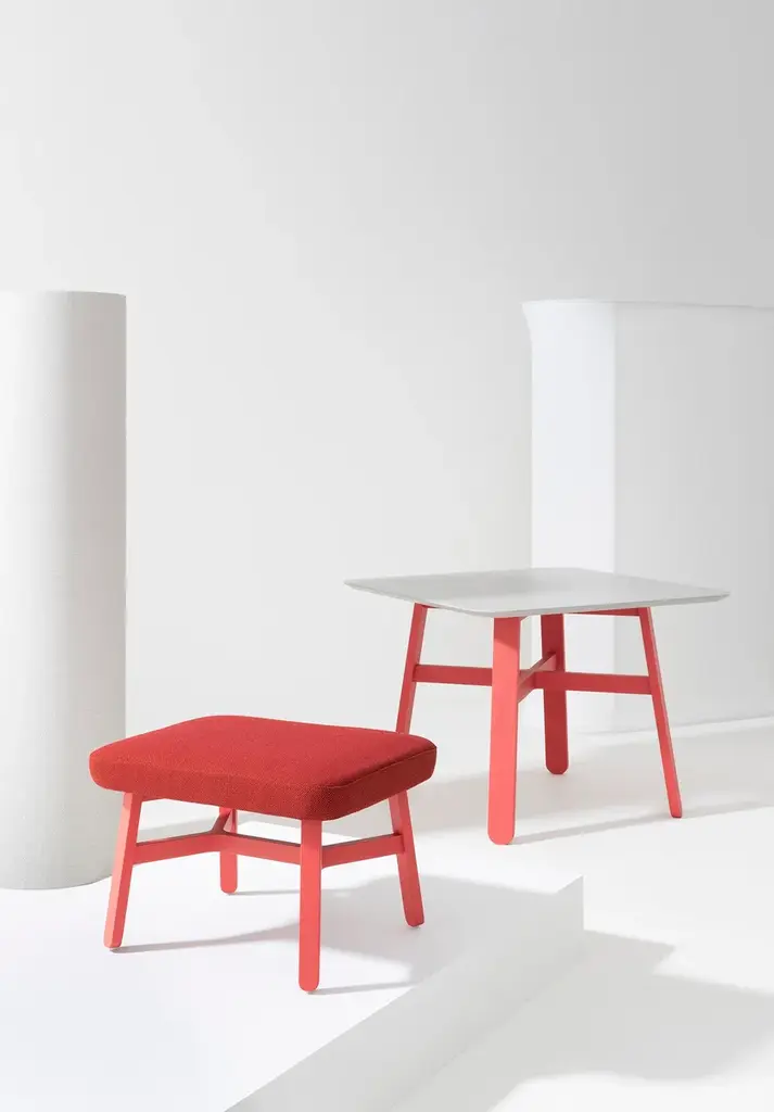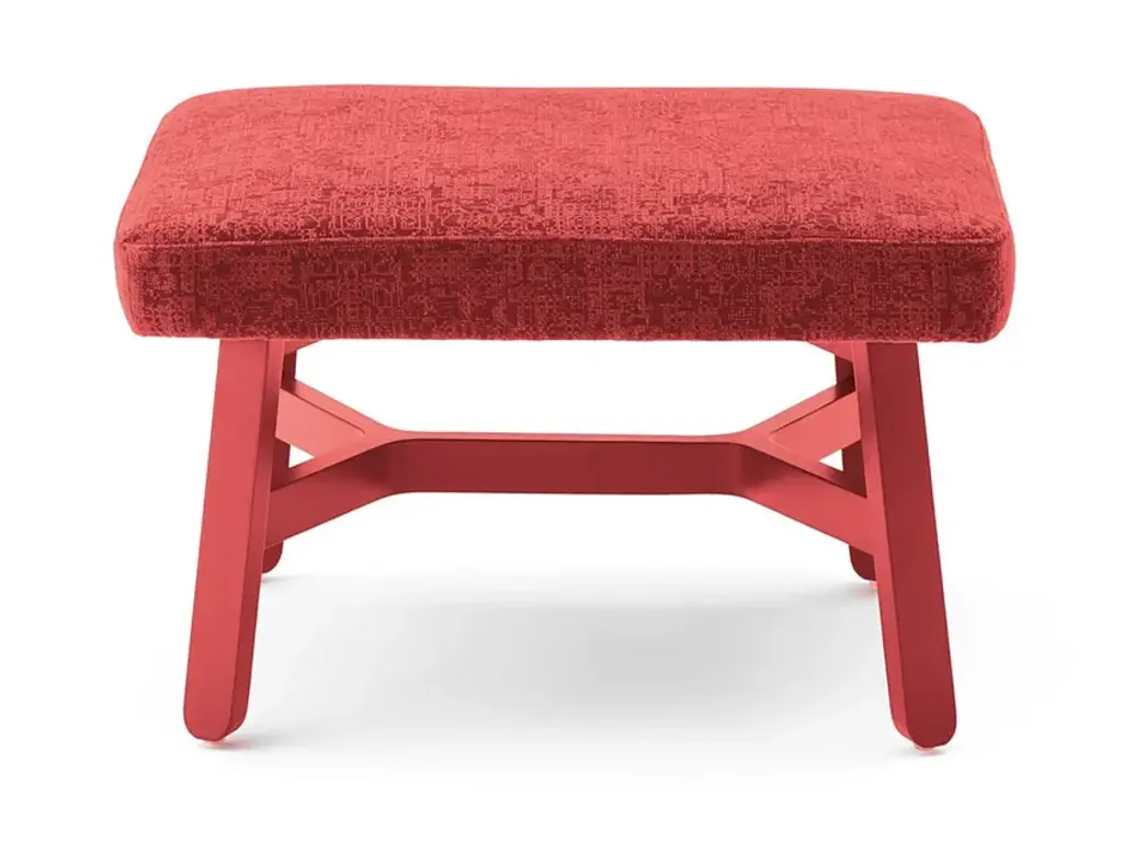 Croissant 564 is a low stool with a solid beech wood frame and upholstered seat.Croissant is a rich collection that includes chairs, armchairs, lounge seats, stools, loveseats, poufs, benches, and tables.Common features across the pieces are the cross-bracing and rounded legs, while the armchair, lounge, and loveseat share a curved backrest shaped like a croissant.This collection is designed to meet the needs of spaces that combine various functions while seeking stylistic continuity.
