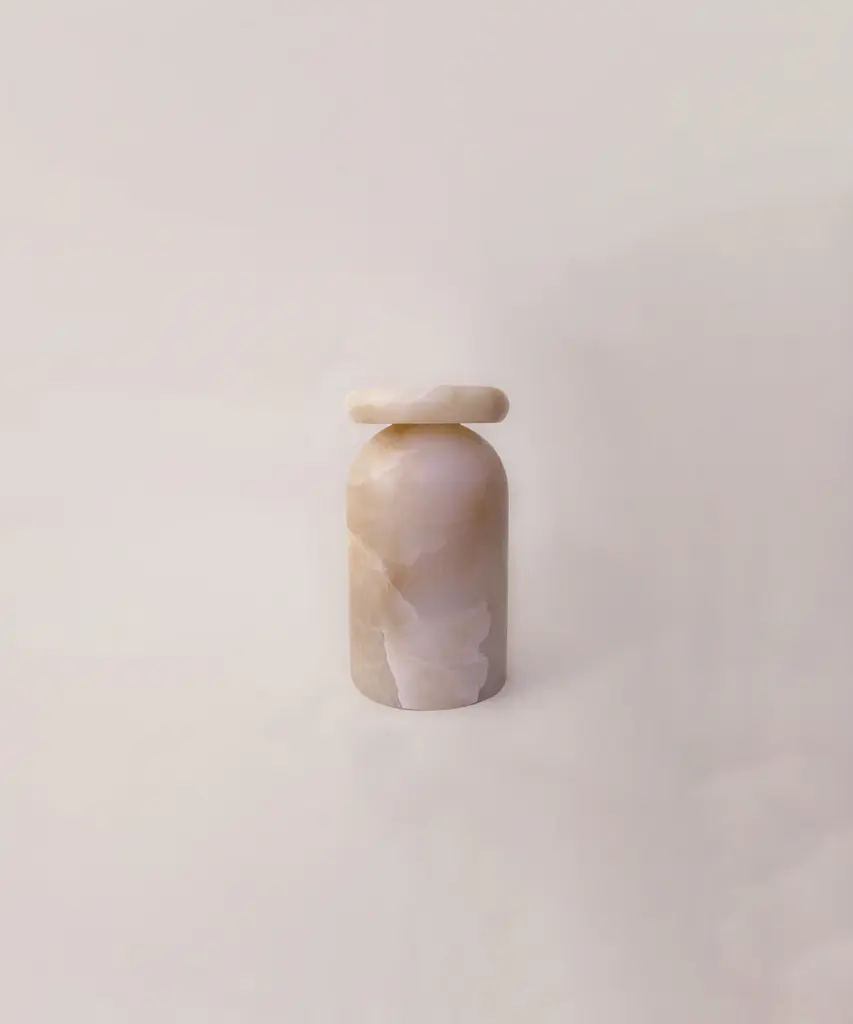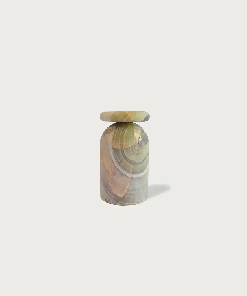 Cult stool/ side table; a hand-sculpted stone from a Mexican marble and Mexican onyx conglomerate, remits to primal sculptural-architectural language while displaying materials in a modernist manner. The piece allows for the specificity of the material’s eccentric pattern formations to rein over its final appearance. Each edition; is a unique piece. Working with rocks that are endemic to Mexico contextualizes the work at a geological level. Situating the pieces in a continuing and evolving historical narrative. Like taking part in an archeological exploration, working with native stones reveals a heritage of meticulous craftsmanship developed under the possibilities and limitations of local materials. When sculpting stone, you only get one chance to get things right. As each rock is different one must tailor form onto the material, in the way of discovering what each piece hides. Panorammma is a furniture design atelier based in Mexico City that seeks to redefine our relationship with functional objects through experimentation with materials and form.