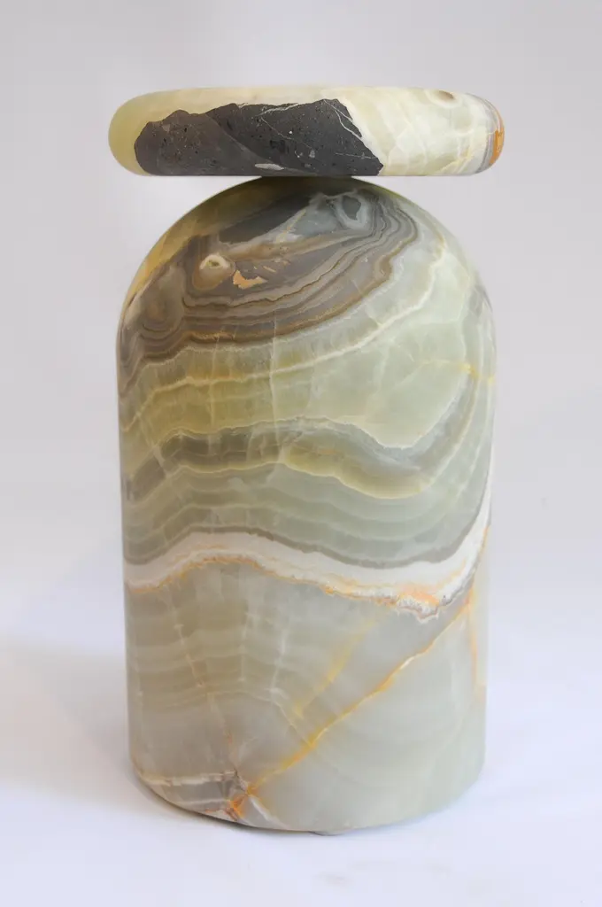 Cult stool/ side table; a hand sculpted stone from a Mexican marble and Mexican onyx conglomerate, remits to primal sculptural-architectural language while displaying materials in a modernist manner. The piece allows for the specificity of the material’s eccentric pattern formations to rein over its final appearance. Each edition; a unique piece.Working with rocks that are endemic to Mexico contextualizes the work at a geological level. Situating the pieces in a continuing and evolving historical narrative. Like taking part in an archeological exploration, working with native stones reveal a heritage of meticulous craftsmanship developed under the possibilities and limitations of local materials. When sculpting stone, you only get one chance to get things right. As each rock is different one must tailor form onto the material, in the way of discovering what each piece hides.Exhibited atEl Elogio de la Sombra- Galerie Philia: Mexico City (2024)LOVE HOUSE: New York (2023)