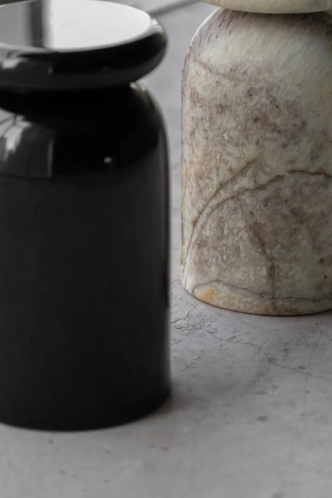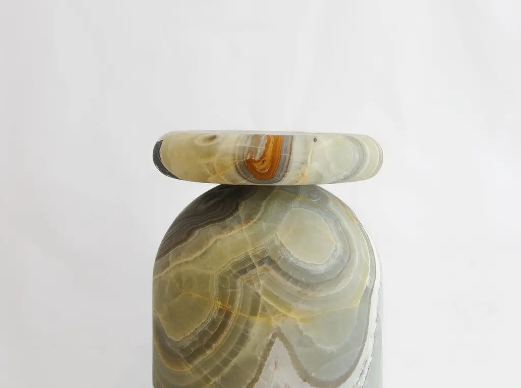 Cult stool/ side table; a hand sculpted stone from a Mexican marble and Mexican onyx conglomerate, remits to primal sculptural-architectural language while displaying materials in a modernist manner. The piece allows for the specificity of the material’s eccentric pattern formations to rein over its final appearance. Each edition; a unique piece.Working with rocks that are endemic to Mexico contextualizes the work at a geological level. Situating the pieces in a continuing and evolving historical narrative. Like taking part in an archeological exploration, working with native stones reveal a heritage of meticulous craftsmanship developed under the possibilities and limitations of local materials. When sculpting stone, you only get one chance to get things right. As each rock is different one must tailor form onto the material, in the way of discovering what each piece hides.Exhibited atEl Elogio de la Sombra- Galerie Philia: Mexico City (2024)LOVE HOUSE: New York (2023)