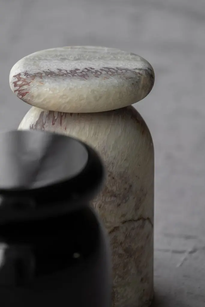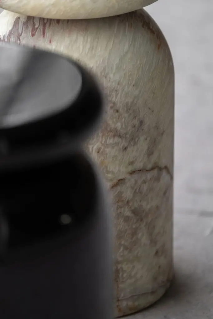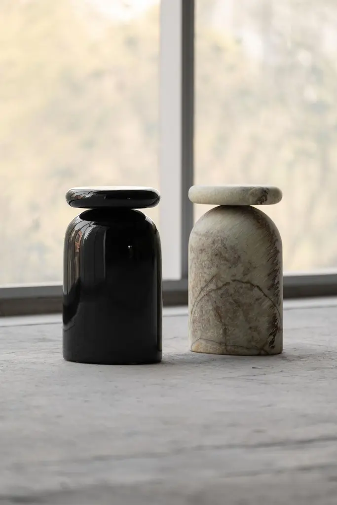 Cult stool/ side table; a hand sculpted stone from a Mexican marble and Mexican onyx conglomerate, remits to primal sculptural-architectural language while displaying materials in a modernist manner. The piece allows for the specificity of the material’s eccentric pattern formations to rein over its final appearance. Each edition; a unique piece.Working with rocks that are endemic to Mexico contextualizes the work at a geological level. Situating the pieces in a continuing and evolving historical narrative. Like taking part in an archeological exploration, working with native stones reveal a heritage of meticulous craftsmanship developed under the possibilities and limitations of local materials. When sculpting stone, you only get one chance to get things right. As each rock is different one must tailor form onto the material, in the way of discovering what each piece hides.Exhibited atEl Elogio de la Sombra- Galerie Philia: Mexico City (2024)LOVE HOUSE: New York (2023)